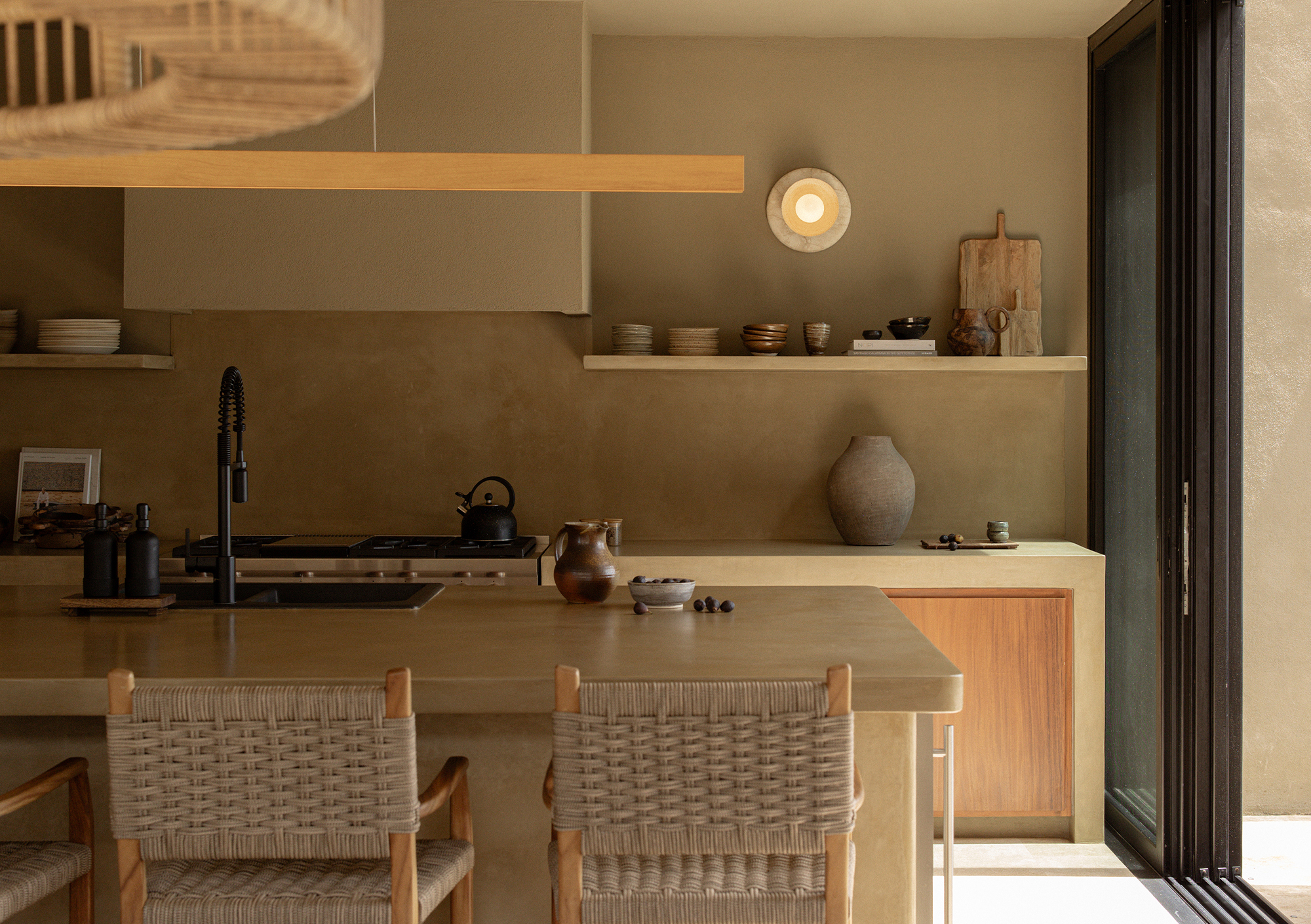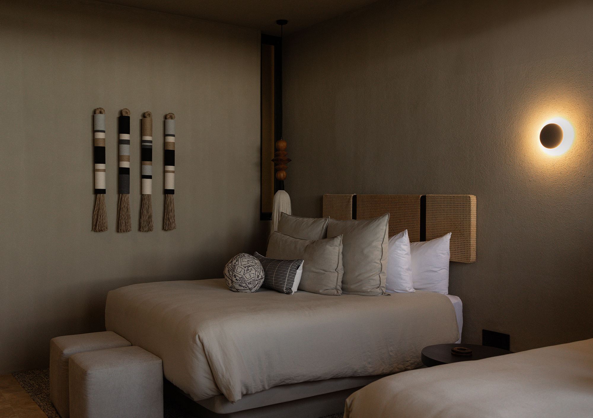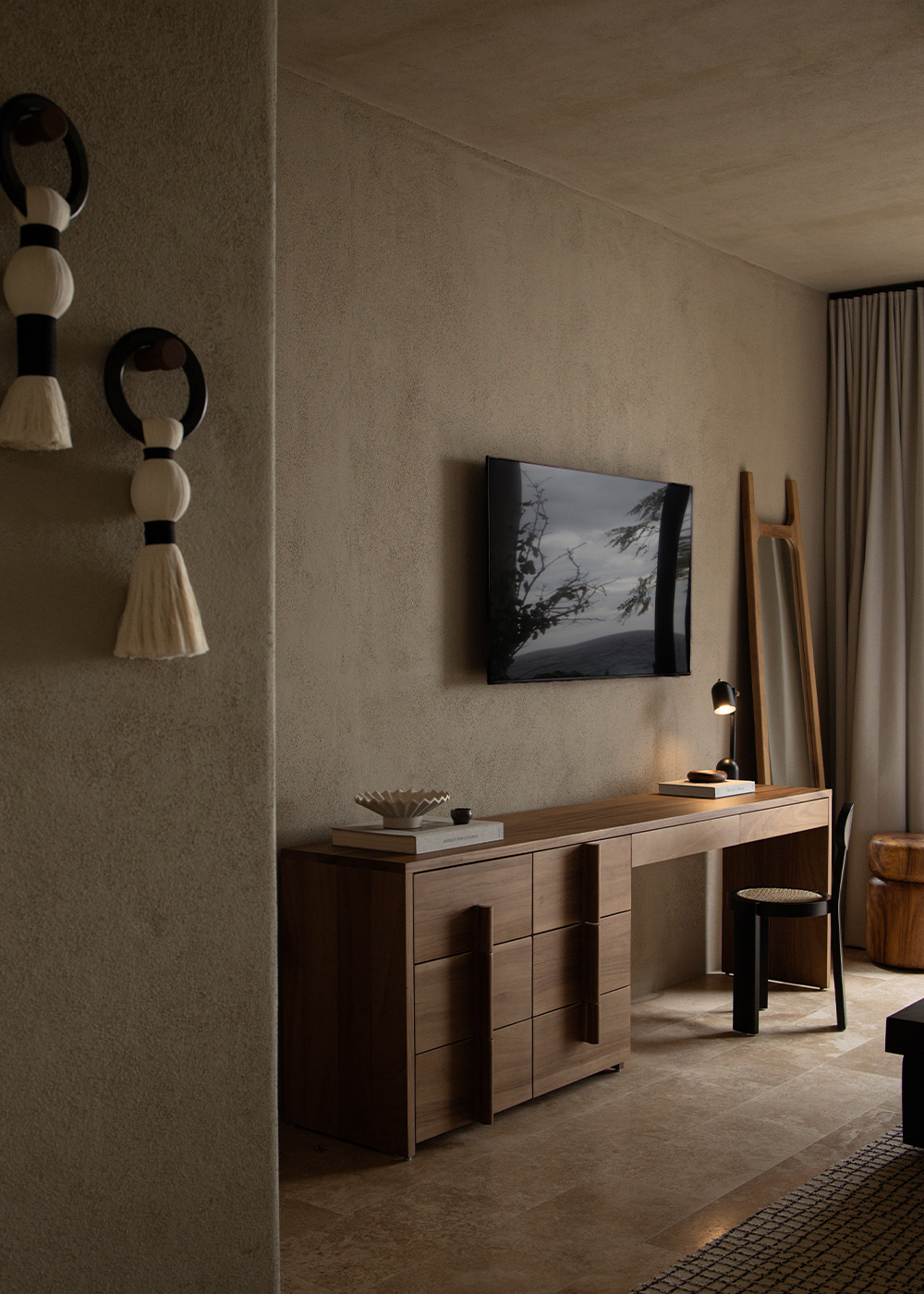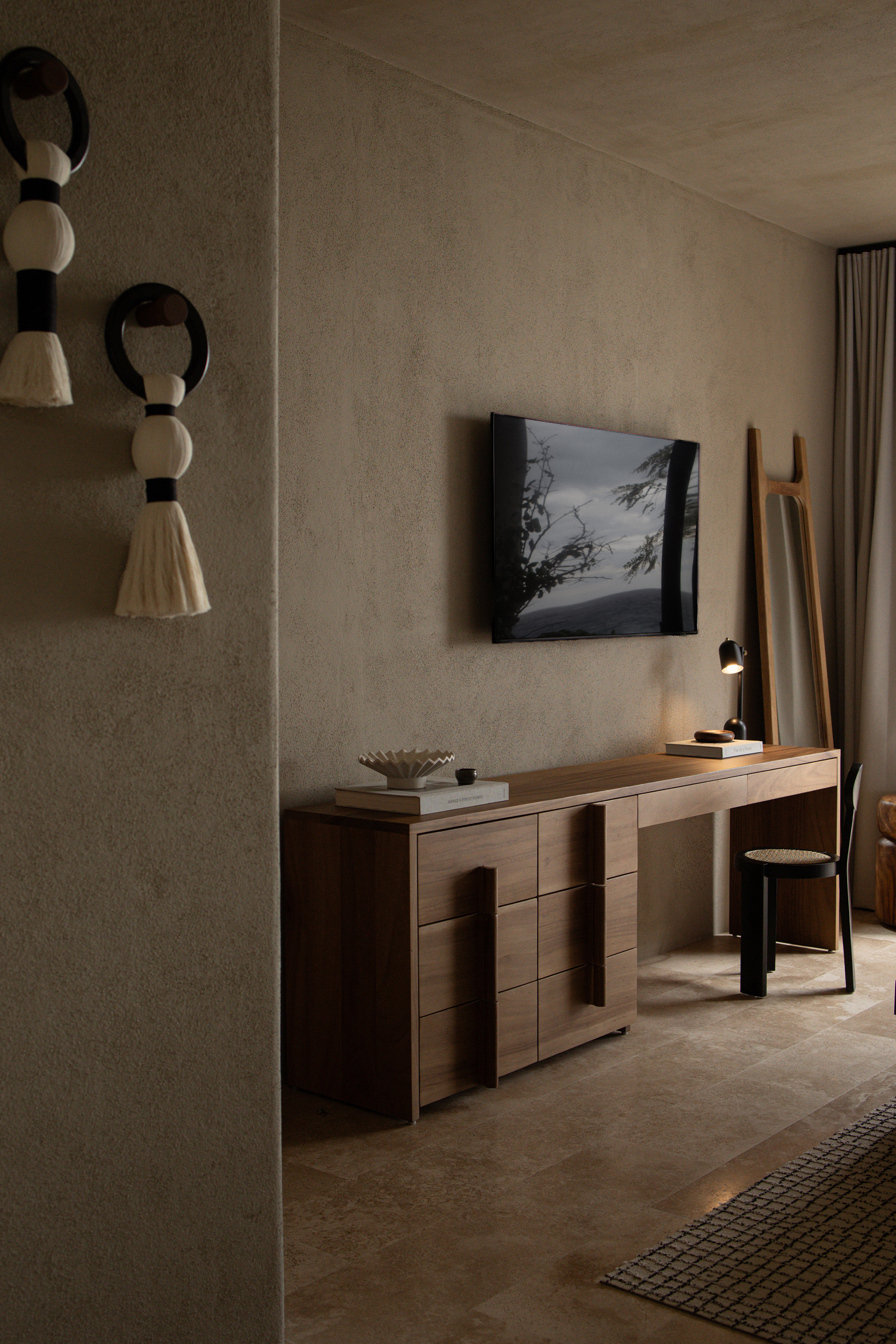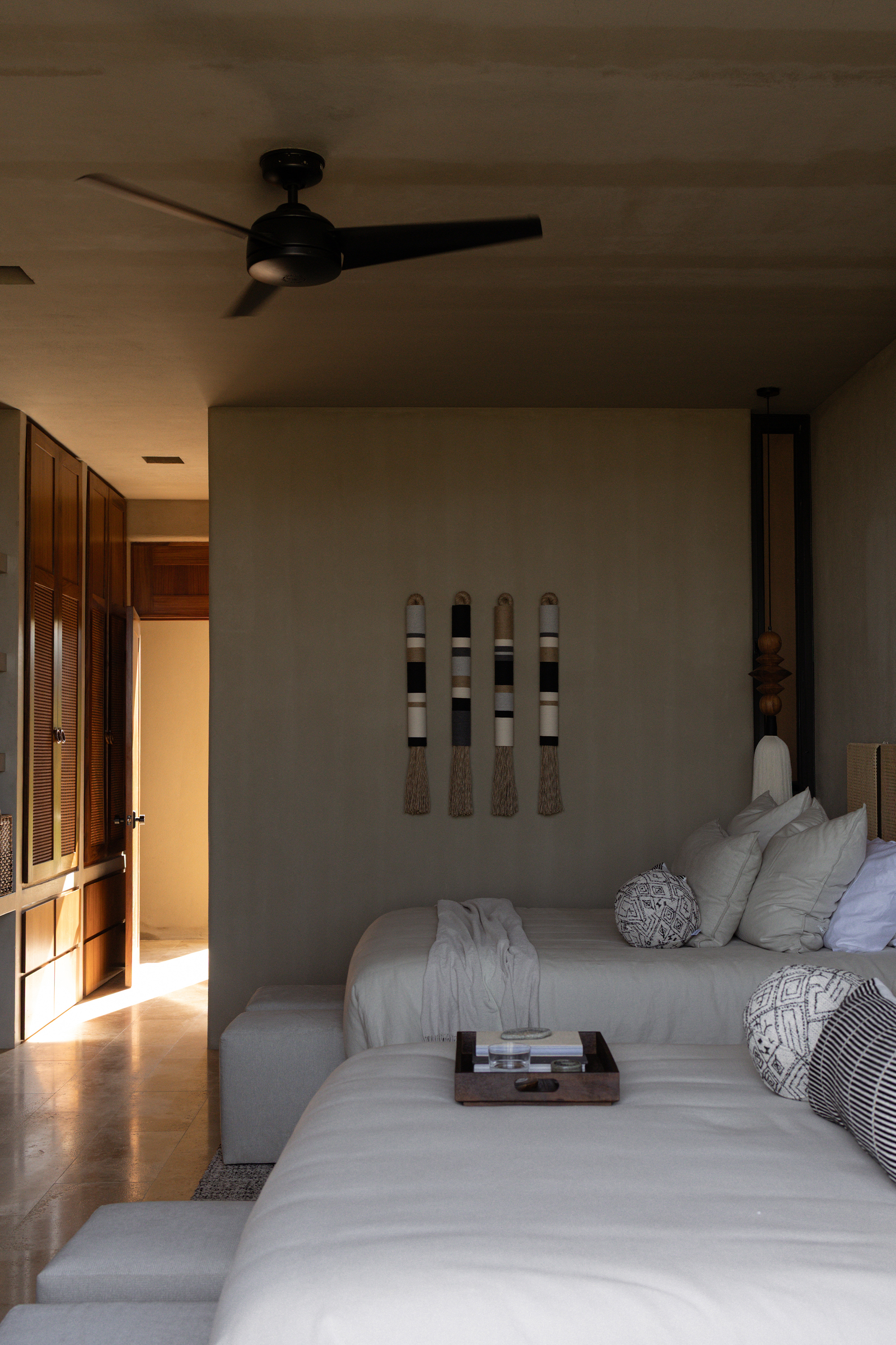 Yet Atlas goes beyond the domestic: it is also a meeting point for local farmers, fishers, and chefs—a place to exchange ingredients, knowledge, and stories. Tradition and hospitality intertwine, creating a community dynamic that enriches everyone involved. Everyday life is elevated by Mexican craft: clay vessels shaped by hand, furniture made from local woods with expressive, imperfect grain, stone lights carved by Mexican designers. Walls are adorned with woven textiles by women artisans, bringing warmth, intimacy, and timeless beauty to every space.