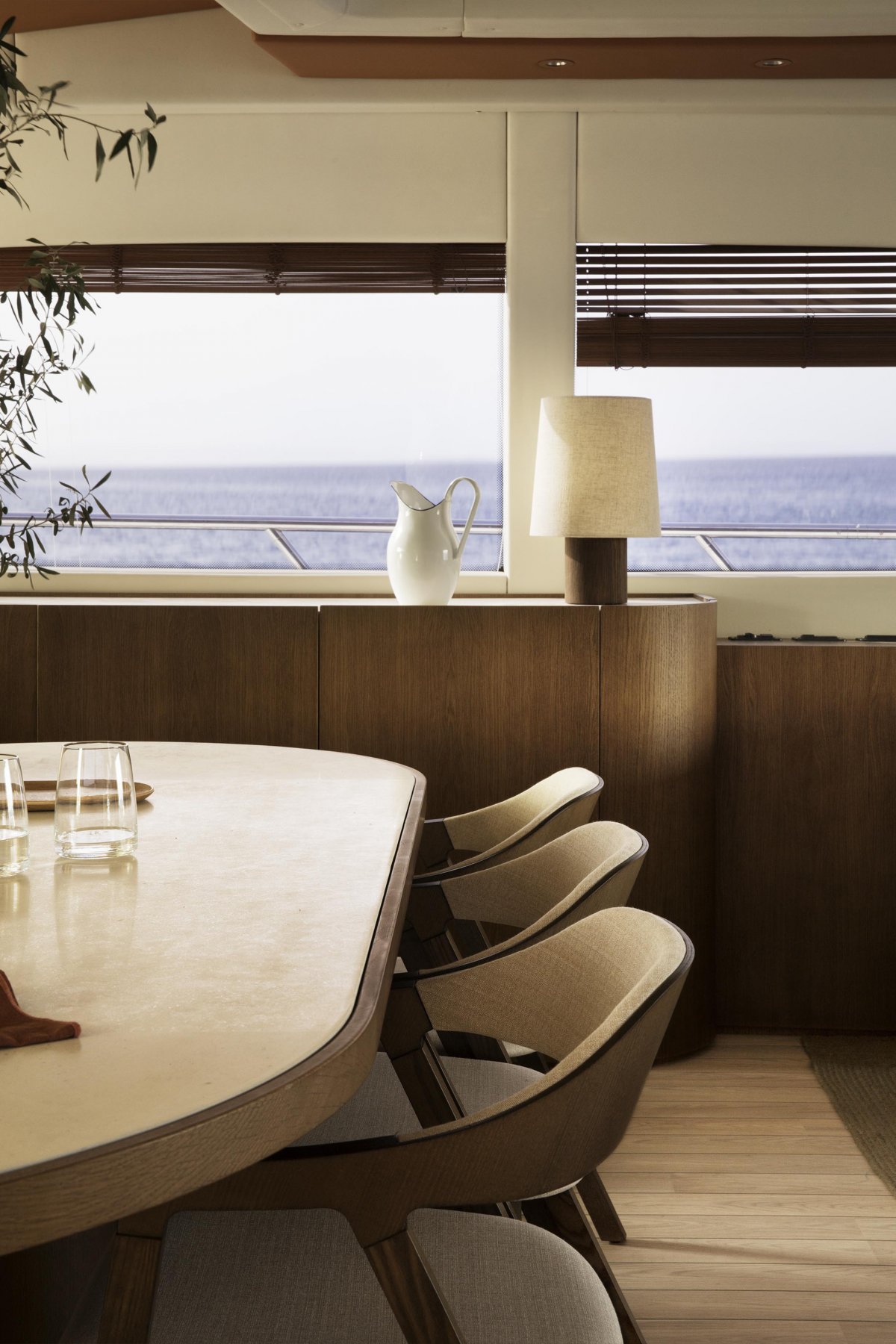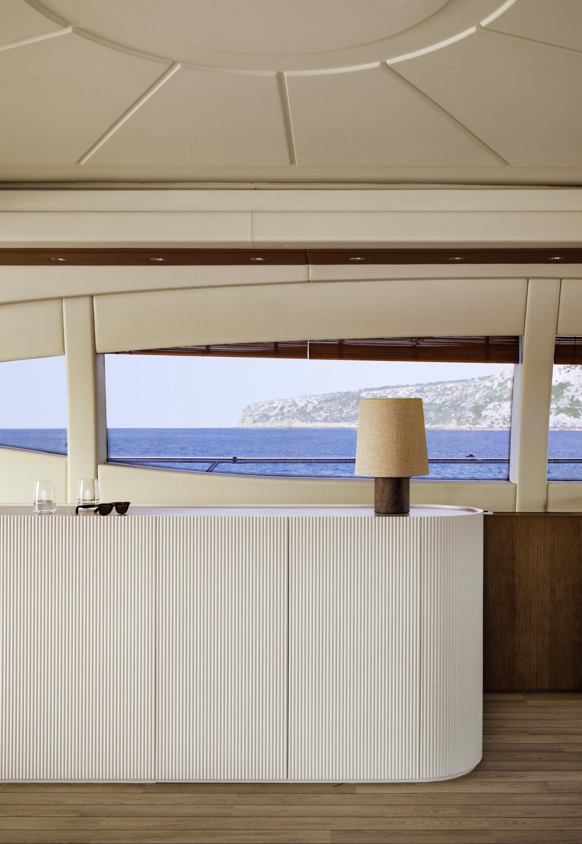 This yacht is not a heavy business atmosphere, more like a warm and relaxed home. Soft tones and smooth lines meet throughout the space, while cloth materials and luxurious bathrooms bring a hotel-like experience.