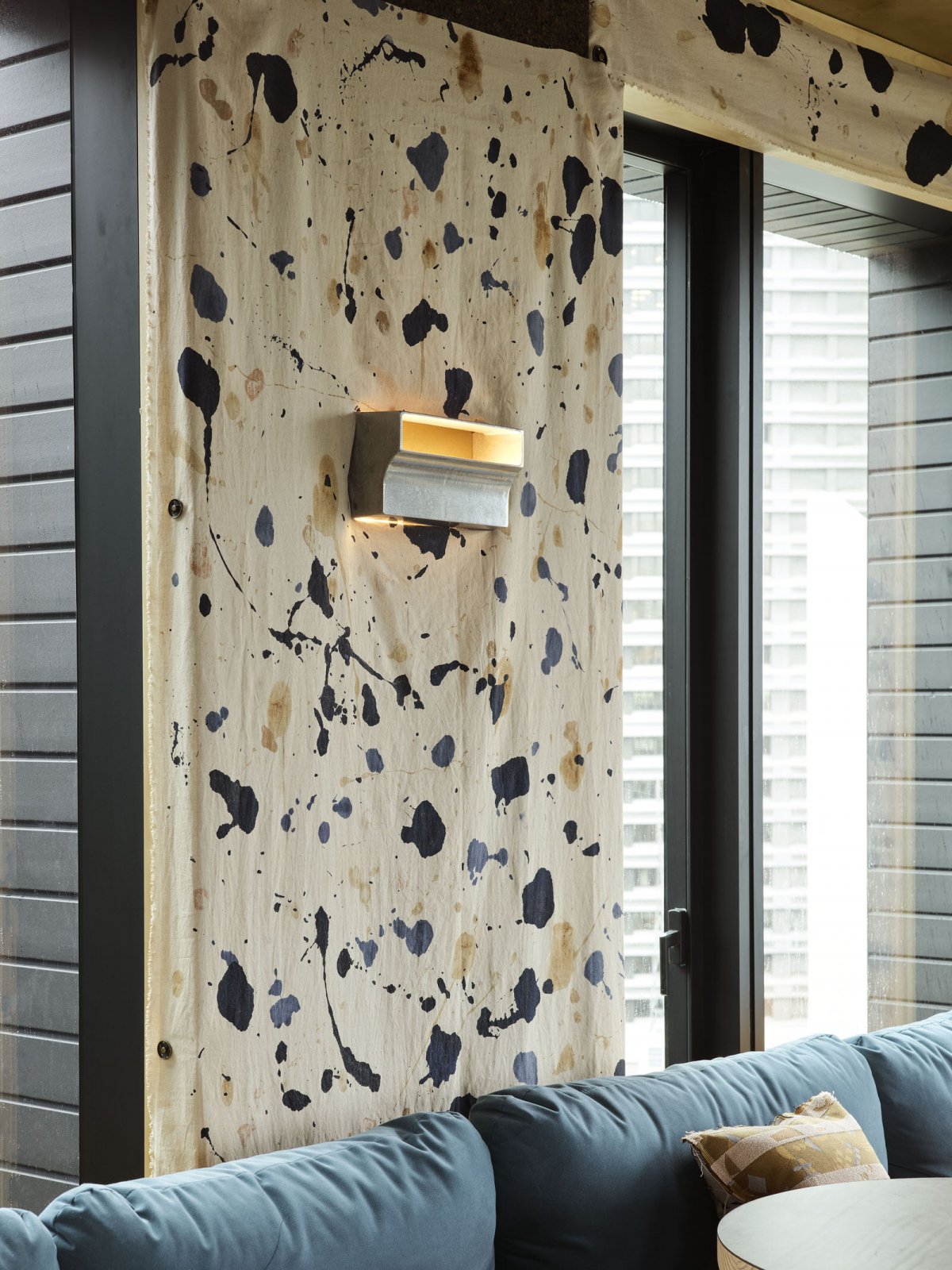 Lynch collaborated with Spacecraft Studio to create a custom hand-painted linen using pigment created from salvaged waste materials foraged from the property’s build site. This linen is used as curtains at the restaurant’s entrance, covering several of Kiln’s walls and surrounding window frames, softening and warming the space while further rooting the restaurant in its Surry Hills home.
