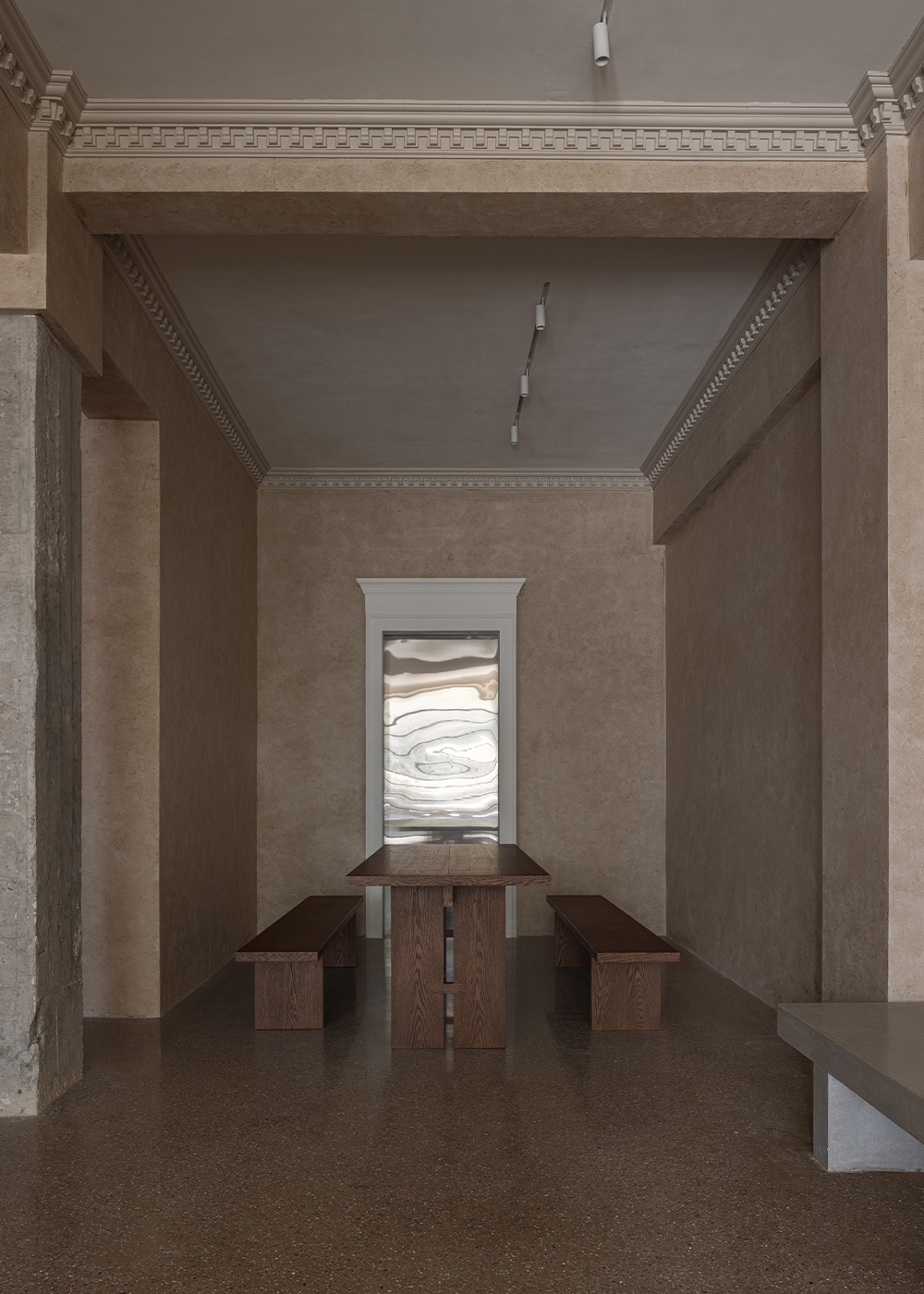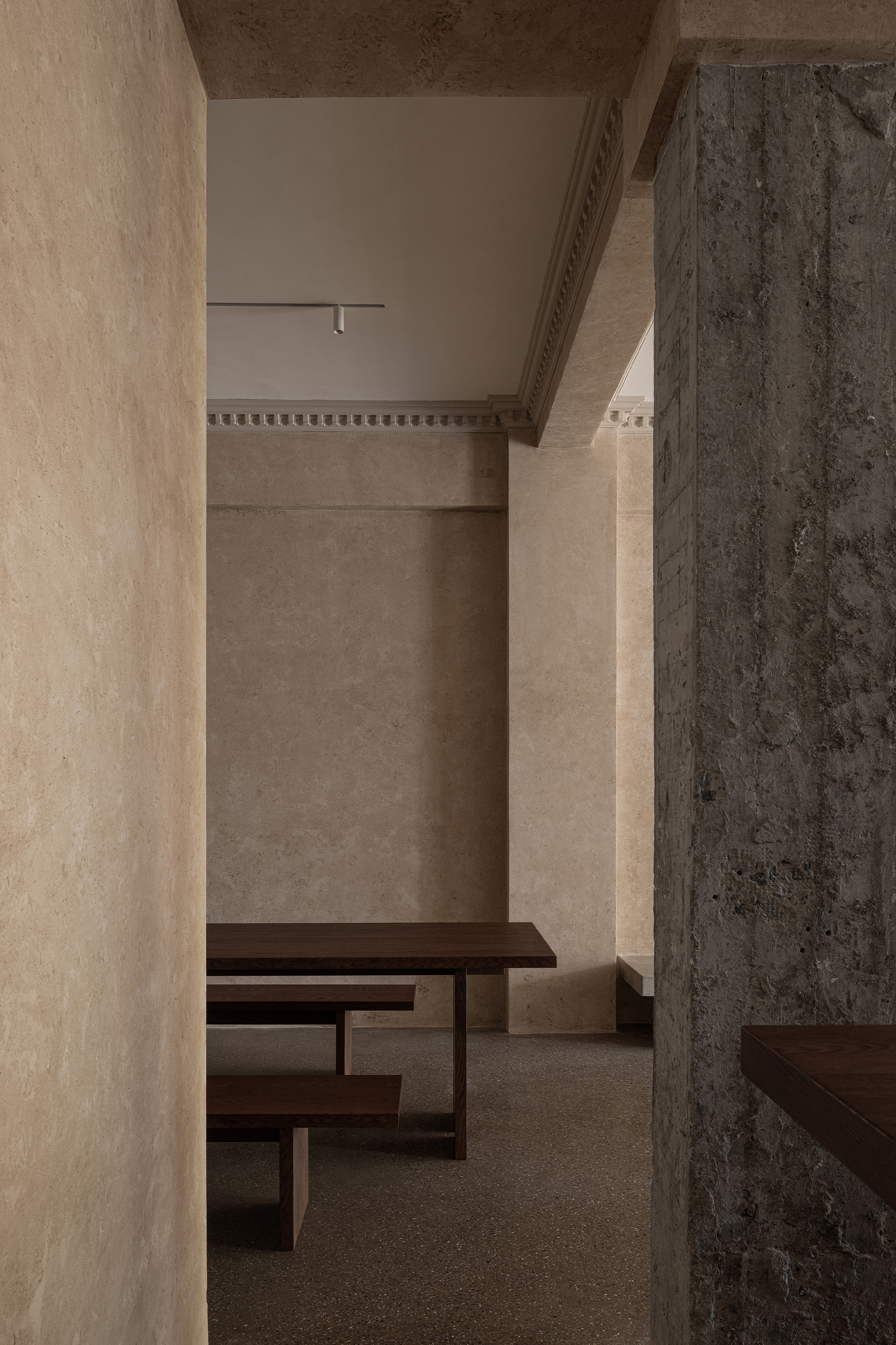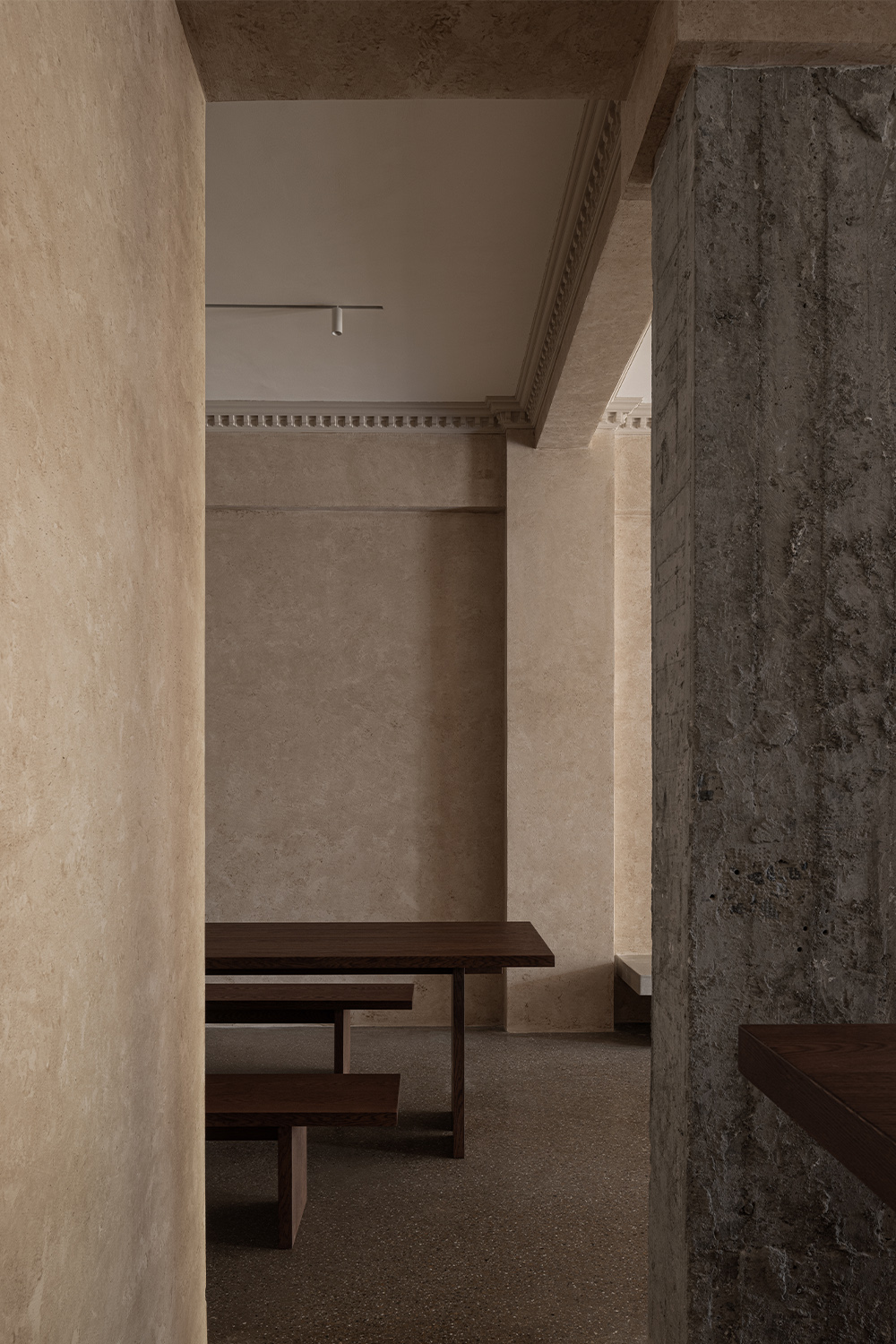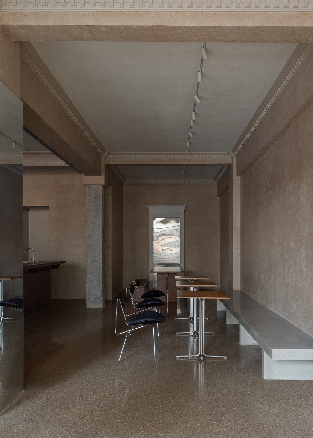 Concrete, walnut wood, distressed paint finishes, and metal are integrated into a complete structural system, incorporating vintage and intricate carvings. Behind the rough-hewn appearance lies a rational spatial entity that subtly hints at a warm and poetic existence, offering a genuine tactile experience. The exterior of the column is wrapped in a mirror-like finish, extending the sense of space scattering in all directions, making it appear more transparent and spacious. As natural light gradually fades away with time, precise and restrained artificial light brings a high-concentration emotional atmosphere to the space, exhibiting diverse expressions at different times, aiming to break natural laws and trigger individual creativity.