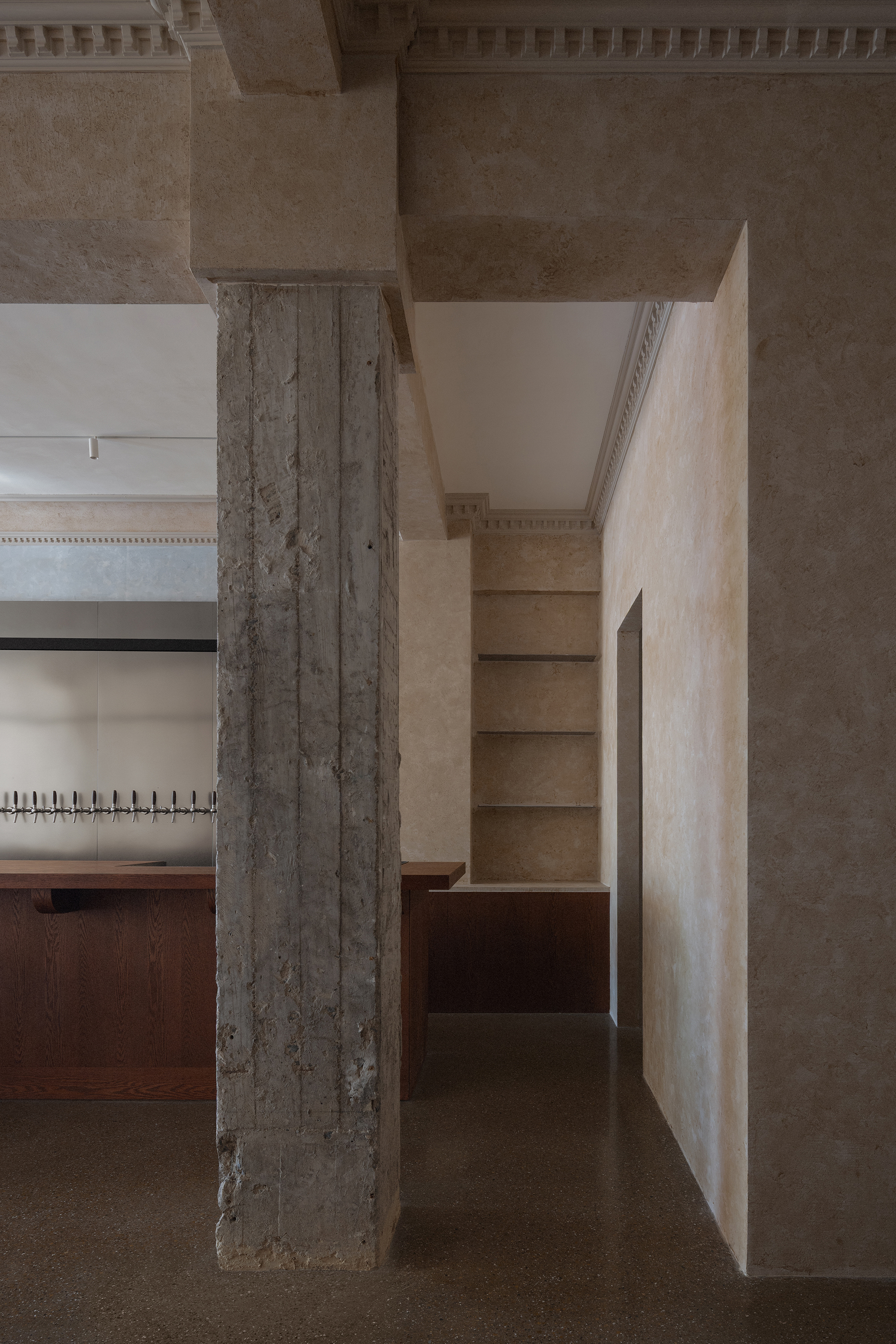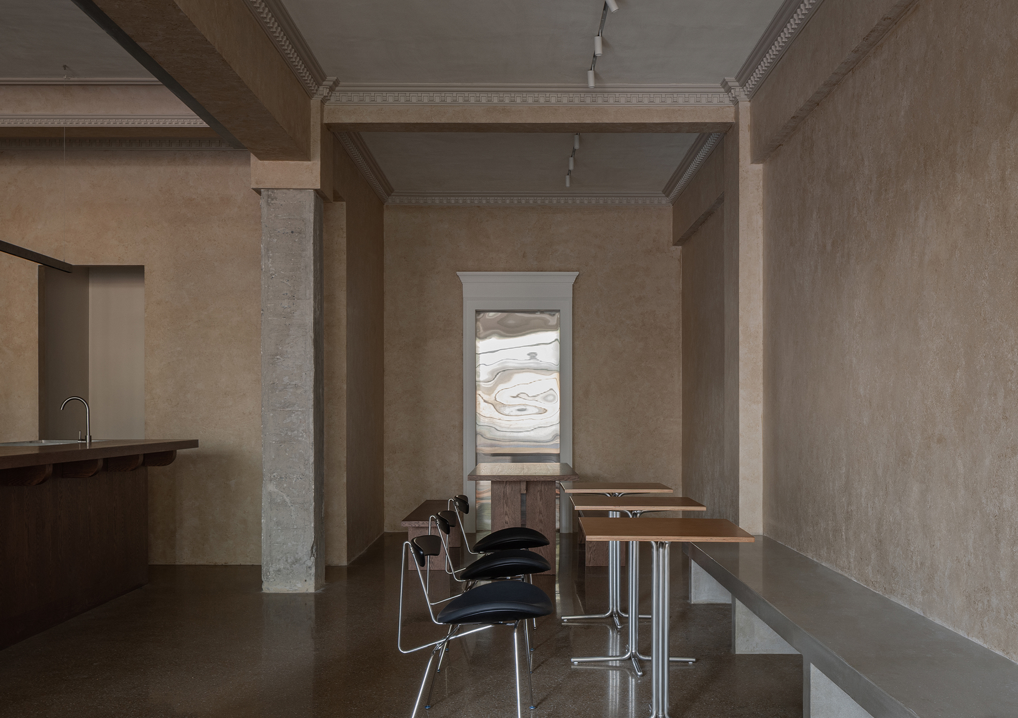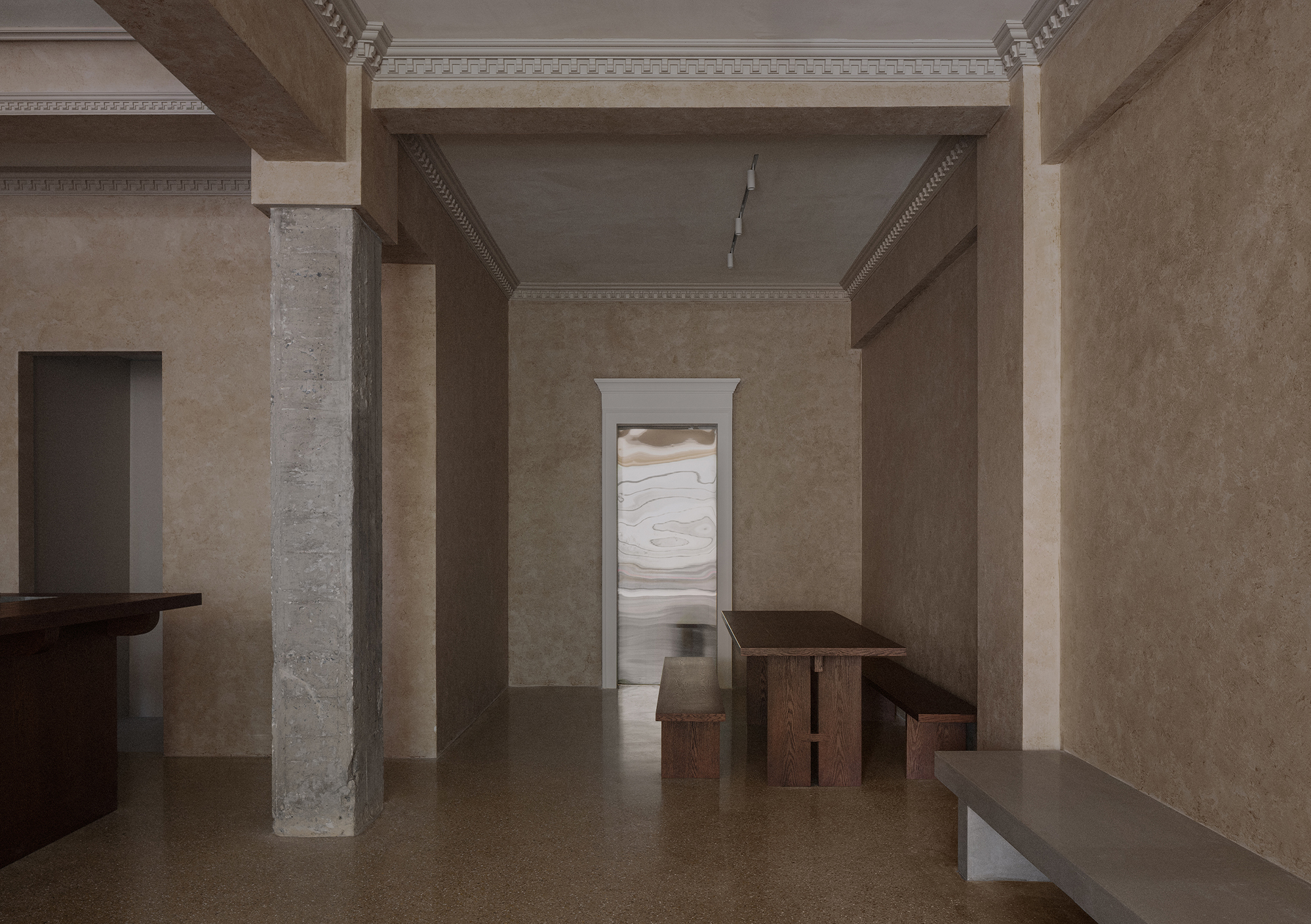 Concrete, walnut wood, distressed paint finishes, and metal are integrated into a complete structural system, incorporating vintage and intricate carvings. Behind the rough-hewn appearance lies a rational spatial entity that subtly hints at a warm and poetic existence, offering a genuine tactile experience. The exterior of the column is wrapped in a mirror-like finish, extending the sense of space scattering in all directions, making it appear more transparent and spacious. As natural light gradually fades away with time, precise and restrained artificial light brings a high-concentration emotional atmosphere to the space, exhibiting diverse expressions at different times, aiming to break natural laws and trigger individual creativity.