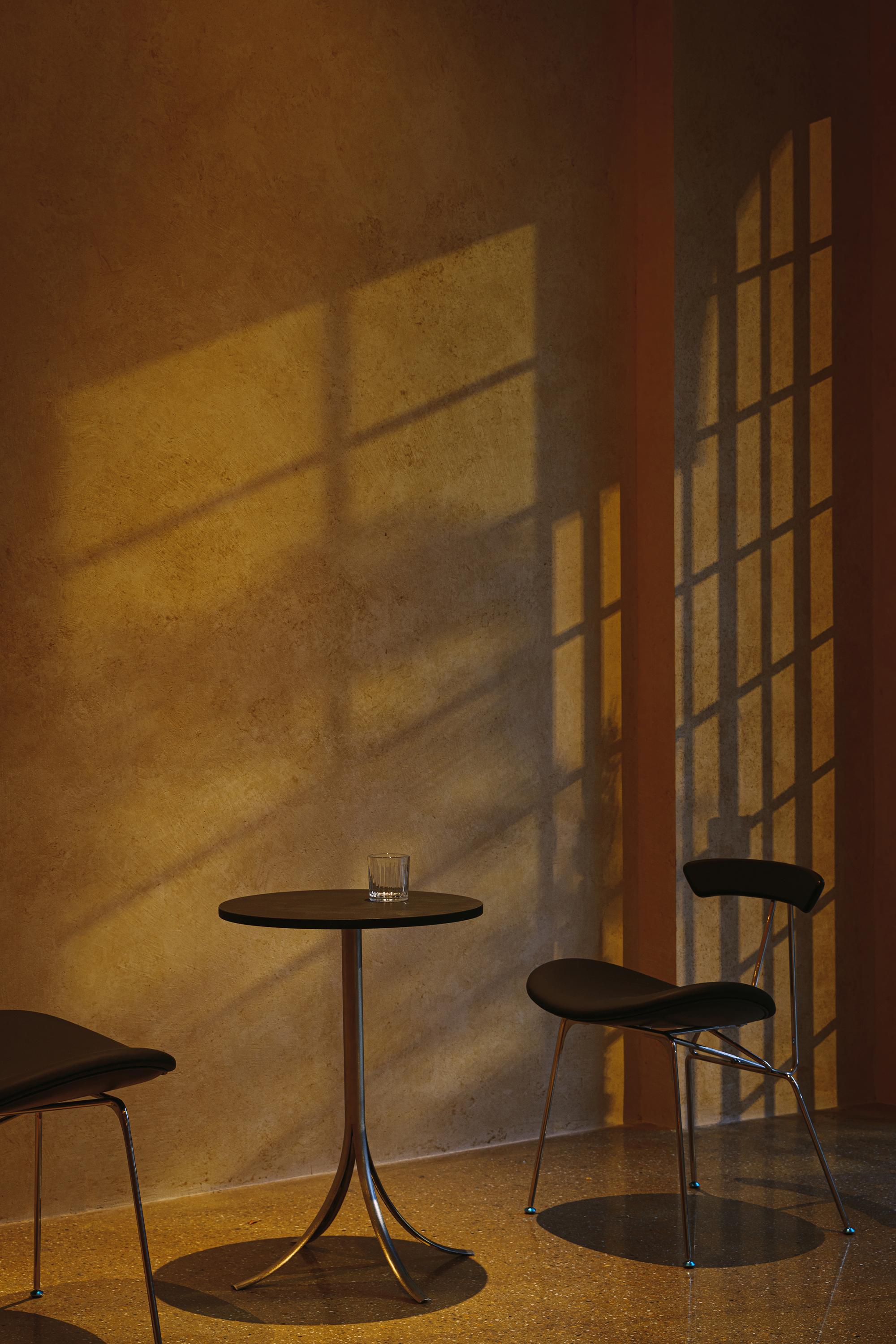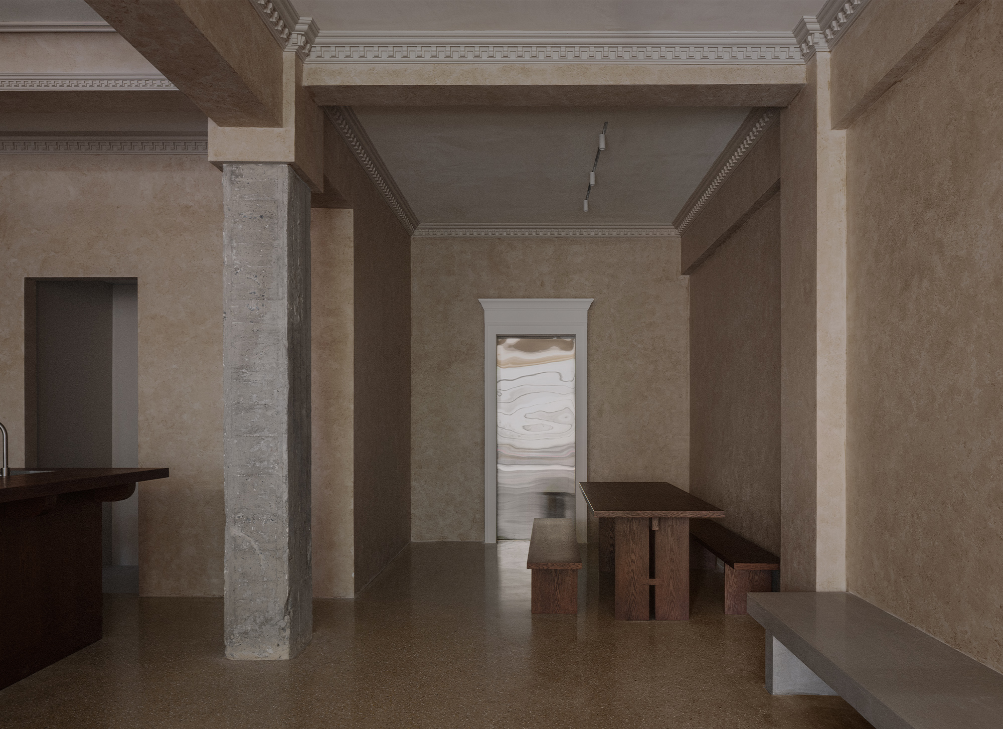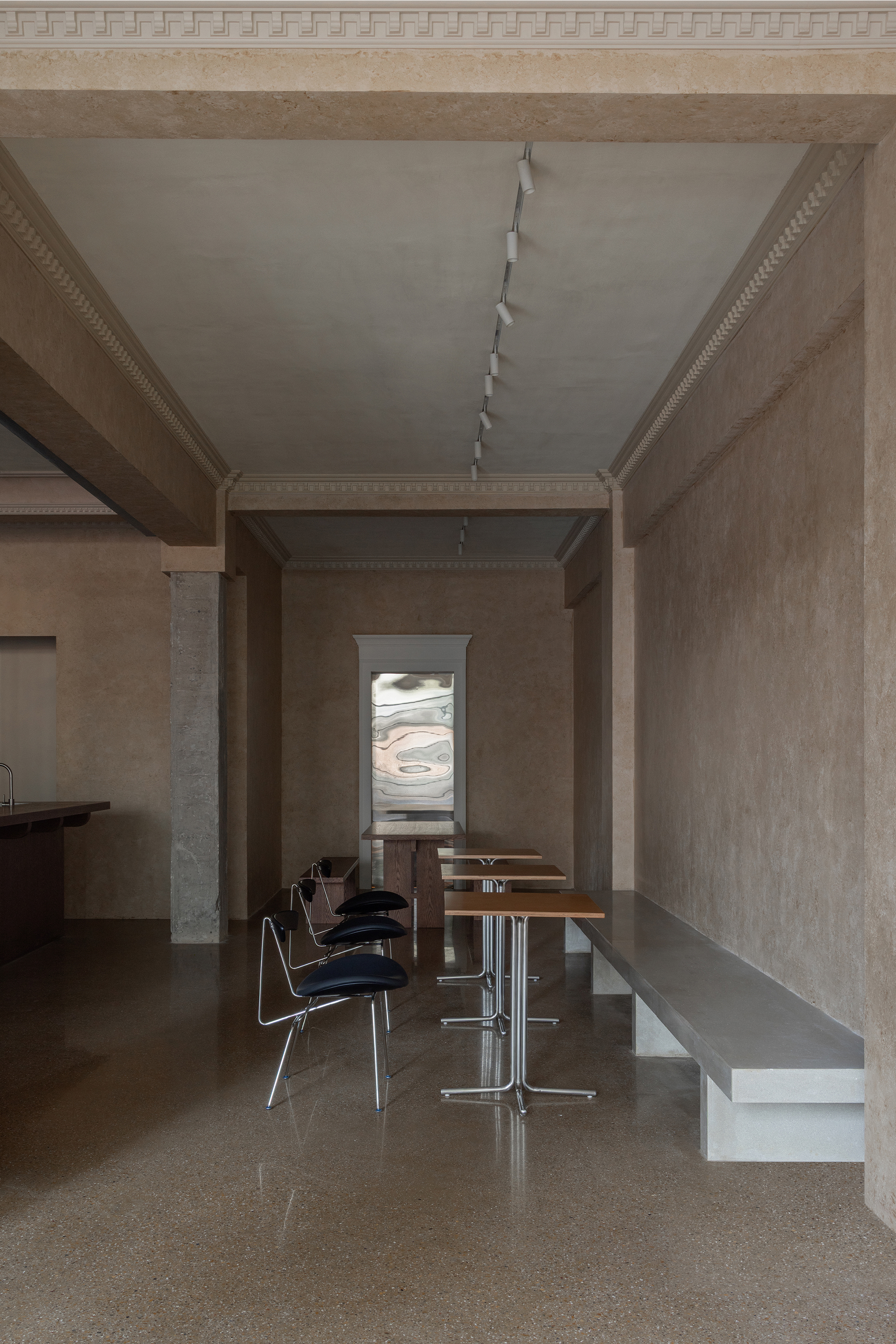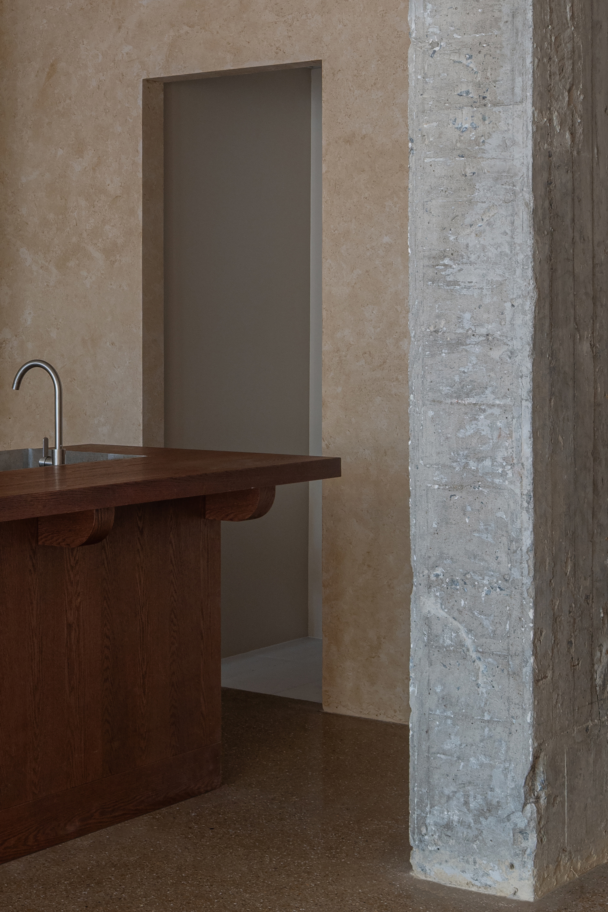 Concrete, walnut wood, distressed paint finishes, and metal are integrated into a complete structural system, incorporating vintage and intricate carvings. Behind the rough-hewn appearance lies a rational spatial entity that subtly hints at a warm and poetic existence, offering a genuine tactile experience. The exterior of the column is wrapped in a mirror-like finish, extending the sense of space scattering in all directions, making it appear more transparent and spacious. As natural light gradually fades away with time, precise and restrained artificial light brings a high-concentration emotional atmosphere to the space, exhibiting diverse expressions at different times, aiming to break natural laws and trigger individual creativity.