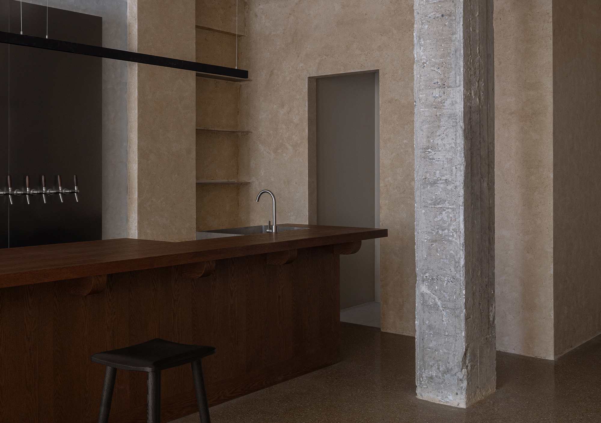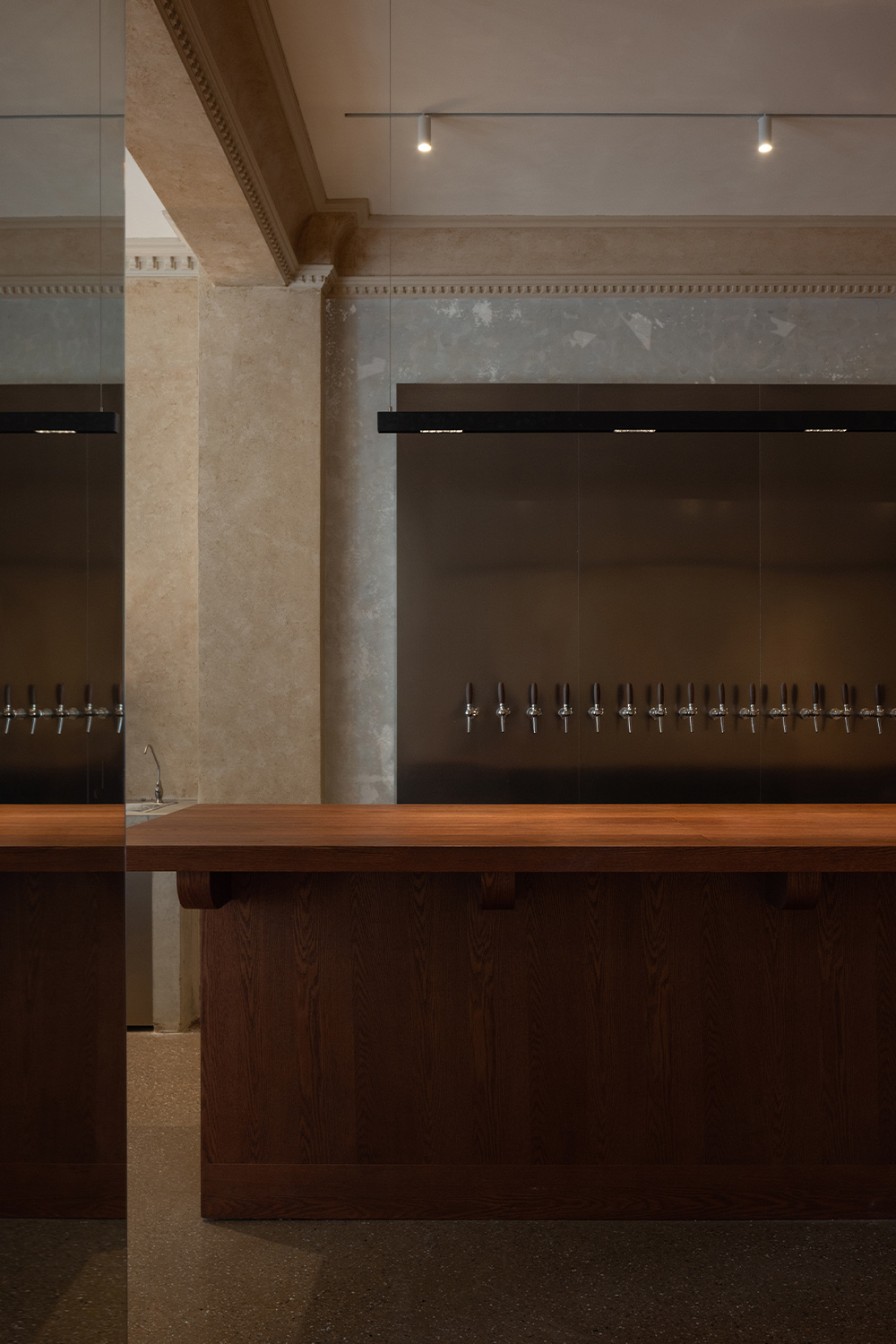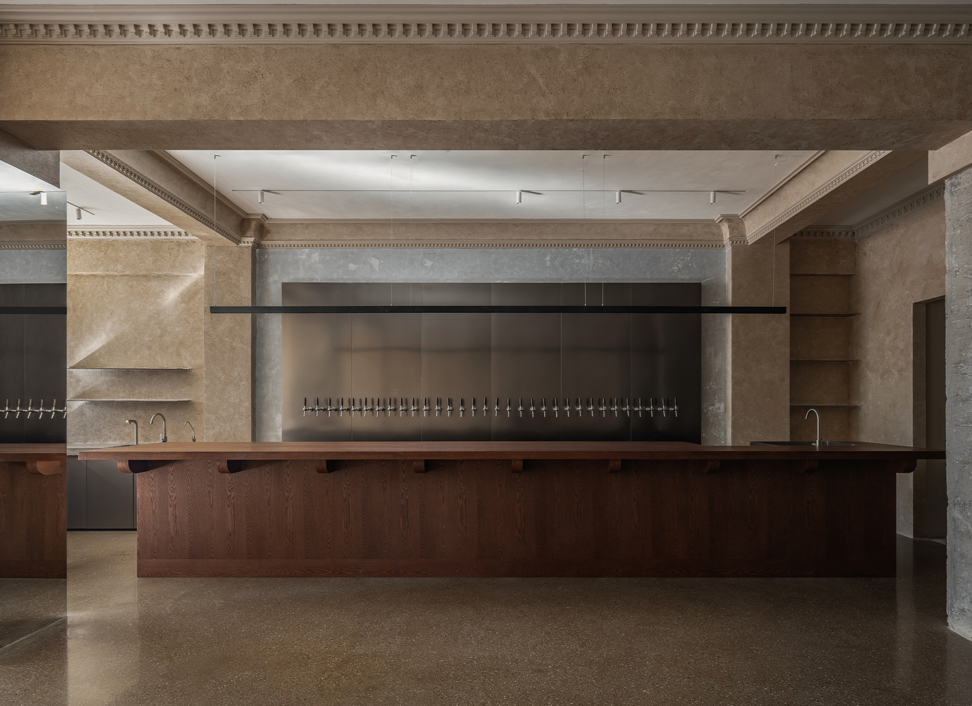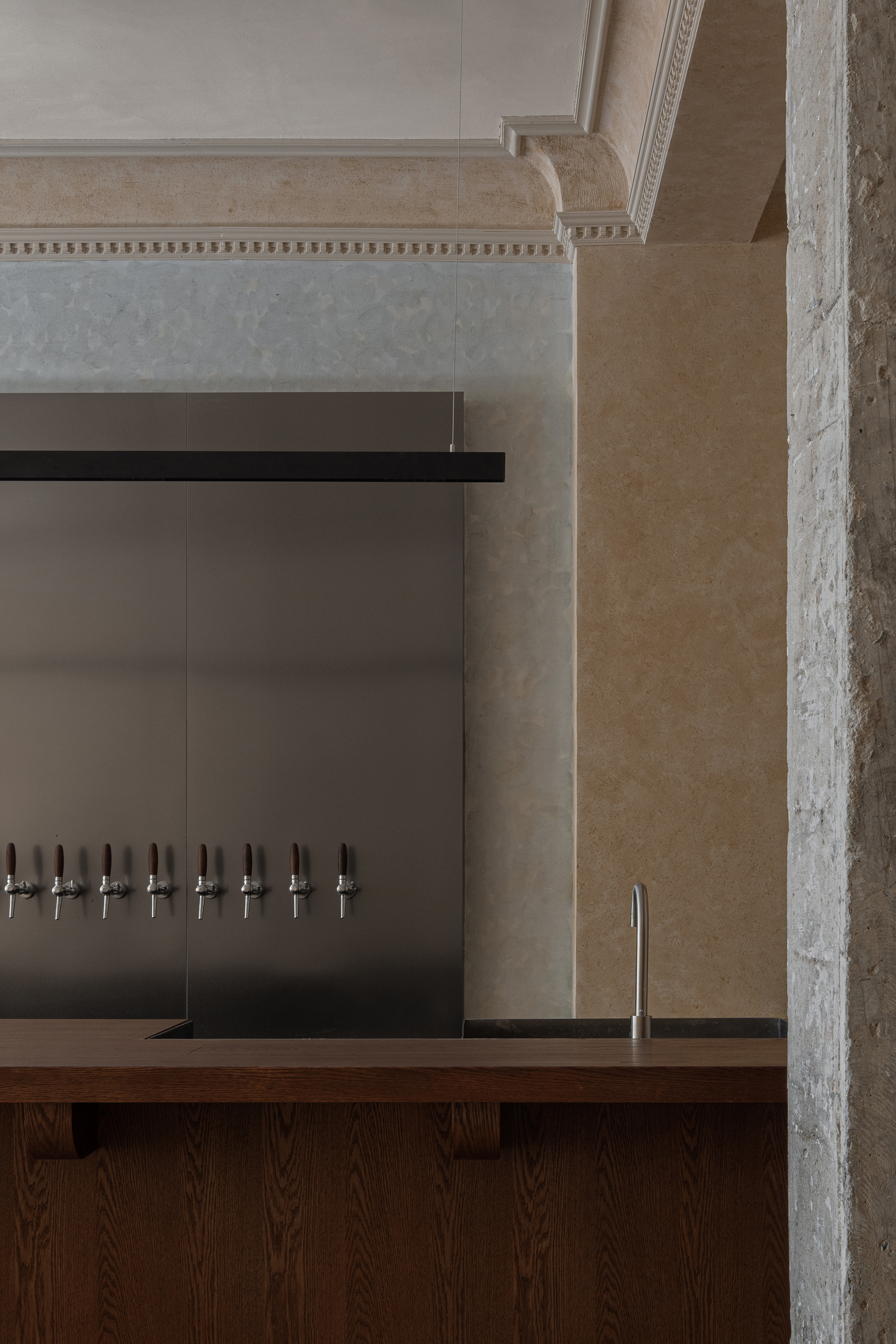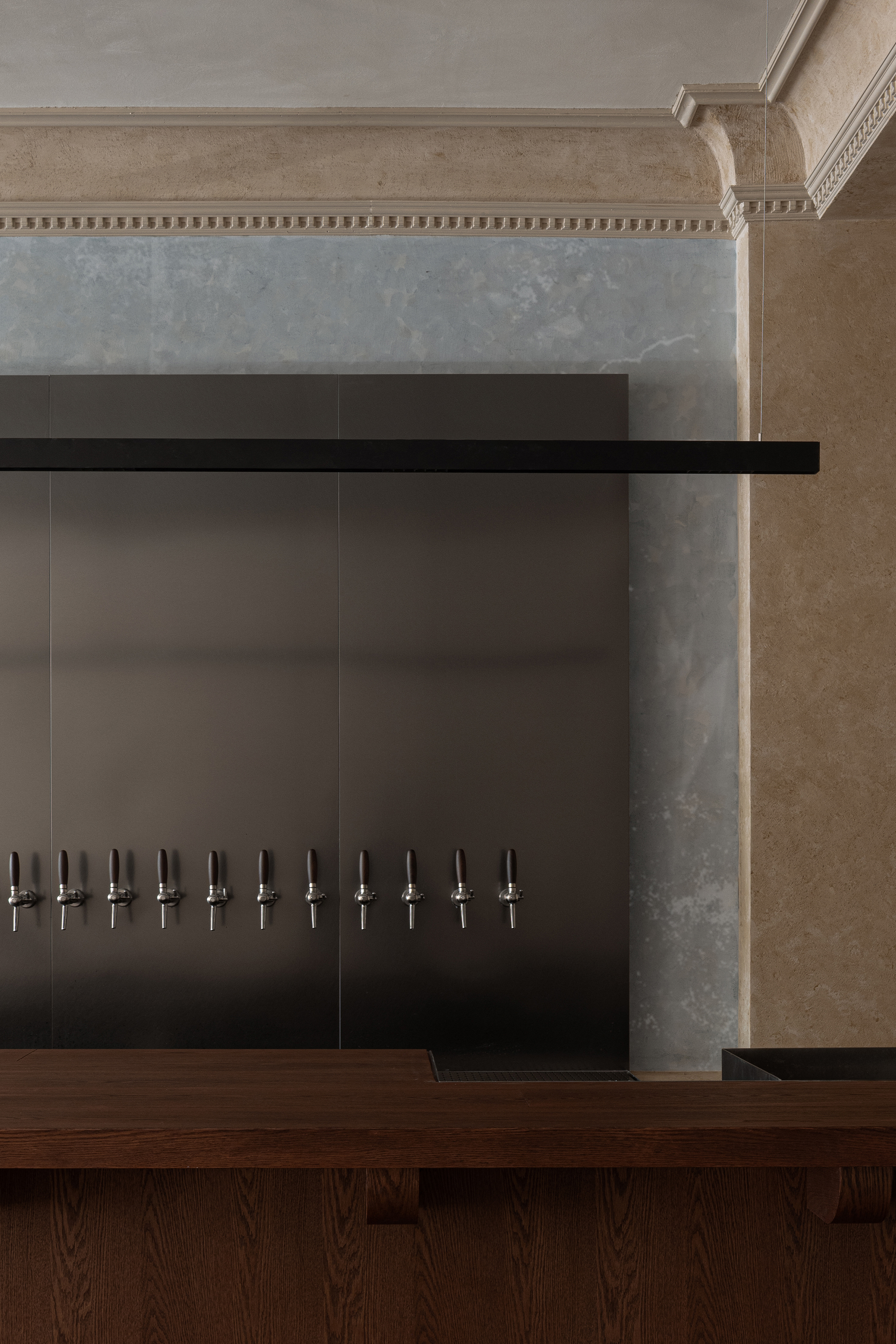 Light, coming from the Middle Ages. Allowing spacetime to undergo deformation with the intention of detaching reality. Cave_in, a craft beer bar located in Hangzhou, was founded by its owner who returned from studying in the UK. It continues the popular "day coffee, night wine" trend among contemporary young people. The space draws inspiration from the brand's concept of "collapse and depression", using it as an index for form construction, connecting people with the initial form of space, and visually presenting the timeline, positioned between virtuality and reality, fulfilling the concept of infinite expansion of time and space. Designer adds a layer of more empathetic perception to this "alternative world" creation. Italian classicism is integrated into the layered construction of the frame, shape, and texture, presenting a minimalist, nude aesthetic, and planning the interweaving of vintage and modernity in a gentle manner.