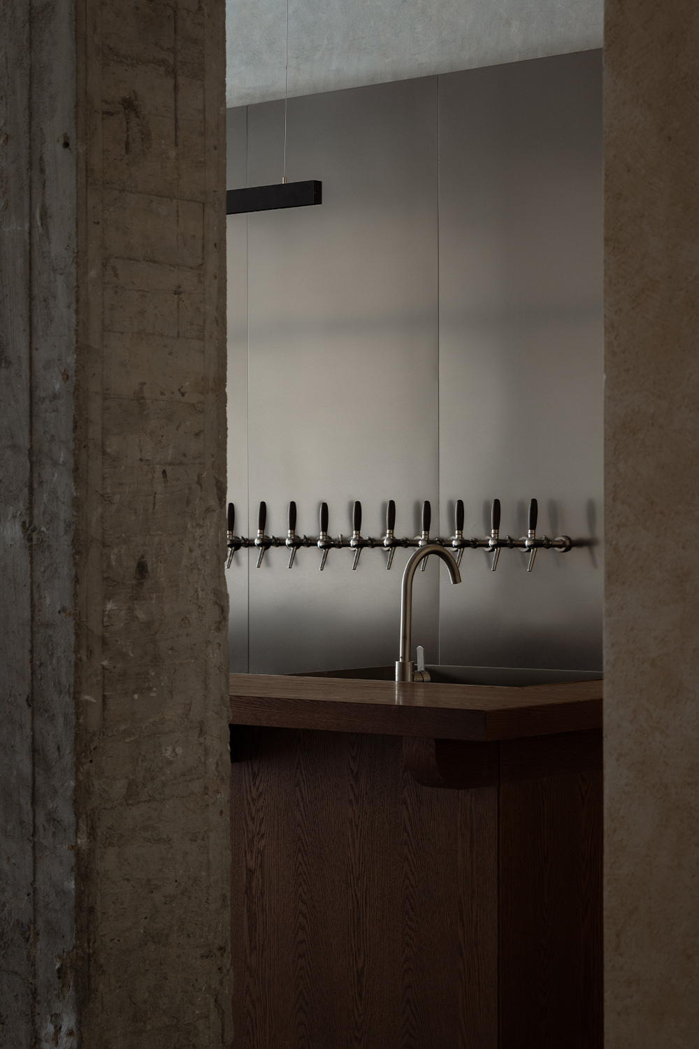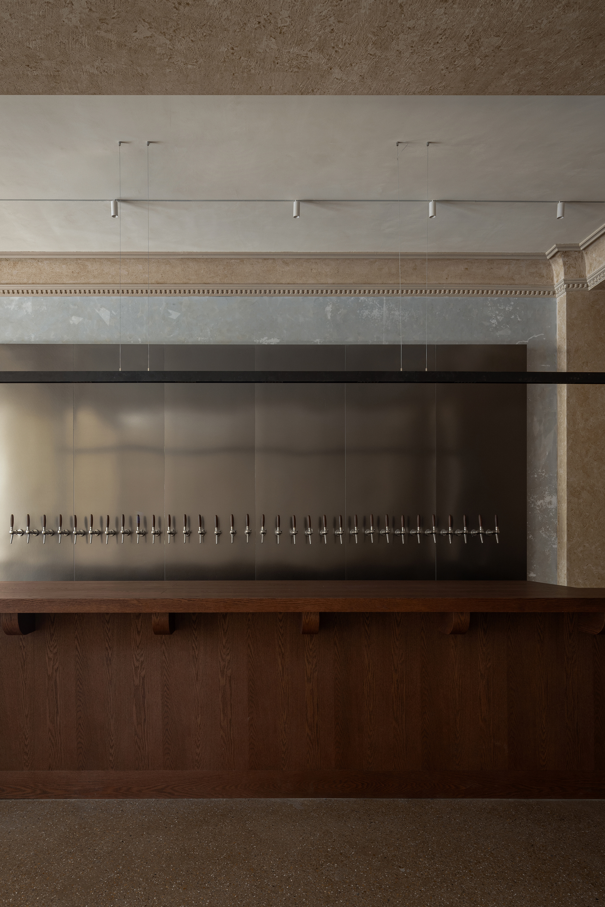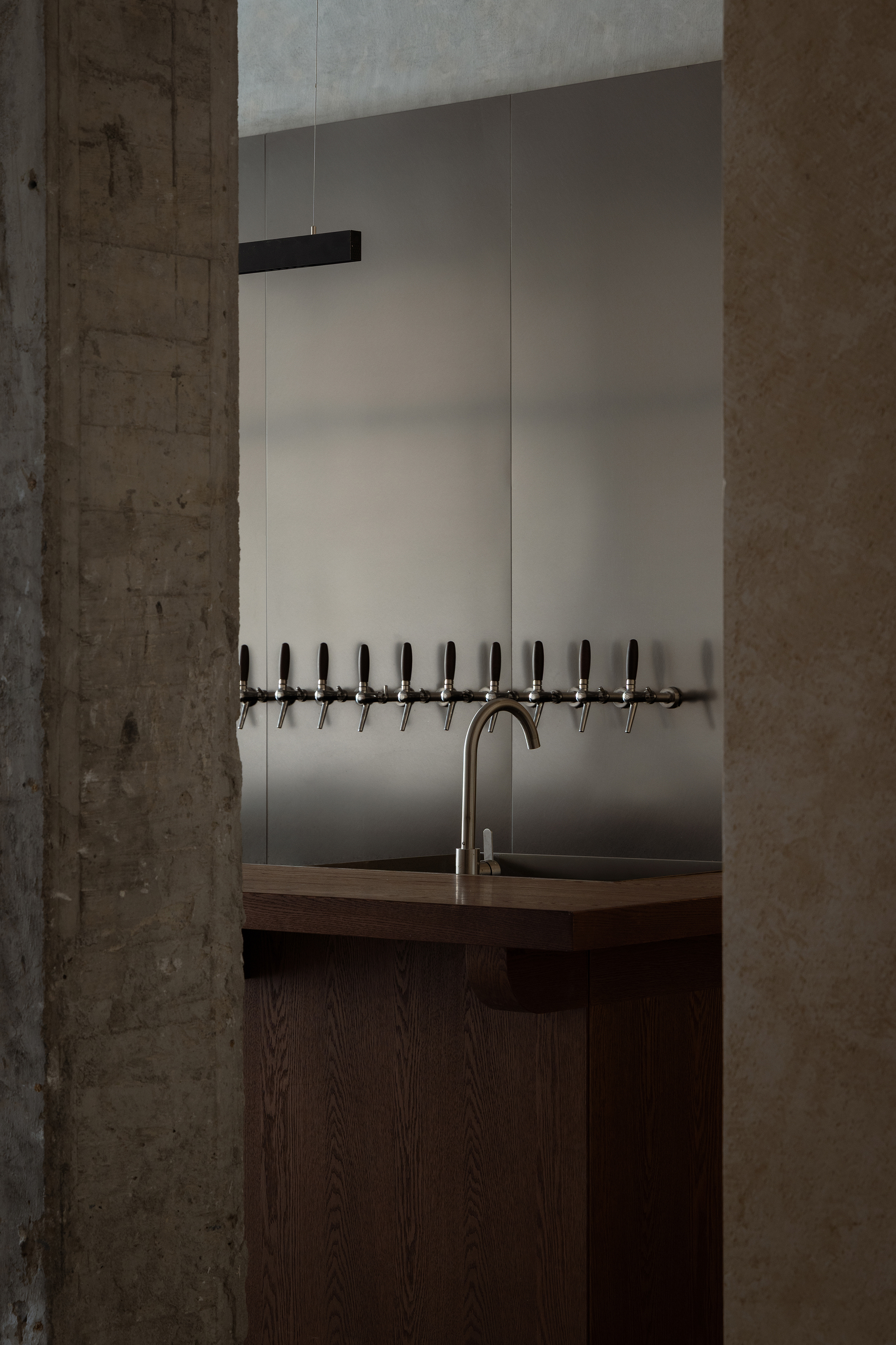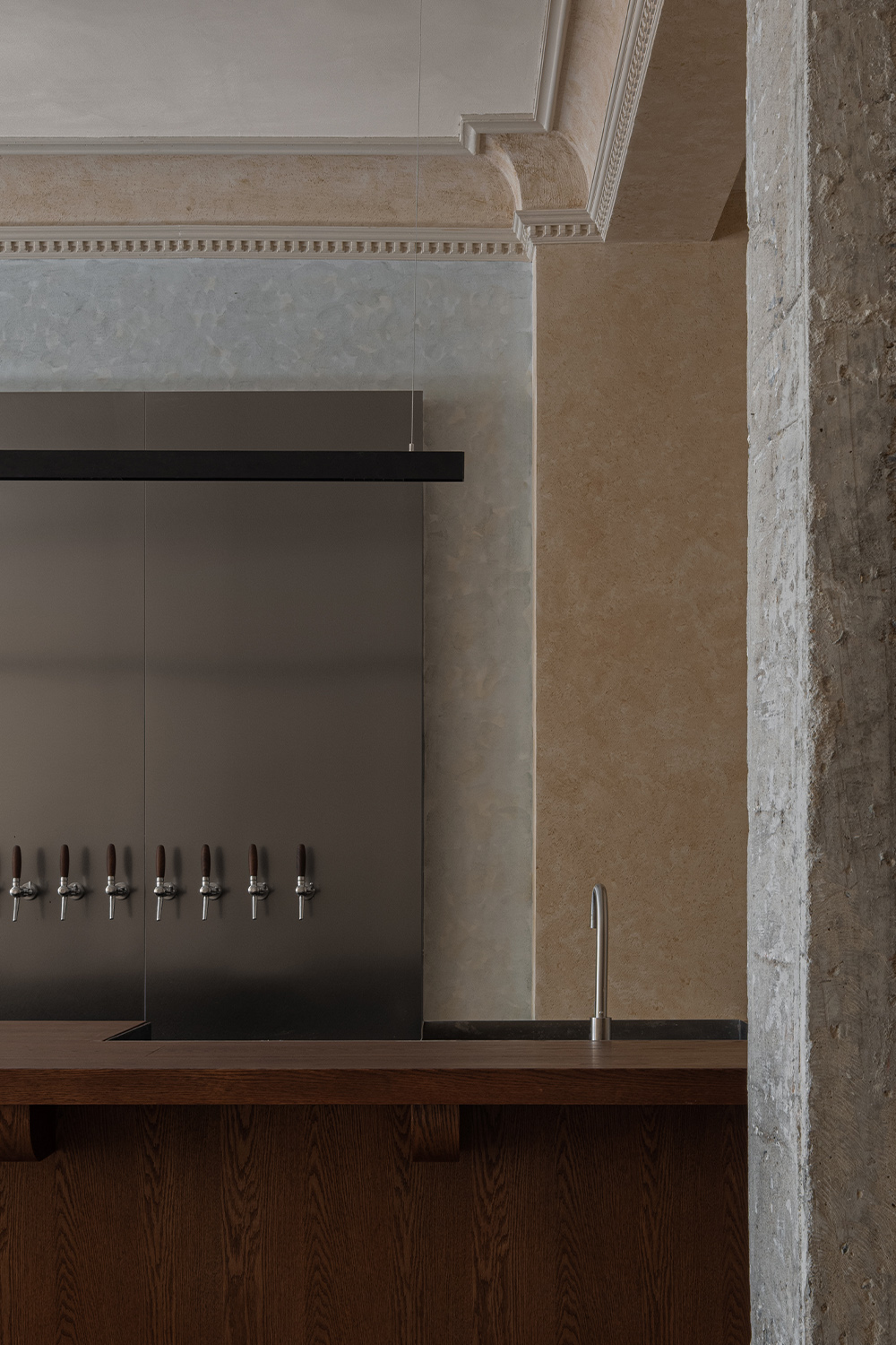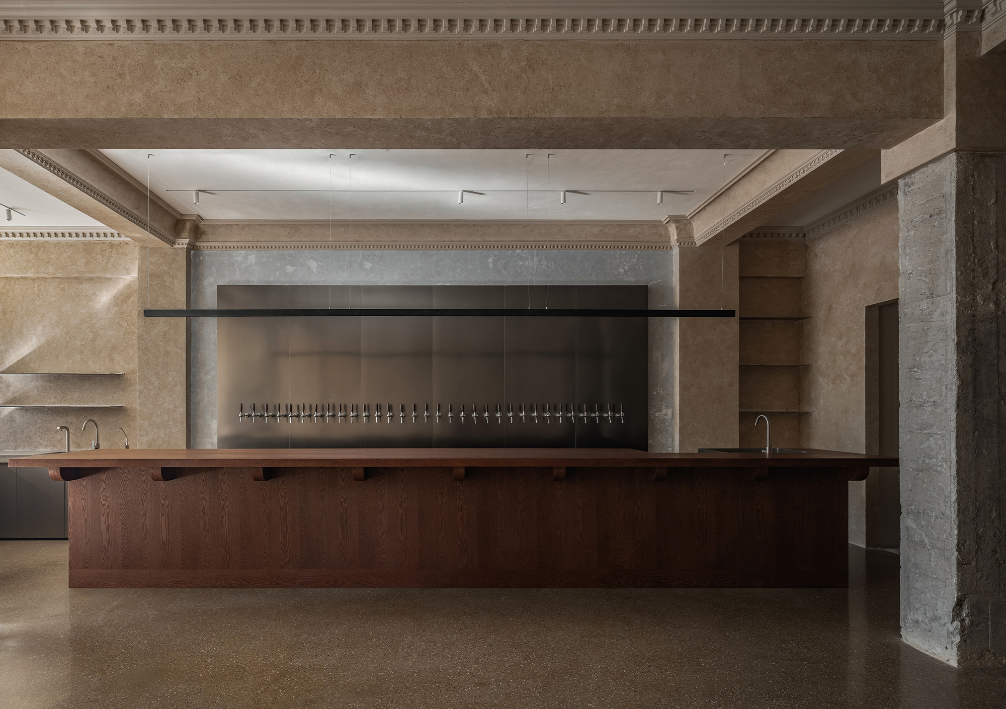 Light, coming from the Middle Ages. Allowing spacetime to undergo deformation with the intention of detaching reality. Cave_in, a craft beer bar located in Hangzhou, was founded by its owner who returned from studying in the UK. It continues the popular "day coffee, night wine" trend among contemporary young people. The space draws inspiration from the brand's concept of "collapse and depression", using it as an index for form construction, connecting people with the initial form of space, and visually presenting the timeline, positioned between virtuality and reality, fulfilling the concept of infinite expansion of time and space. Designer adds a layer of more empathetic perception to this "alternative world" creation. Italian classicism is integrated into the layered construction of the frame, shape, and texture, presenting a minimalist, nude aesthetic, and planning the interweaving of vintage and modernity in a gentle manner.