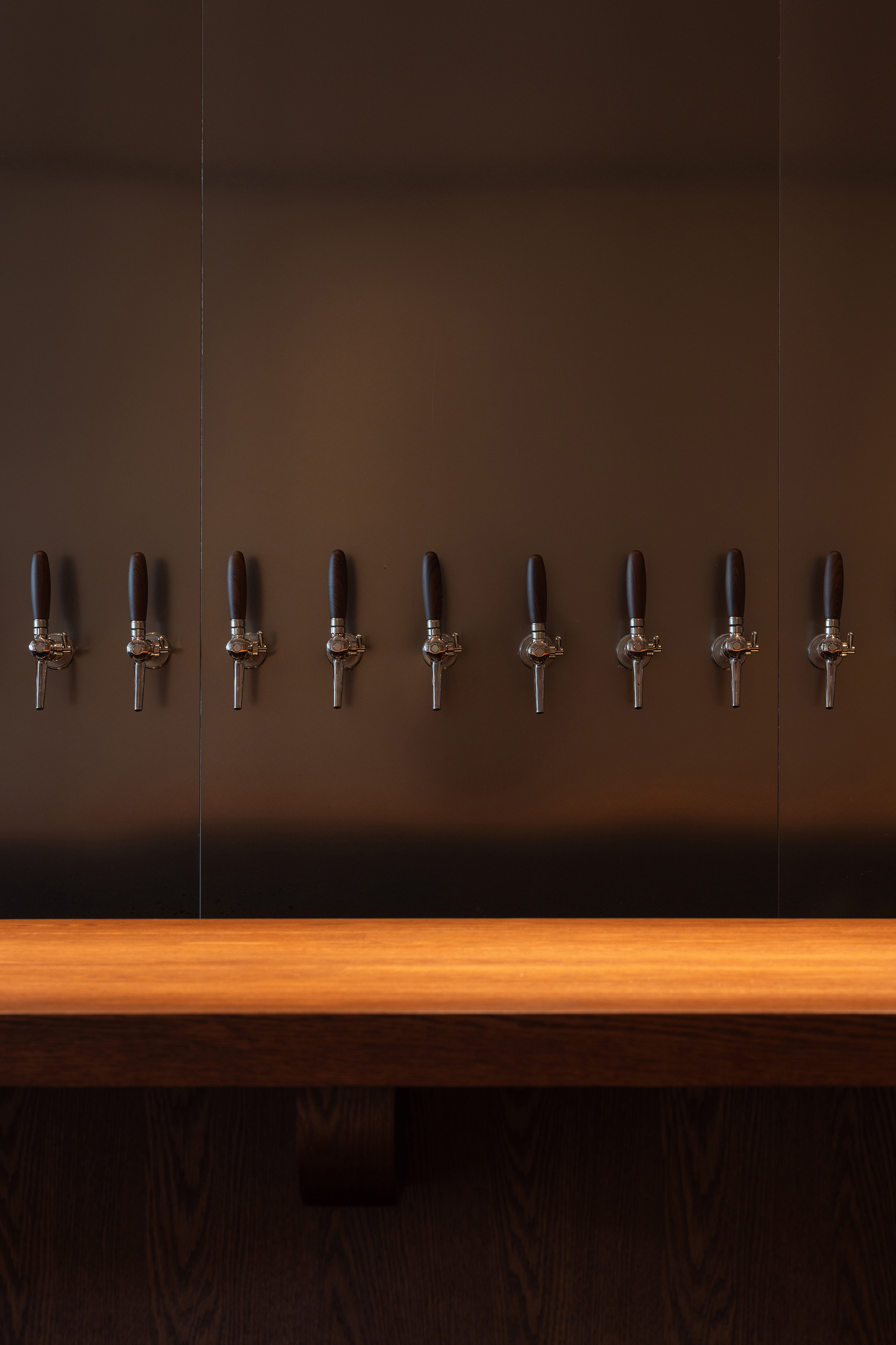 When designing and constructing the hard decoration base, we focus on the connection and combination of materials with modern block surfaces. We utilize light and shadow to create different shades of color blocks, allowing a collision between vintage and innovation to evoke a new sense of place. The coffee area is cut into high-end gray angles, and the rough surface of concrete combines with the form to enhance the visual bump structure, echoing the power of the existing blocks. As a taproom offering premium freshly brewed beverages, the customized stainless steel metal wine boxes on the operating counter, coupled with the segmentation of materials, gradually clarify the lines and contours, enhancing the recognizability of the hard decoration structure, thus achieving the unity of commercial logic and orderly spirit.