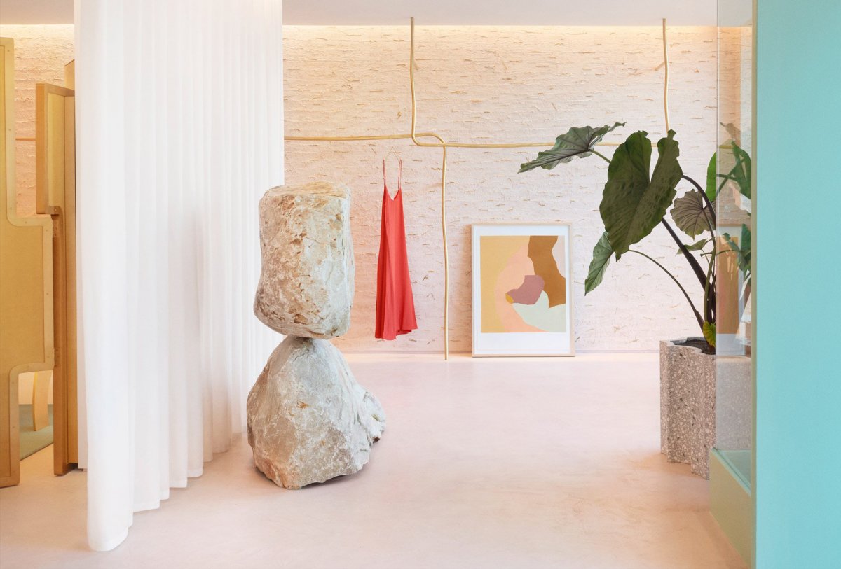 Another prominent element of the store is the placement of two large stones in front of ethereal full-height tulle curtains, one of which forms a dramatic balance on top of the other. The stones hail from the Palm Springs Desert and are intended as a tribute to the work of former Swiss art duo Peter Fischli and David Weiss.