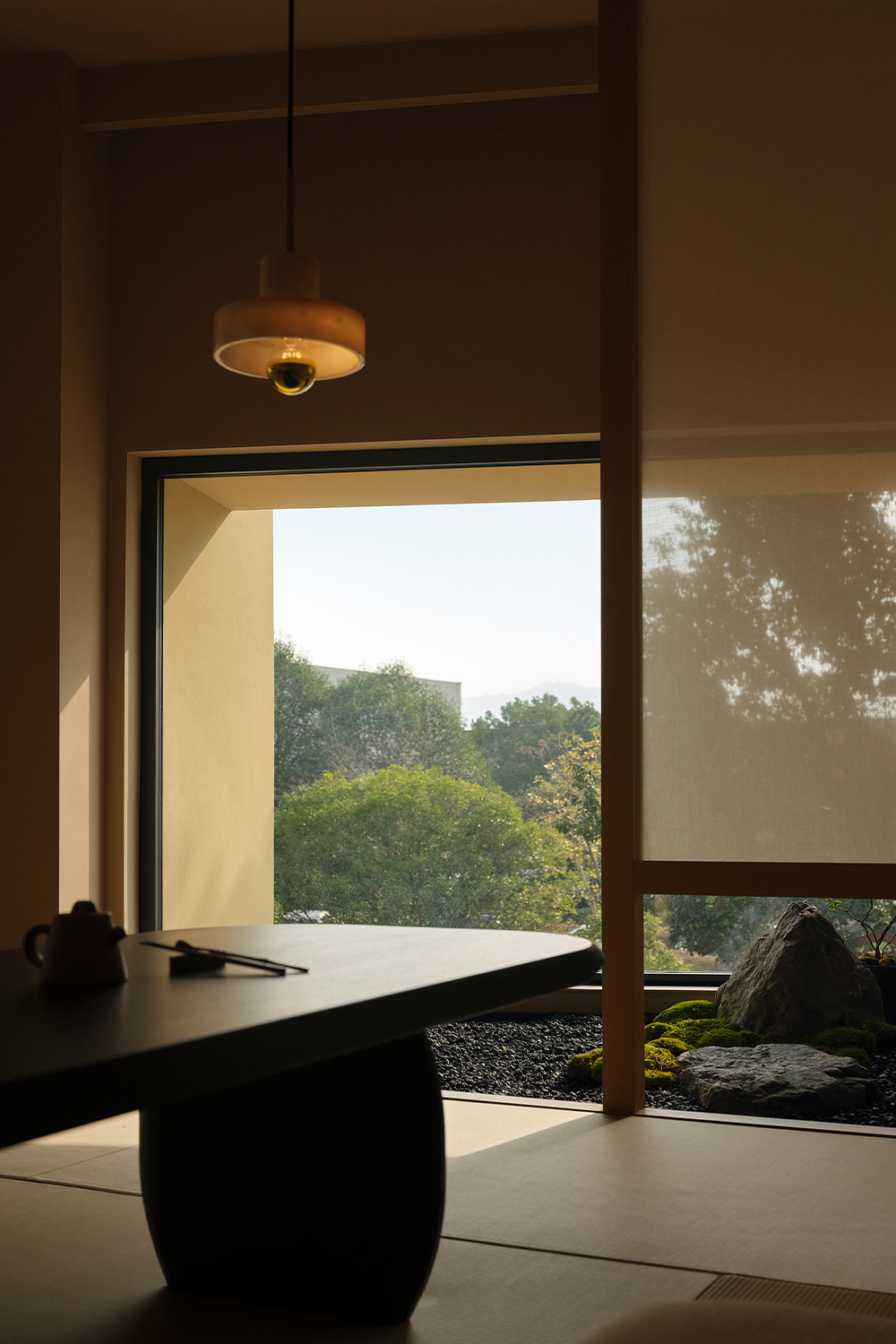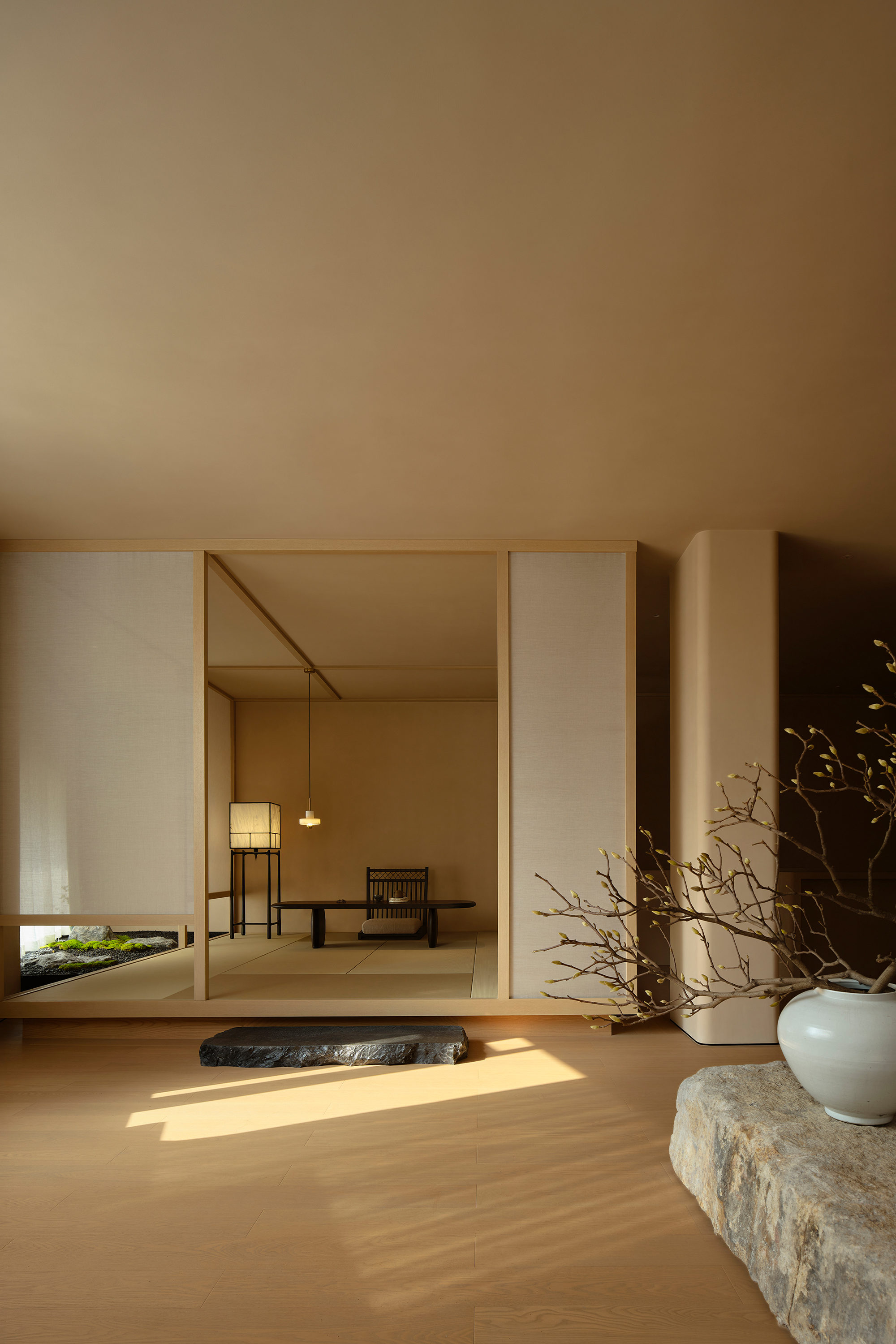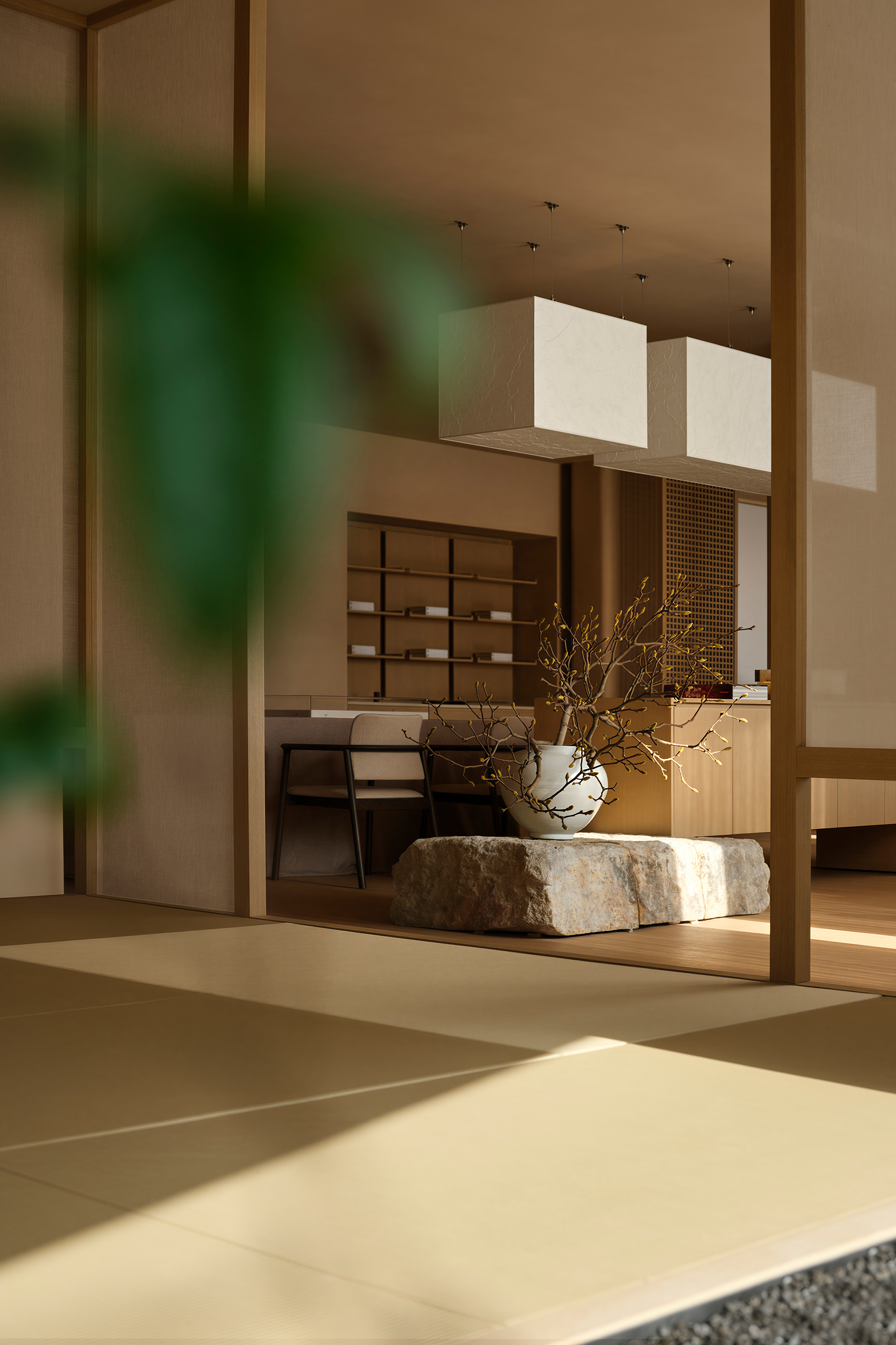 We adopt the approach of "borrowed scenery for symbiosis", introducing natural elements into the interior space.The shadows of outdoor trees are filtered into the room through semi-transparent gauze curtains; with withered branches and raw stones as decorative landscaping elements, nature is seamlessly extended into the space. This technique of "borrowed scenery" is not only a contemporary interpretation of classical gardens, but also materializes the oriental artistic conception of "harmony between humanity and nature", allowing people in the space to maintain a constant connection with nature.