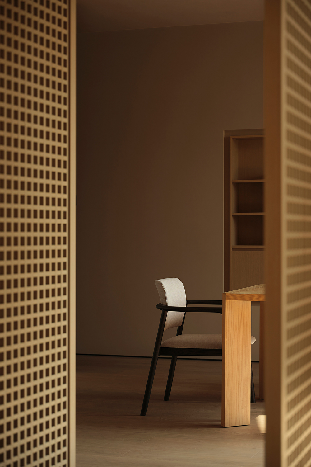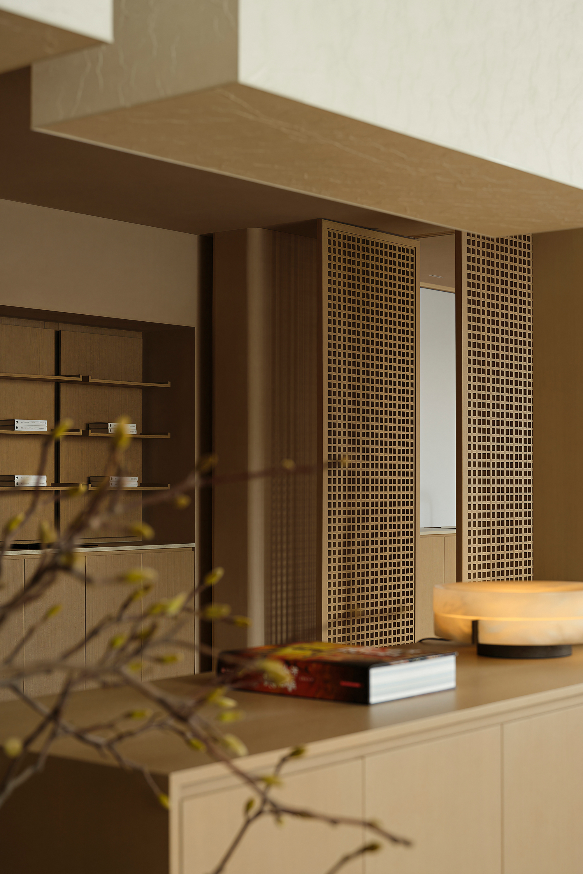 Expression of Warmth Within Restraint: The Harmonious Narrative of Colors and Lighting in Earth Tones.The space adopts an overall palette of earth tones such as off-white, light brown, and deep wood color, free from intense color clashes. Layers are solely created through the varying shades of materials. This low-saturation color system not only aligns with the restrained aesthetics of Zhonghe (Doctrine of the Mean) but also lays a warm and serene foundation for the space, refocusing visual attention on the materials themselves and the interplay of light and shadow.
