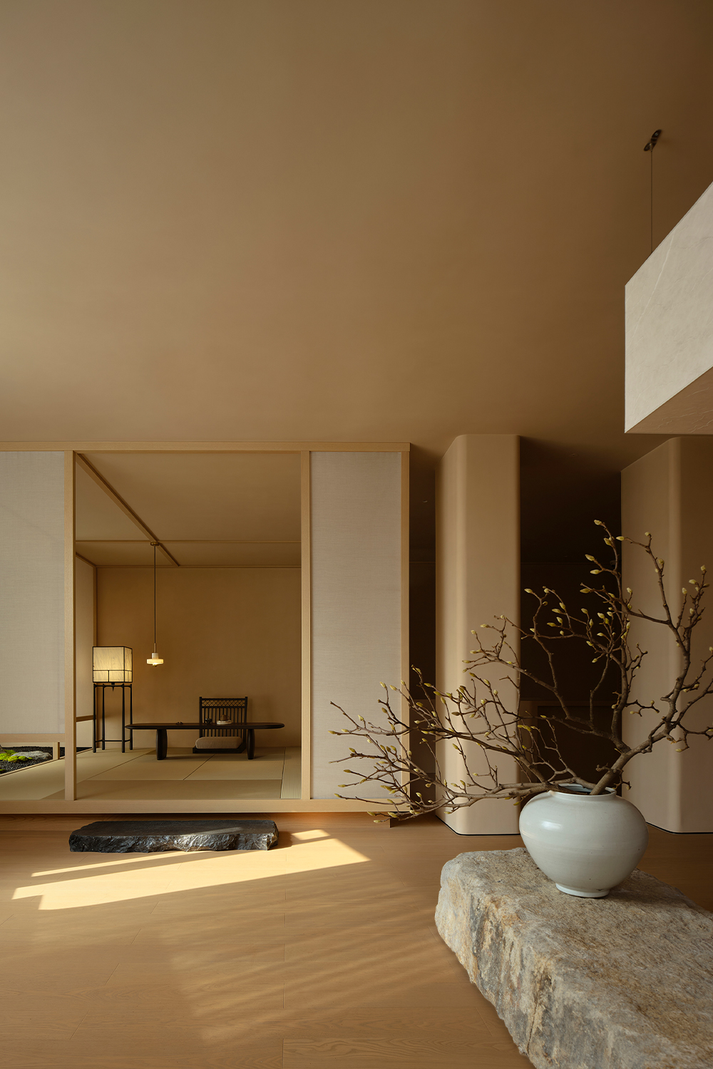 The soft furnishings follow the principles of "restraint, precision and localization".without any redundant ornamentation. The furnishings feature natural materials, with each piece carrying the warmth of handcraftsmanship and echoing the Zhonghe (Doctrine of the Mean) temperament of the space. Greenery is merely accented with scattered withered branches and moss, avoiding over-landscaping—allowing natural elements to serve as the finishing touches of the space rather than a visual distraction.