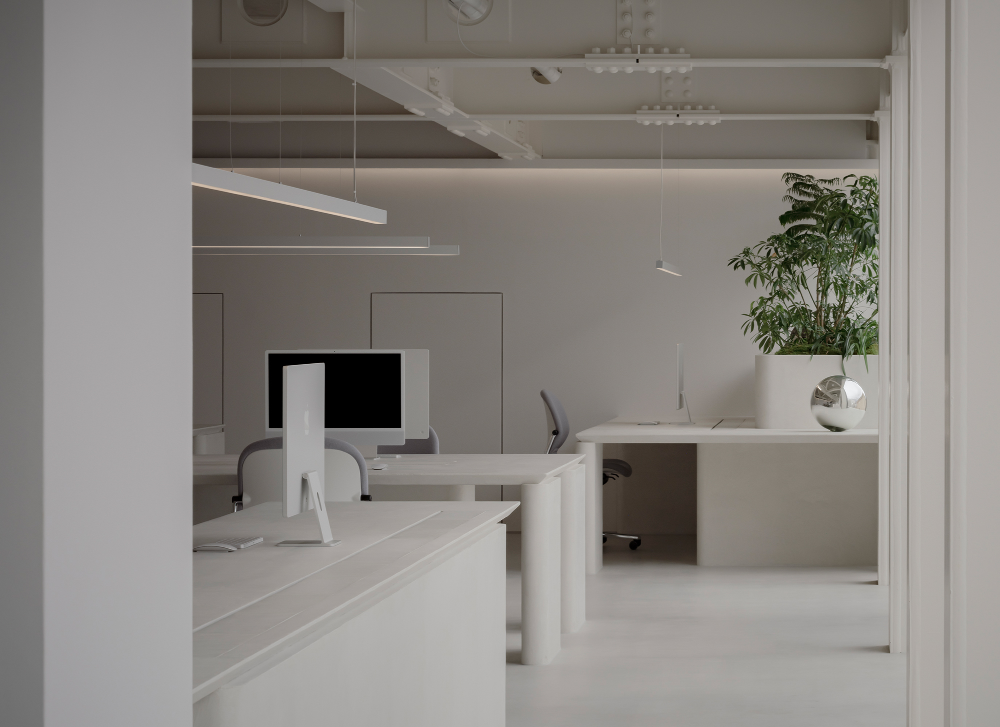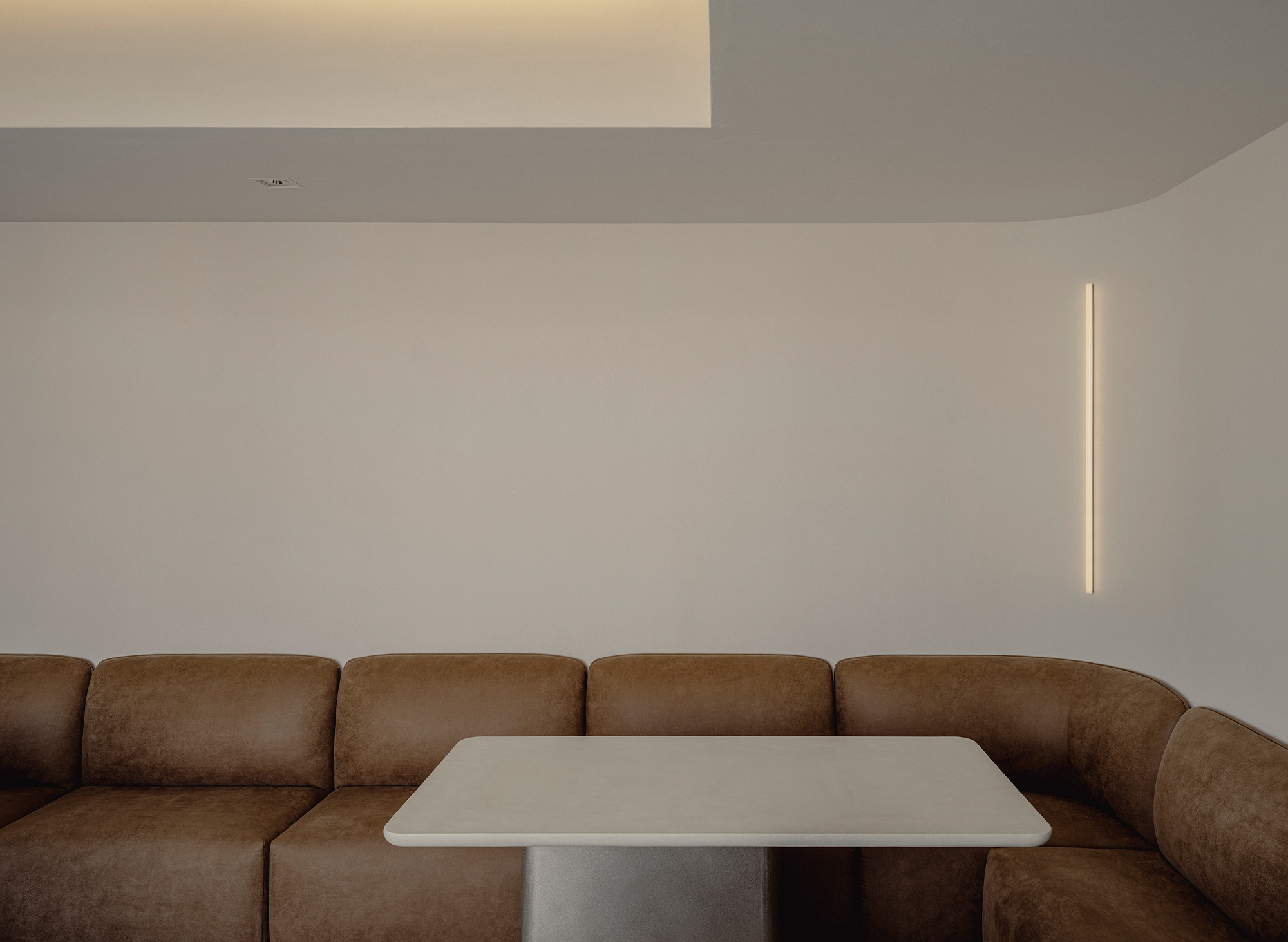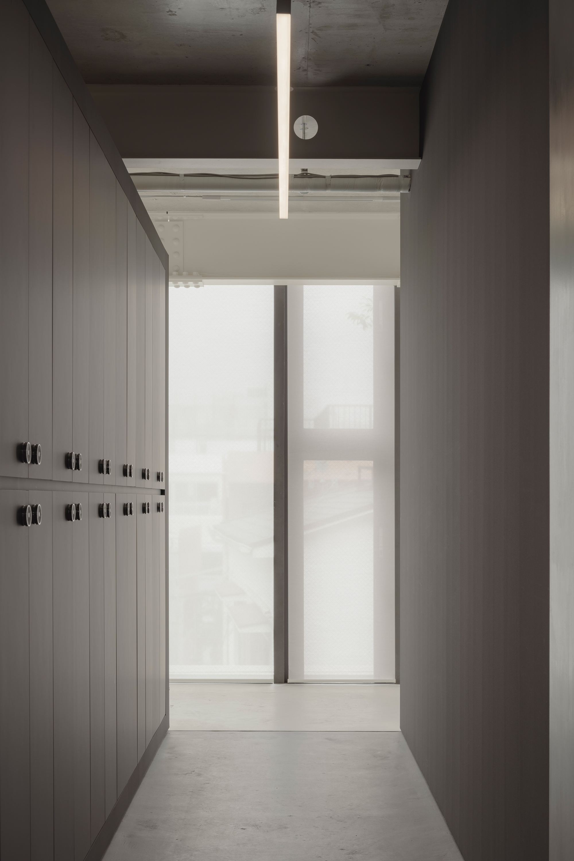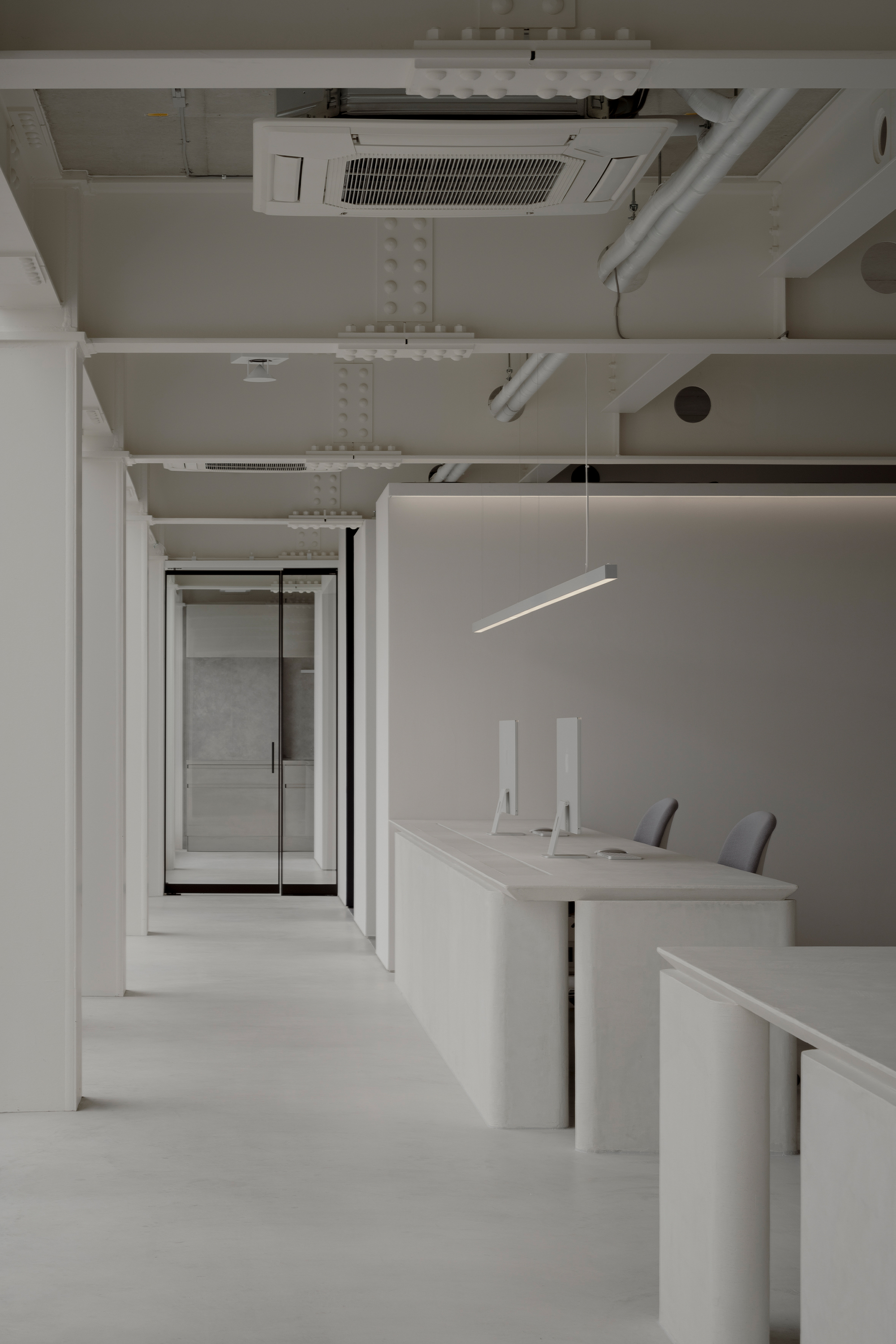 At first glance, the office appears to be filled with immaculate white. Yet as one approaches and touches the surfaces, a quiet plaster texture begins to emerge. Within this clean white, subtle shadows reveal themselves only upon contact. Because the gallery places great importance on the materiality of art, we chose a white that carries a tangible presence—one in which abstraction and physicality rise simultaneously. In this, we found a resonance with the silence and sincerity with which they engage with artworks.