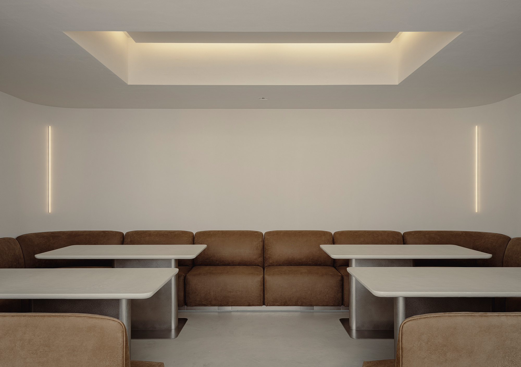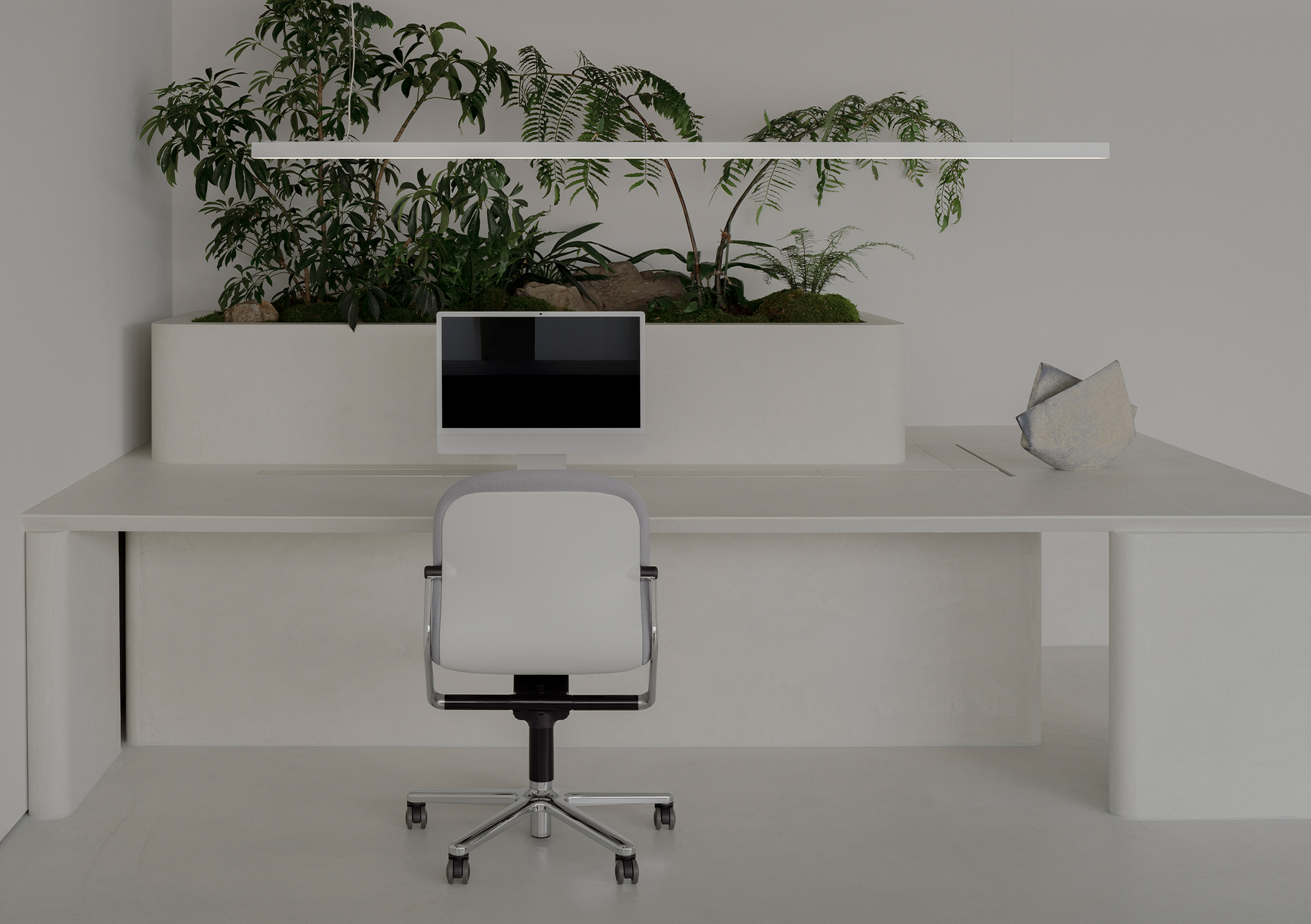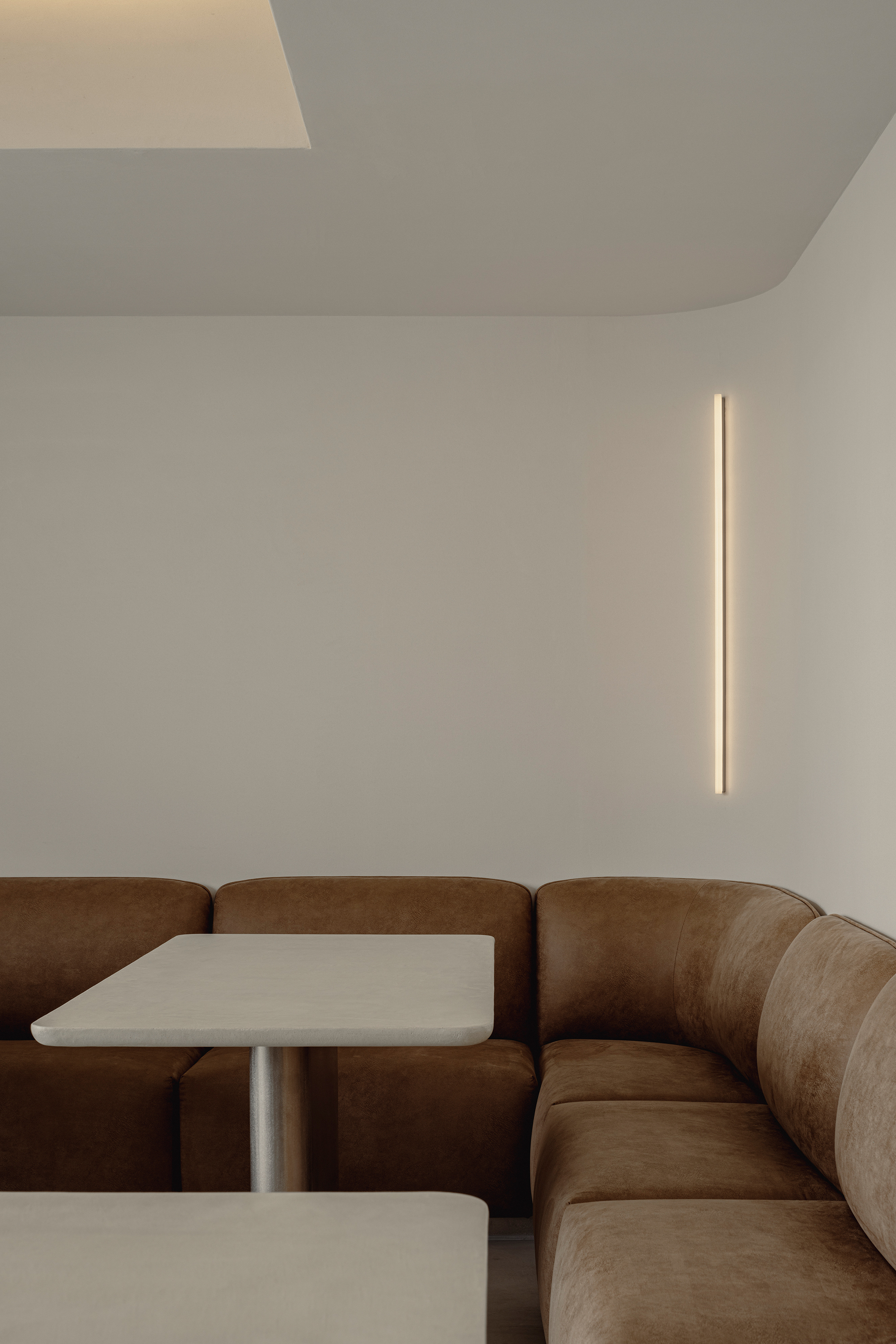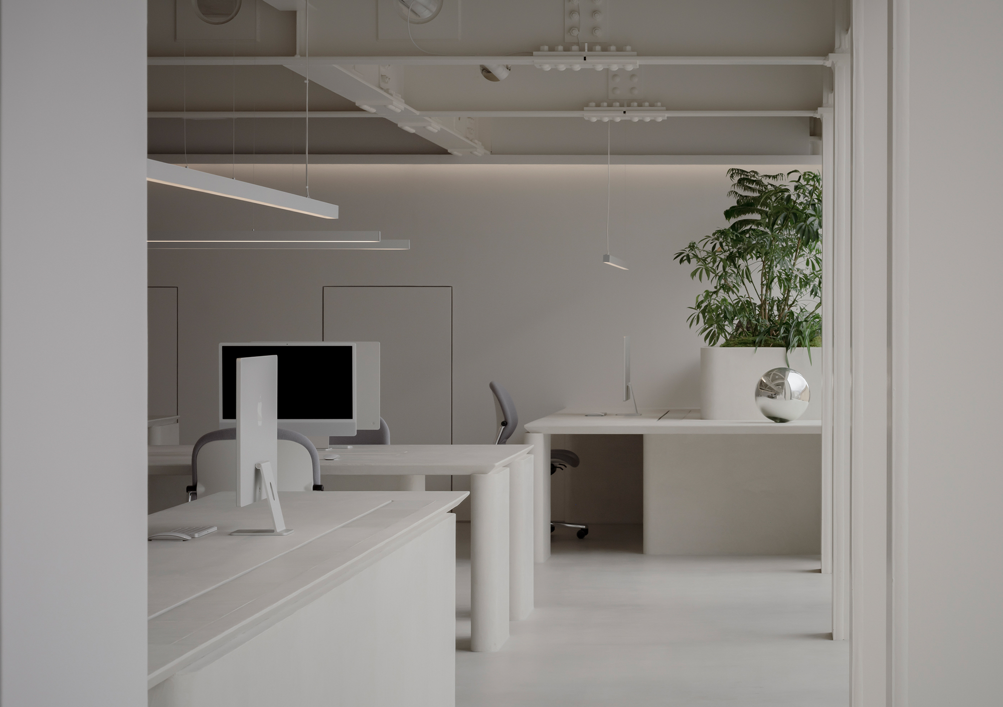 At first glance, the office appears to be filled with immaculate white. Yet as one approaches and touches the surfaces, a quiet plaster texture begins to emerge. Within this clean white, subtle shadows reveal themselves only upon contact. Because the gallery places great importance on the materiality of art, we chose a white that carries a tangible presence—one in which abstraction and physicality rise simultaneously. In this, we found a resonance with the silence and sincerity with which they engage with artworks.