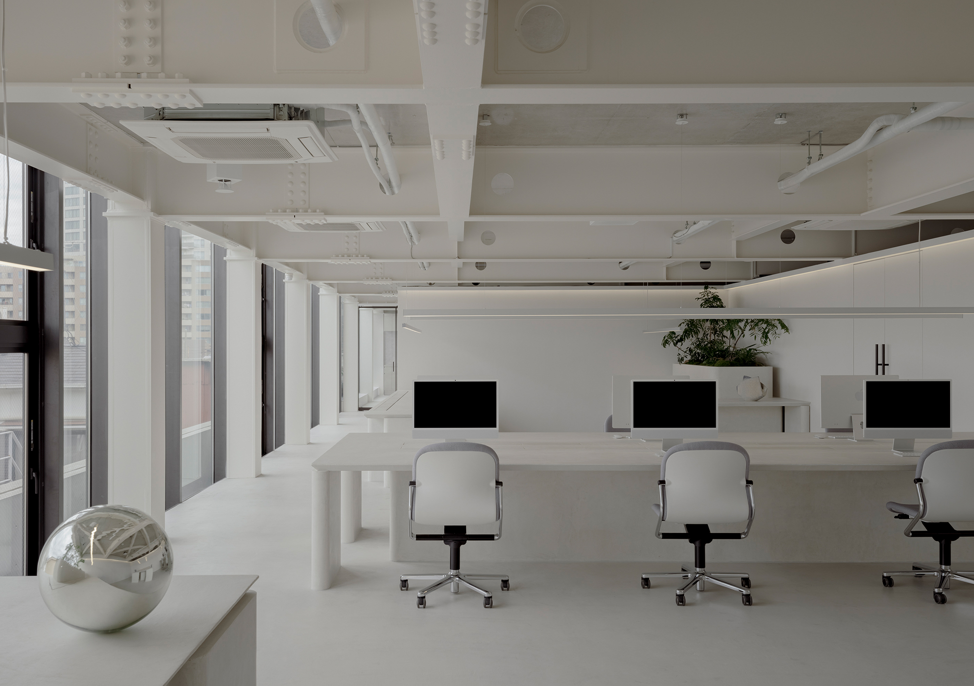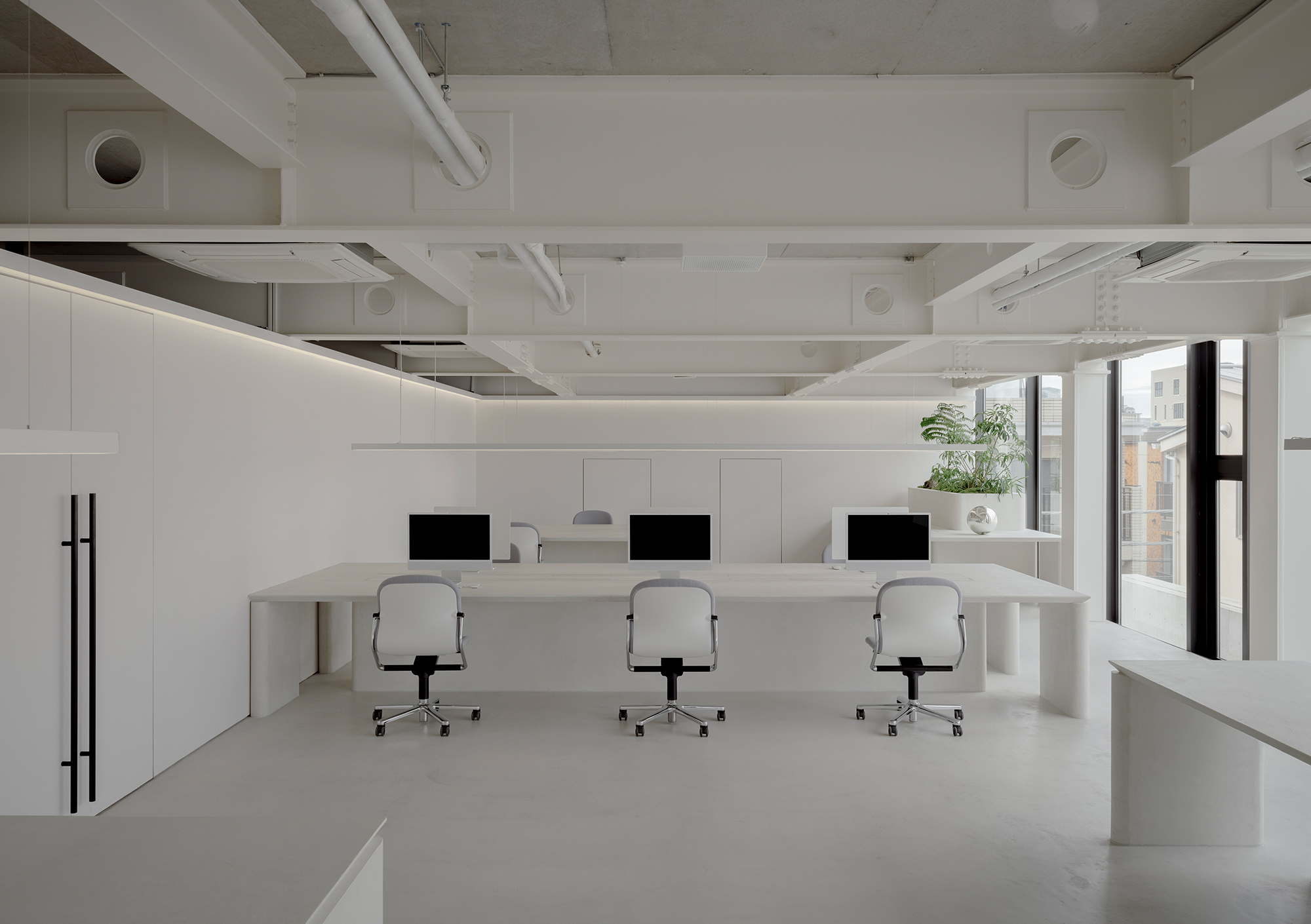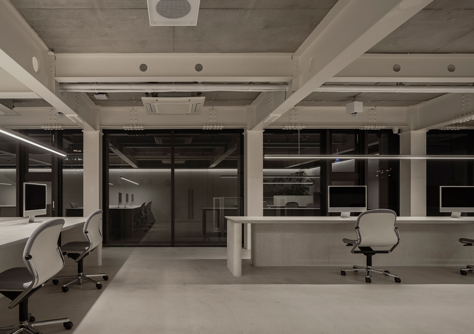 The desk layout was planned as a translation of the building’s latent spatial potential into a new mode of working. Conversations arise naturally with just a slight turn of the body, flowing seamlessly into shared discussions over documents or monitor screens. Rather than defining meeting rooms as separate enclosures, the space embraces the continuity of movement, creating an environment where communication remains light and fluid.