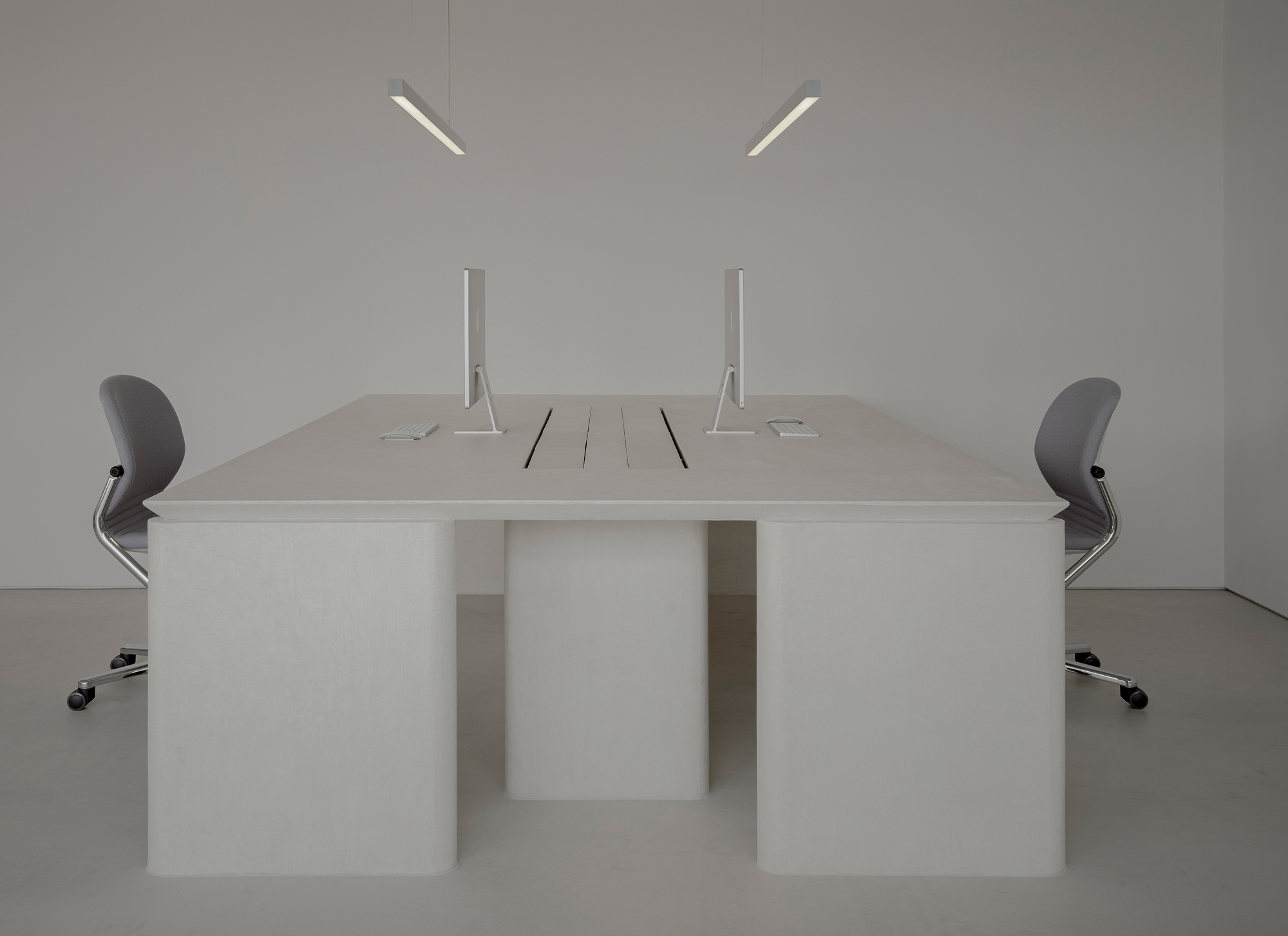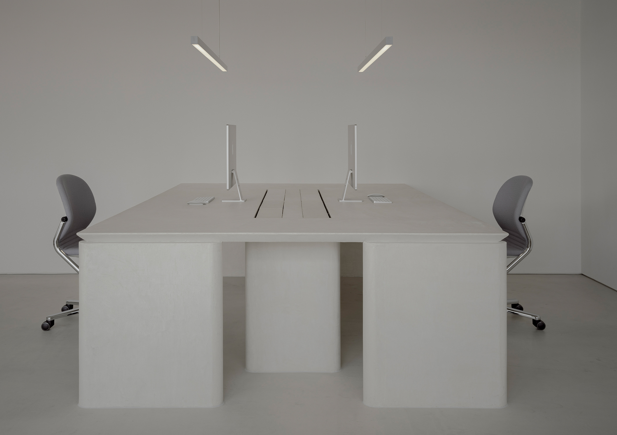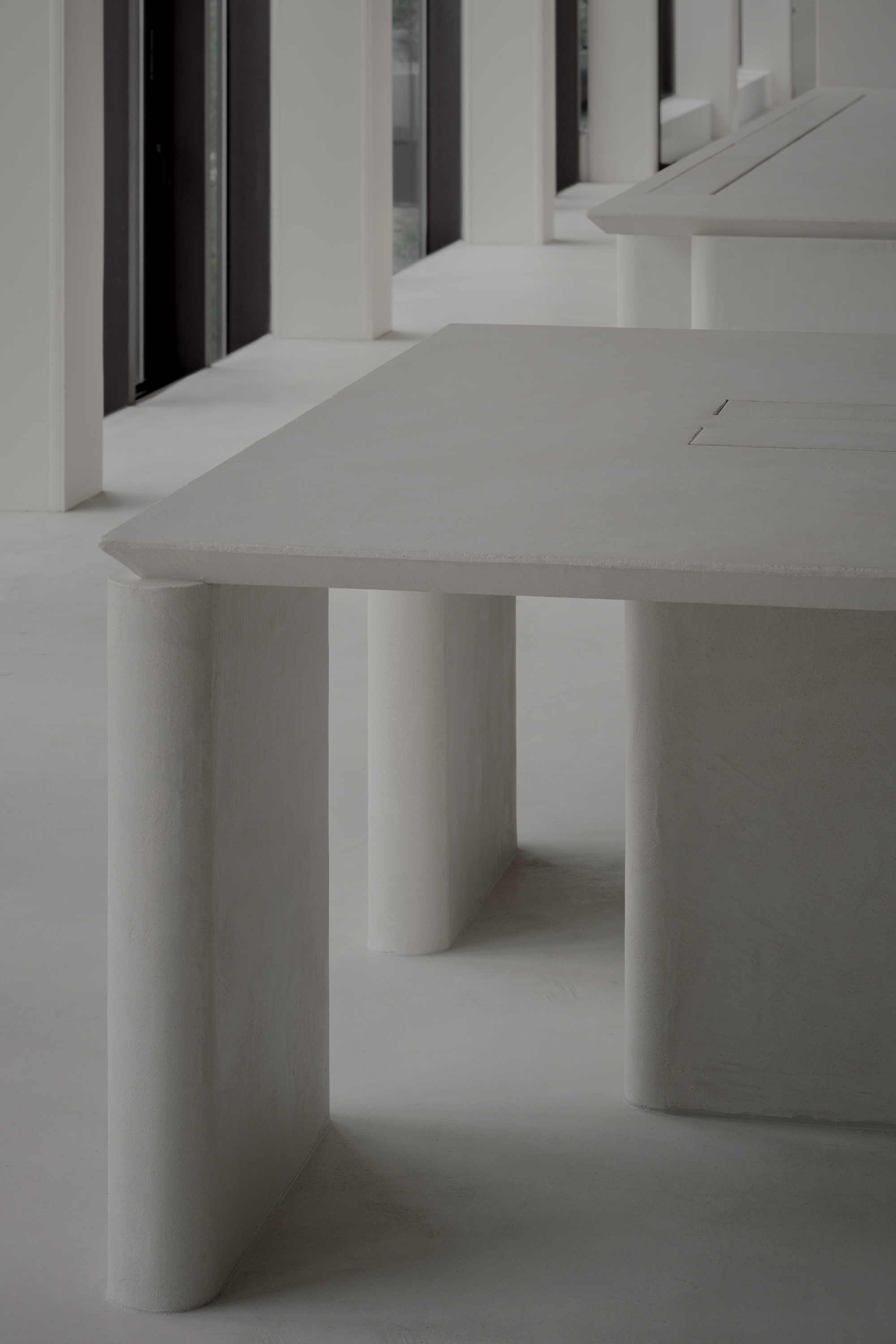 The desks themselves consist of architectonic, column-like legs quietly supporting the surface. The contrast between forms that follow the logic of gravity and the floating, planar quality above symbolizes the gallery’s purity and strength of intent.