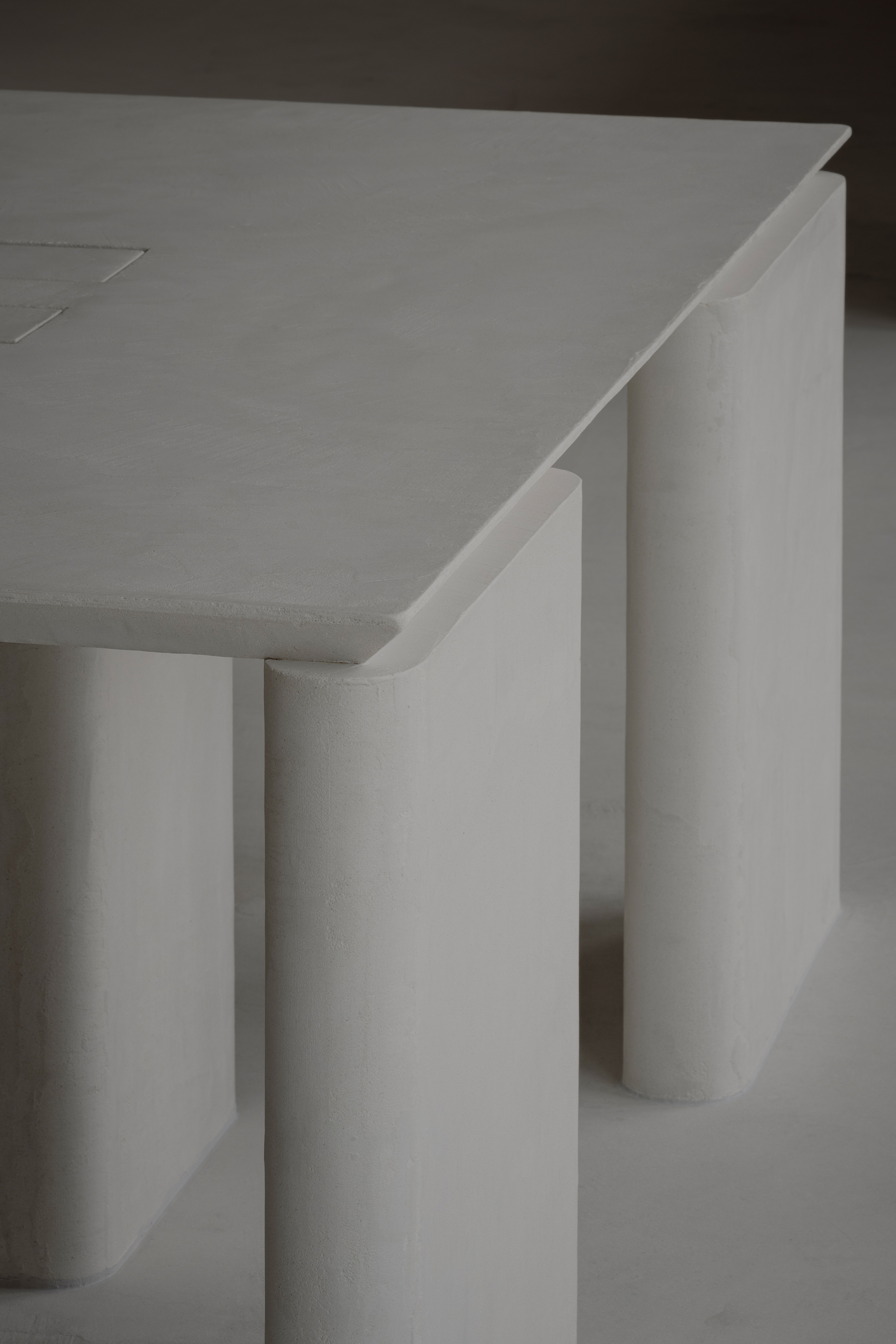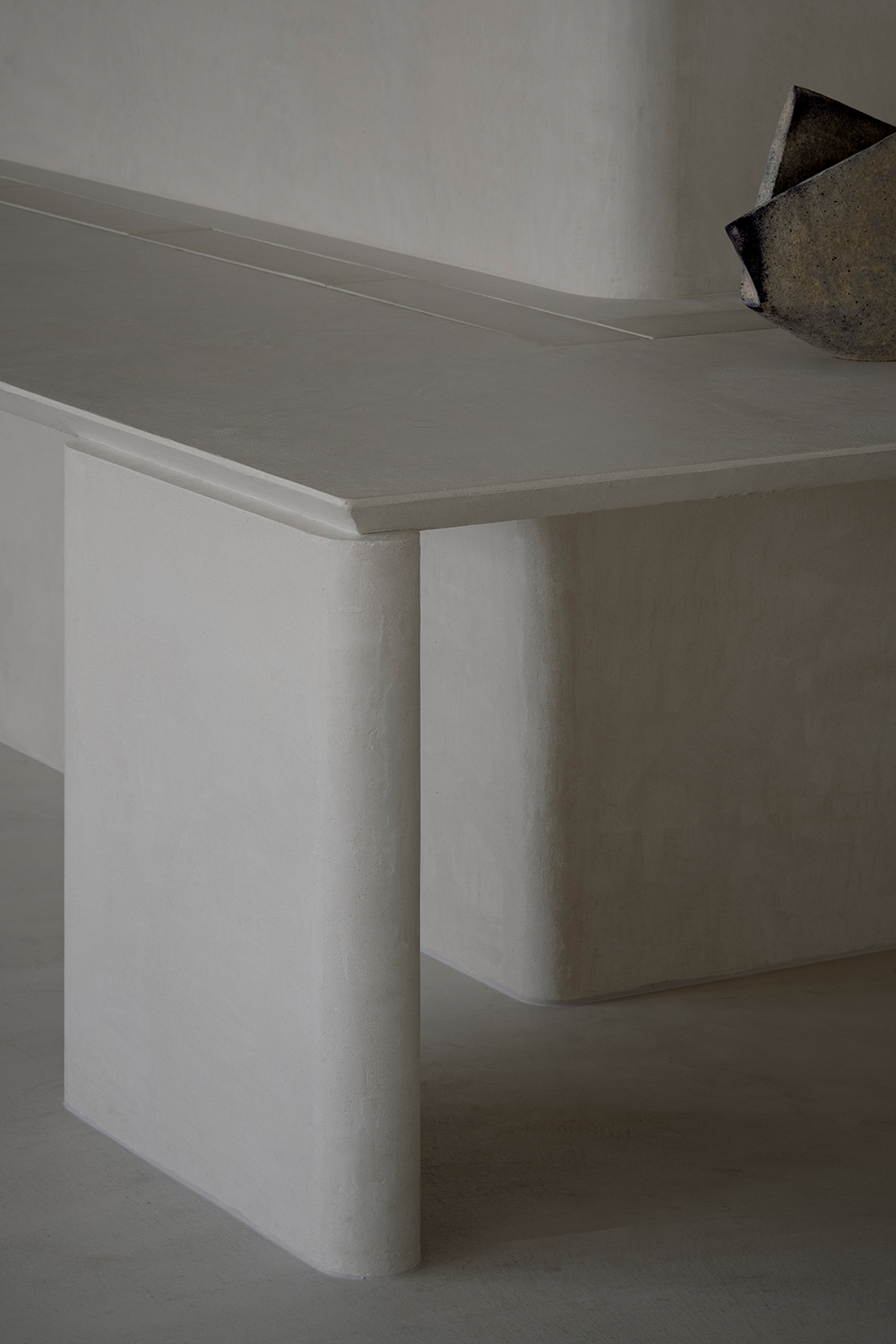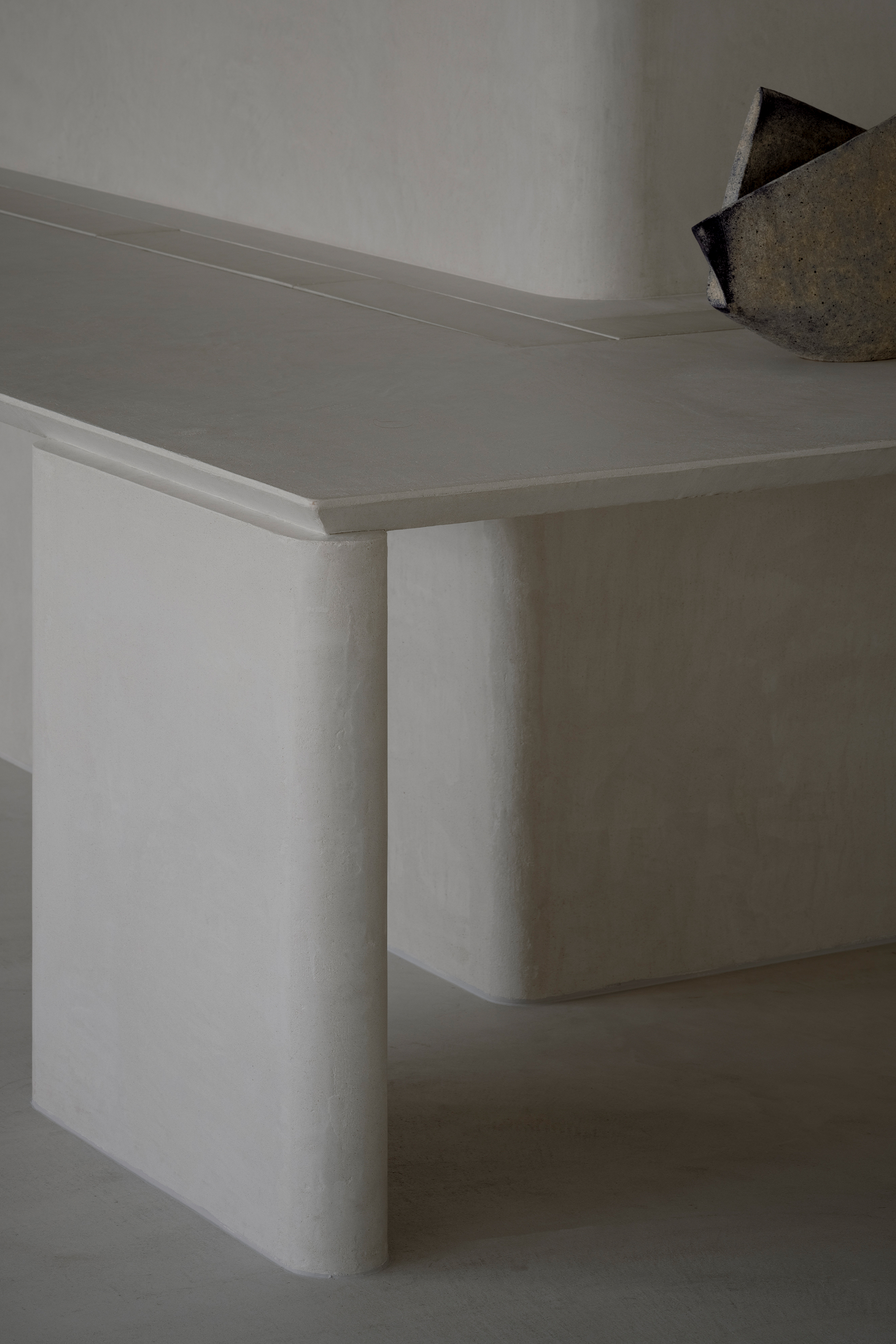 The desks themselves consist of architectonic, column-like legs quietly supporting the surface. The contrast between forms that follow the logic of gravity and the floating, planar quality above symbolizes the gallery’s purity and strength of intent.