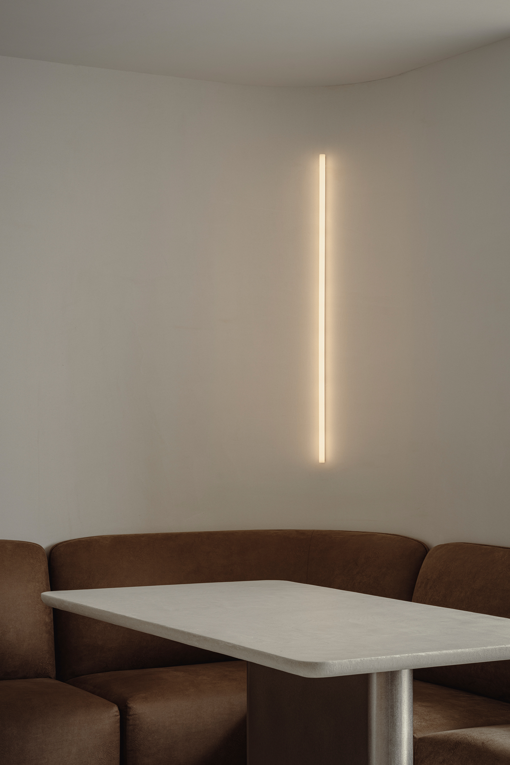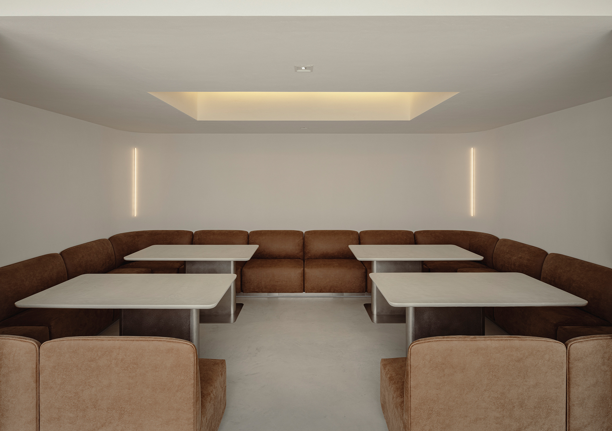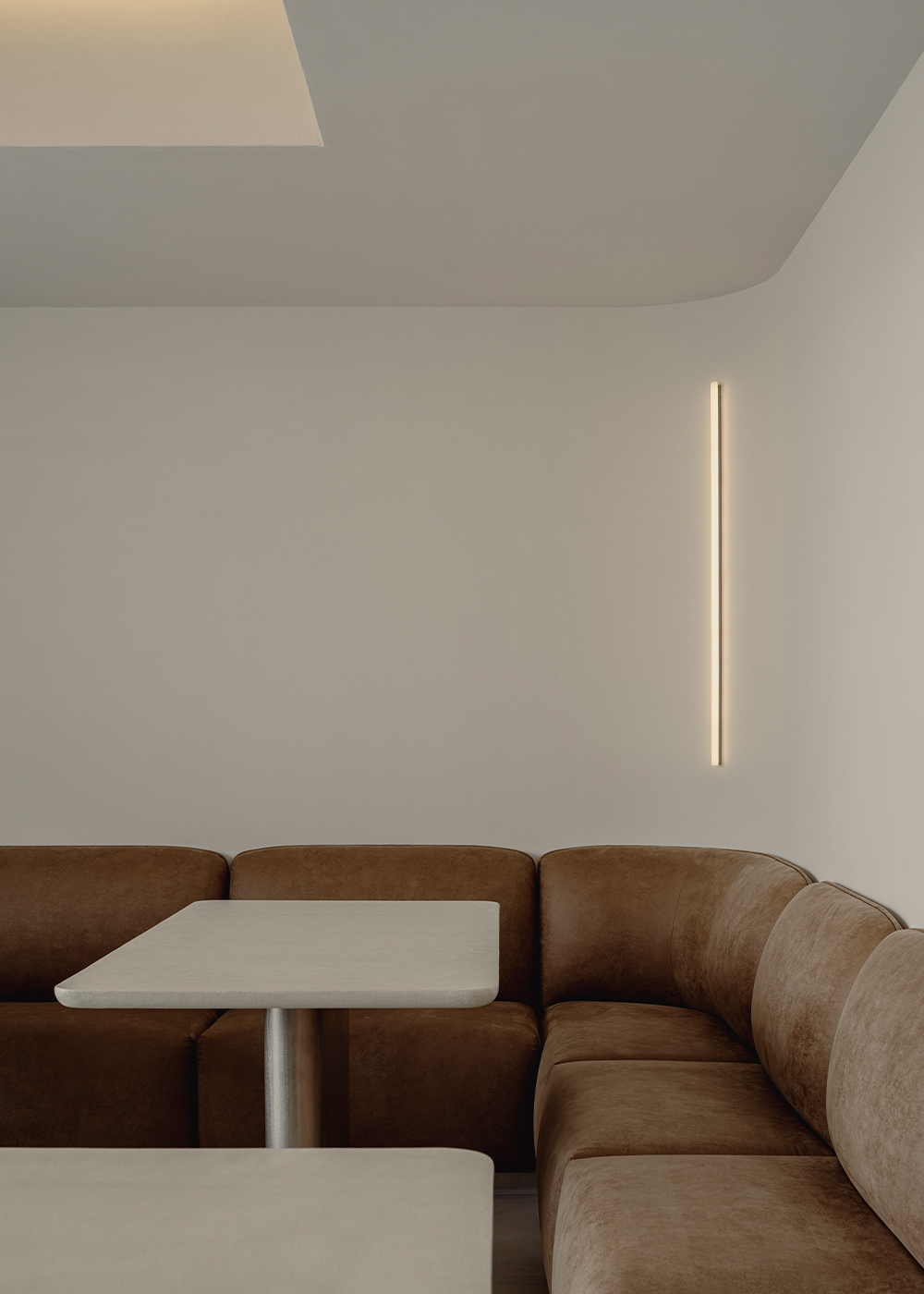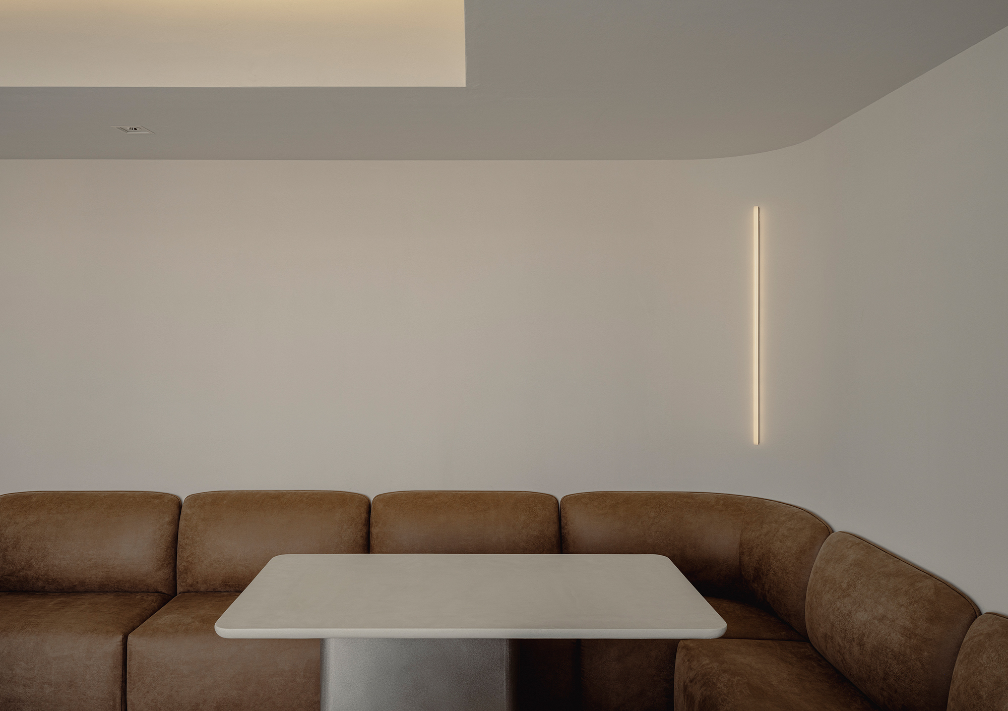 Adjacent to the kitchen, a dining area was created. A sofa with generous, soft contours and a table with a cantilevered top offer a gentle place to release tension and regain one’s everyday rhythm. This office represents a poetic reinterpretation of the gallery’s commitment to pure beauty, expressed through white, materiality, and spatial composition.