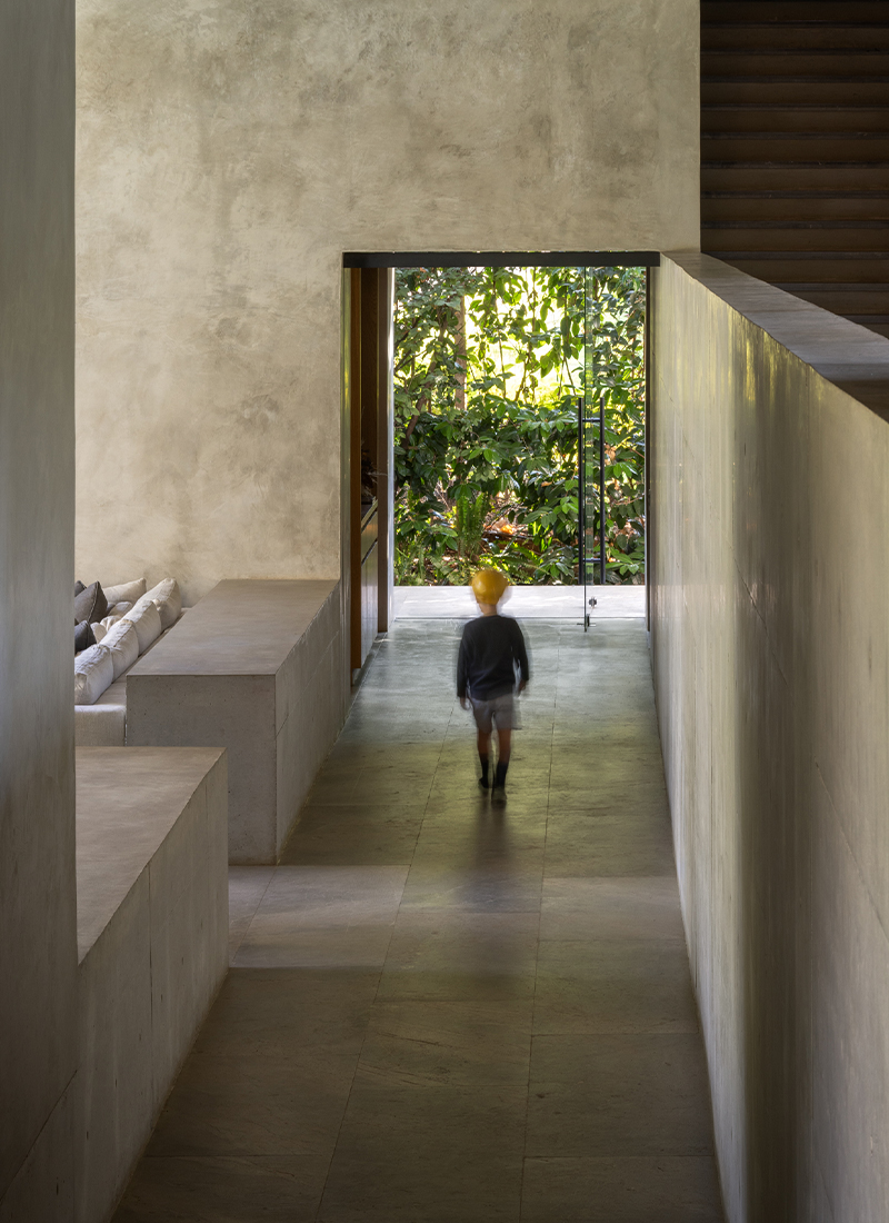 This open atrium not only brings in natural light and ventilation, but also creates a continuous visual fusion between the interior and the surrounding vegetation, extending a light and peaceful vacation atmosphere. -