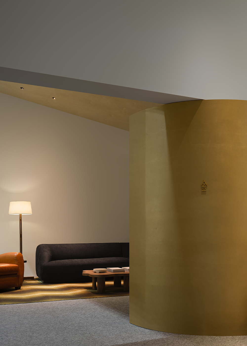 The ceiling is adorned with golden artisanal paint, as if morning light—enchanted into liquid gold—cascades through the openings of the wooden boxes, spilling precisely into the heart of the space. The light flows freely across walls, floors, and furniture, tracing a three-dimensional interplay of light and shadow, like countless wondrous moments of daybreak. Stepping inside, visitors seem to fall into the folds of time, traversing the interwoven threads of past, present, and future.