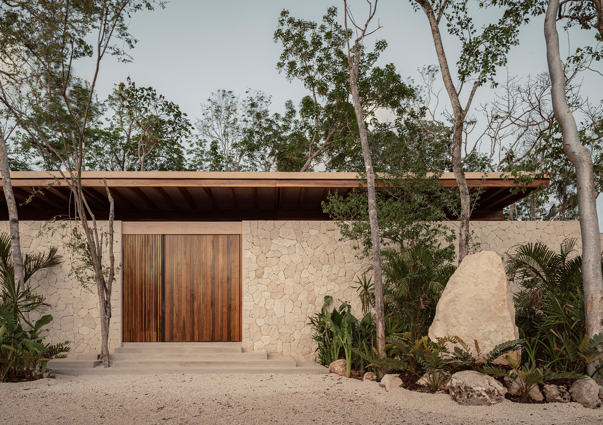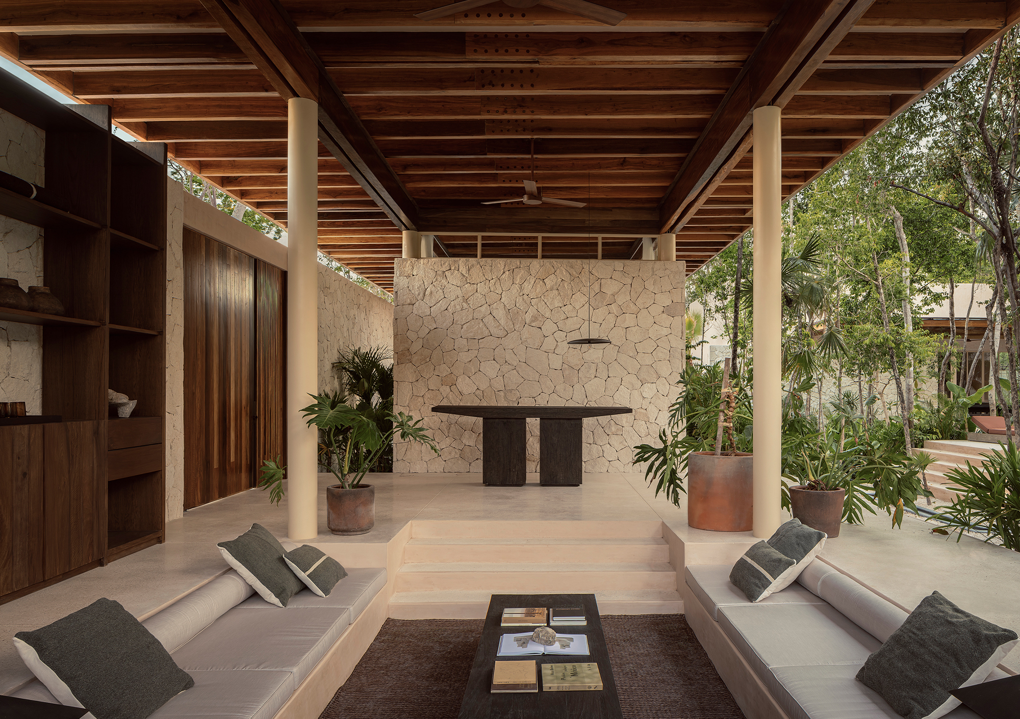 The architecture is solid and enclosed when privacy and introspection are required, and open and transparent when visual connections with the landscape and the pool area are desired, especially in spaces with a more social character. The reception area is designed as a linear pavilion with a solid concrete and chukum base, topped by a lightweight wooden roof that appears to float within the jungle. This effect is achieved through slender columns that blend with the surrounding trees.