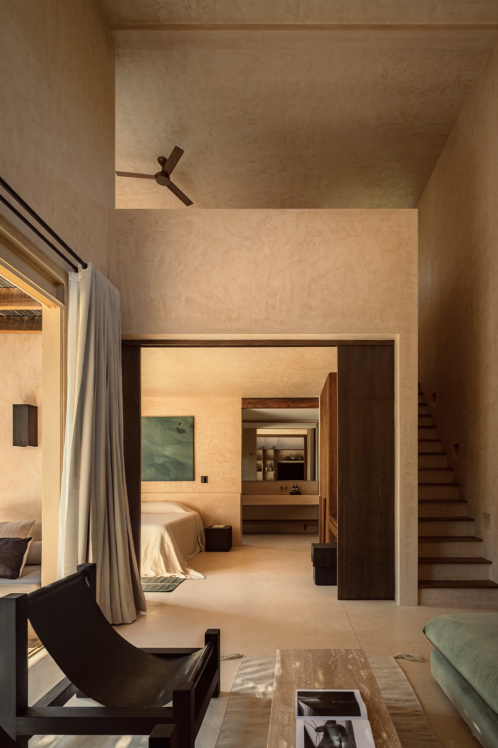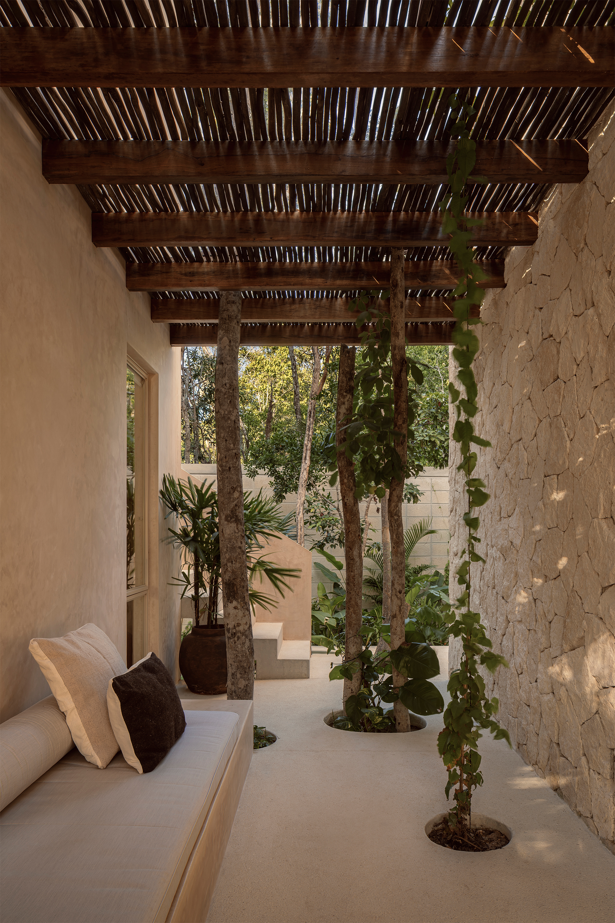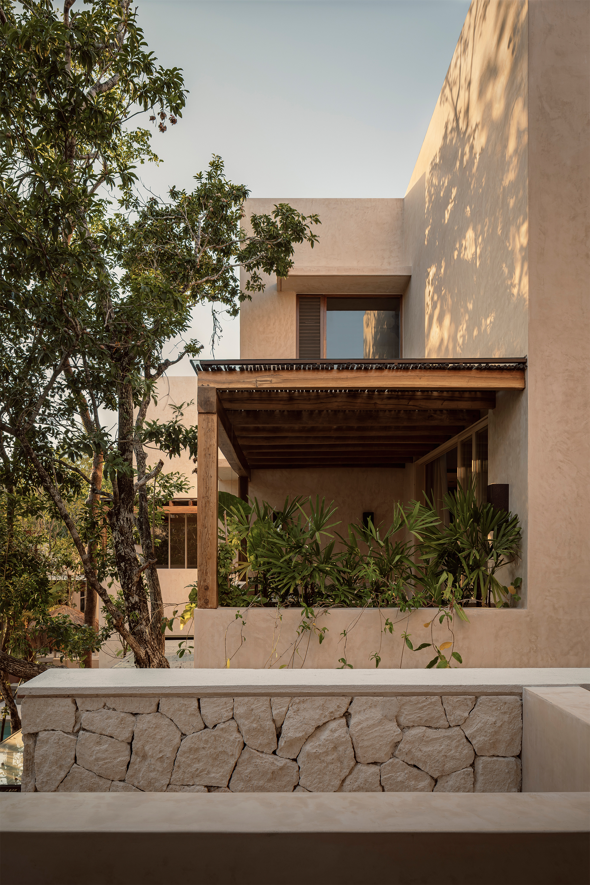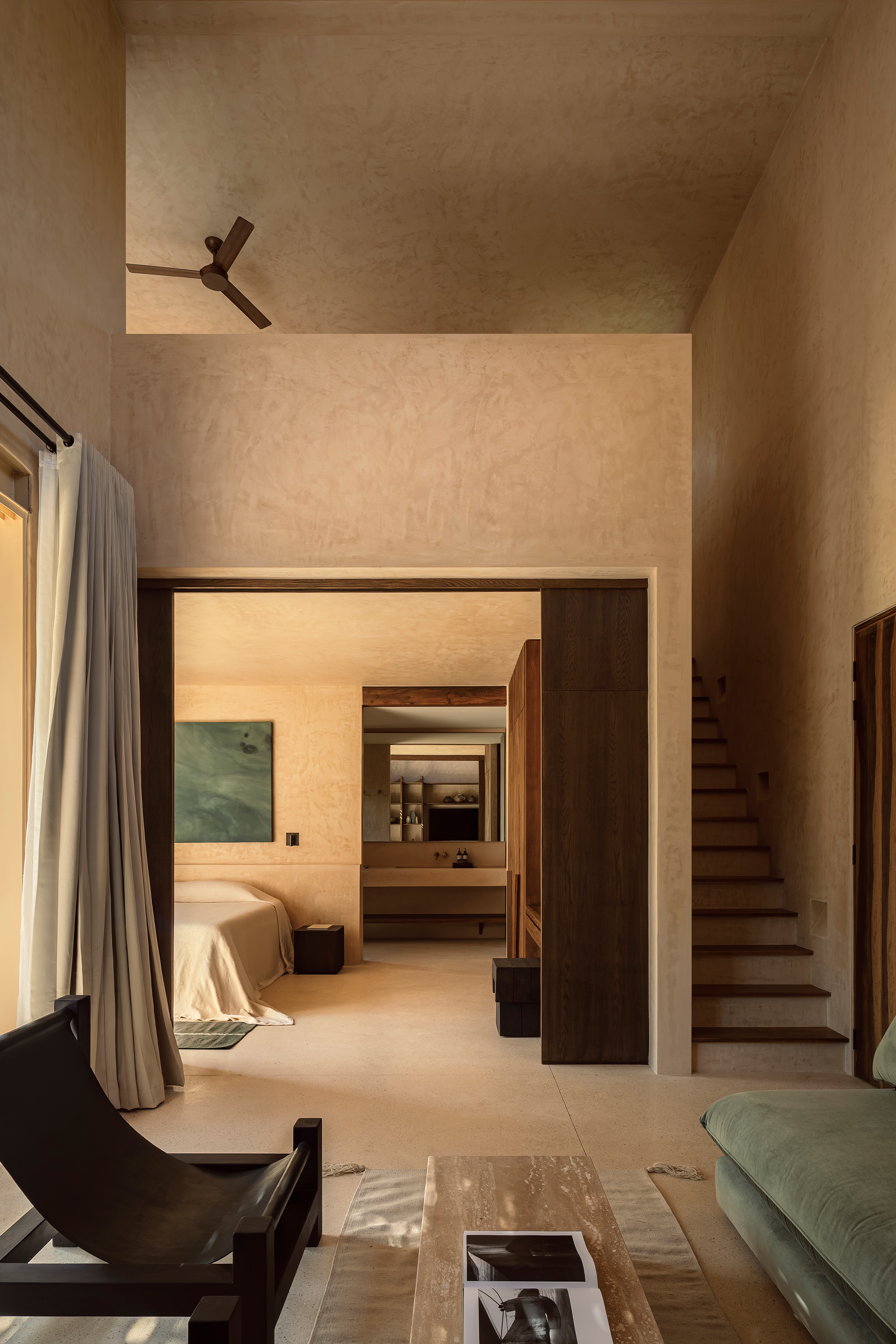 The hotel features 10 rooms, distributed in two different typologies. The ground-floor units follow a horizontal spatial composition that encourages a direct connection with the surroundings through outdoor terraces and indoor-outdoor bathrooms. The upper floor rooms, offer a vertical reading, which includes a double-height social area and two bedrooms with ensuite bathrooms, resolved through a mezzanine. The result is spacious, well-ventilated interiors that perform adequately in Tulum’s warm and humid climate.