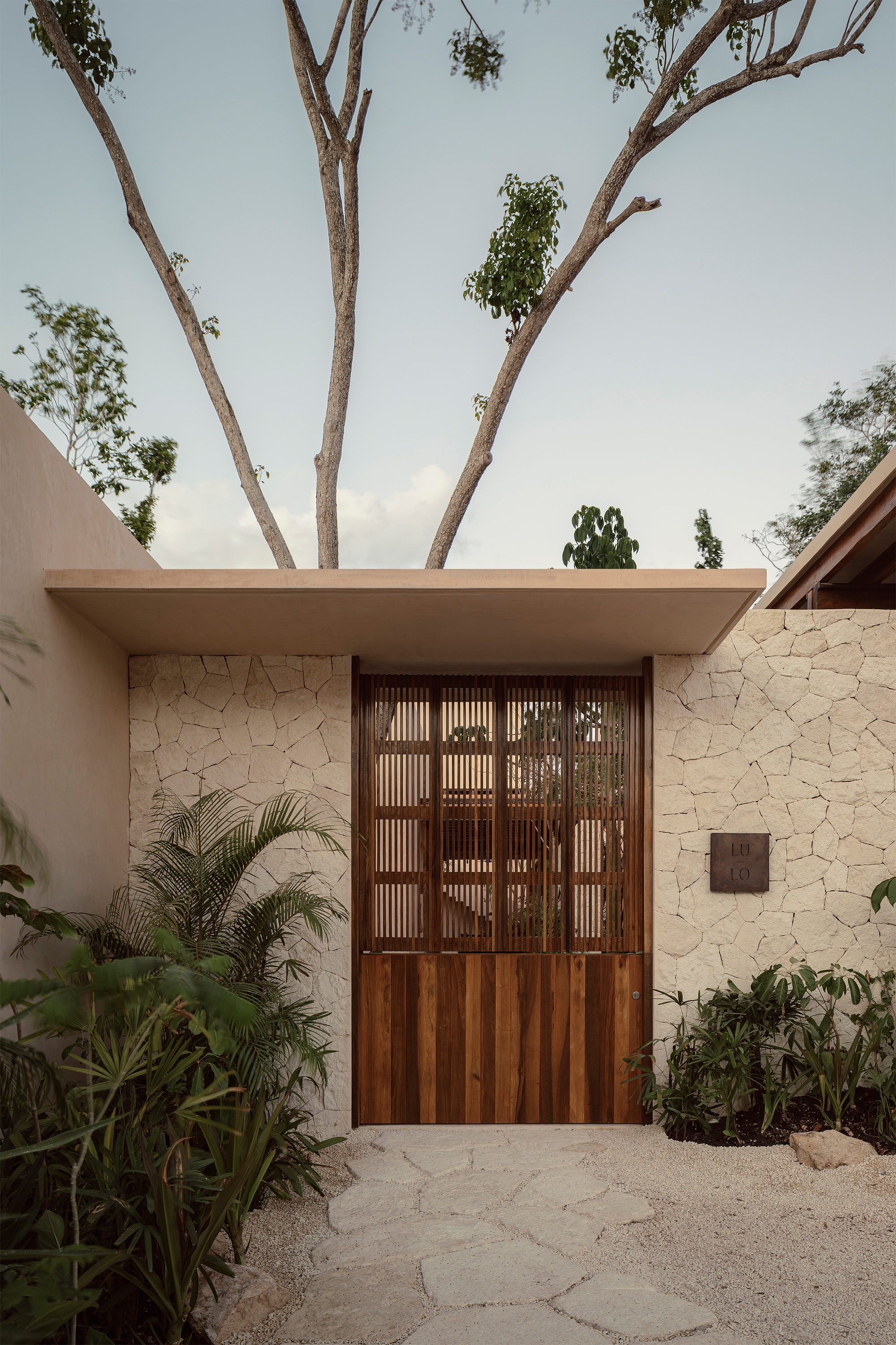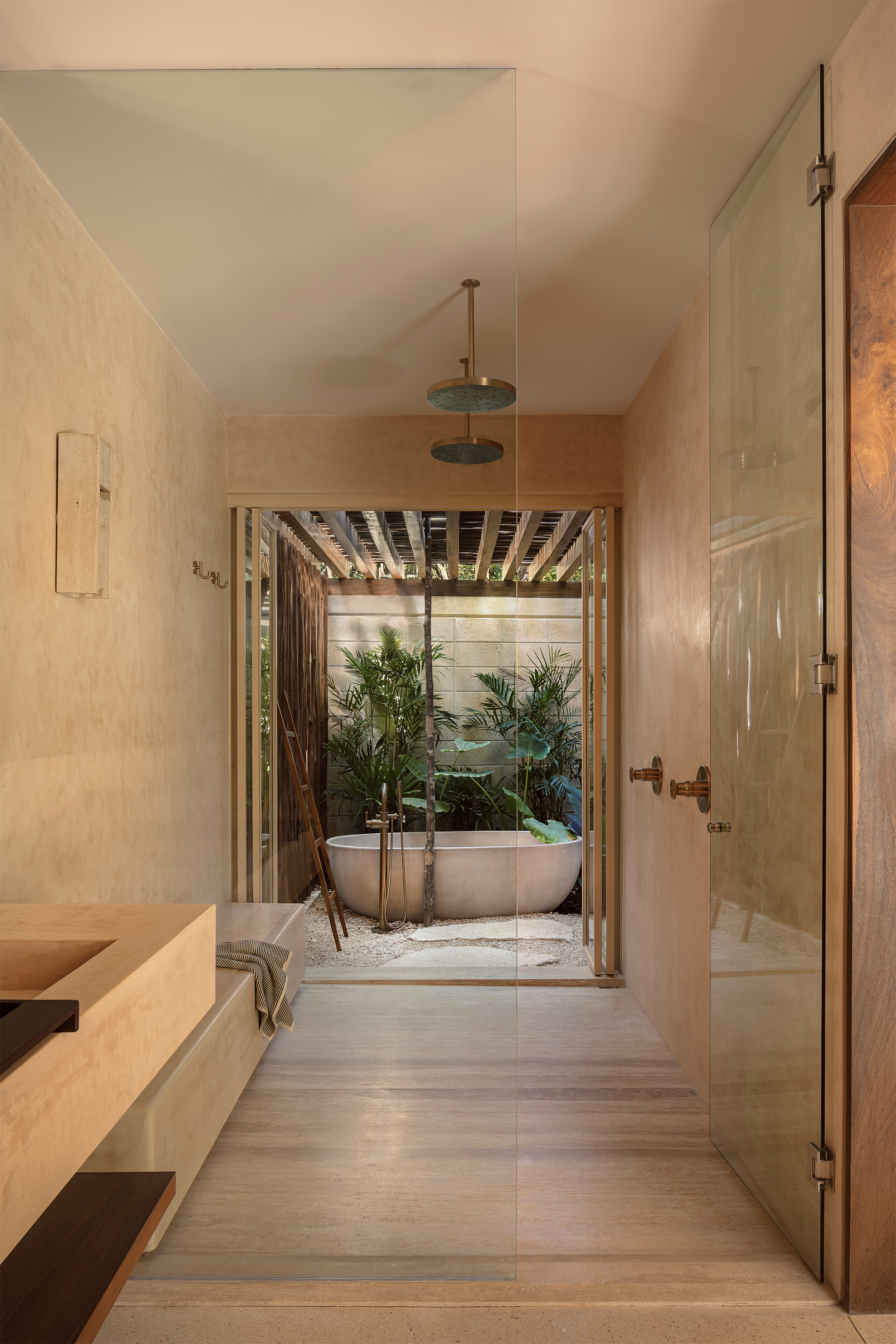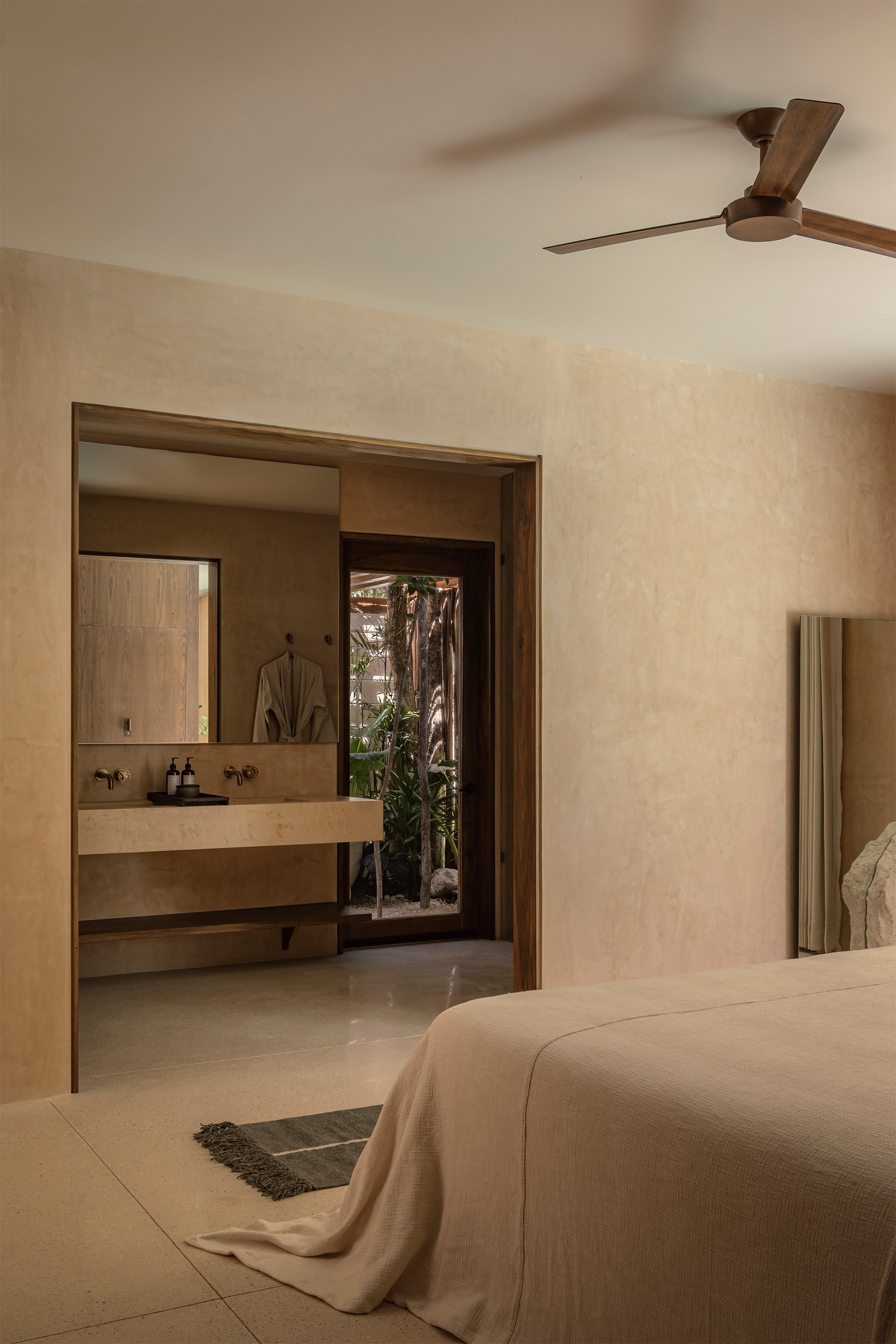 The hotel features 10 rooms, distributed in two different typologies. The ground-floor units follow a horizontal spatial composition that encourages a direct connection with the surroundings through outdoor terraces and indoor-outdoor bathrooms. The upper floor rooms, offer a vertical reading, which includes a double-height social area and two bedrooms with ensuite bathrooms, resolved through a mezzanine. The result is spacious, well-ventilated interiors that perform adequately in Tulum’s warm and humid climate.