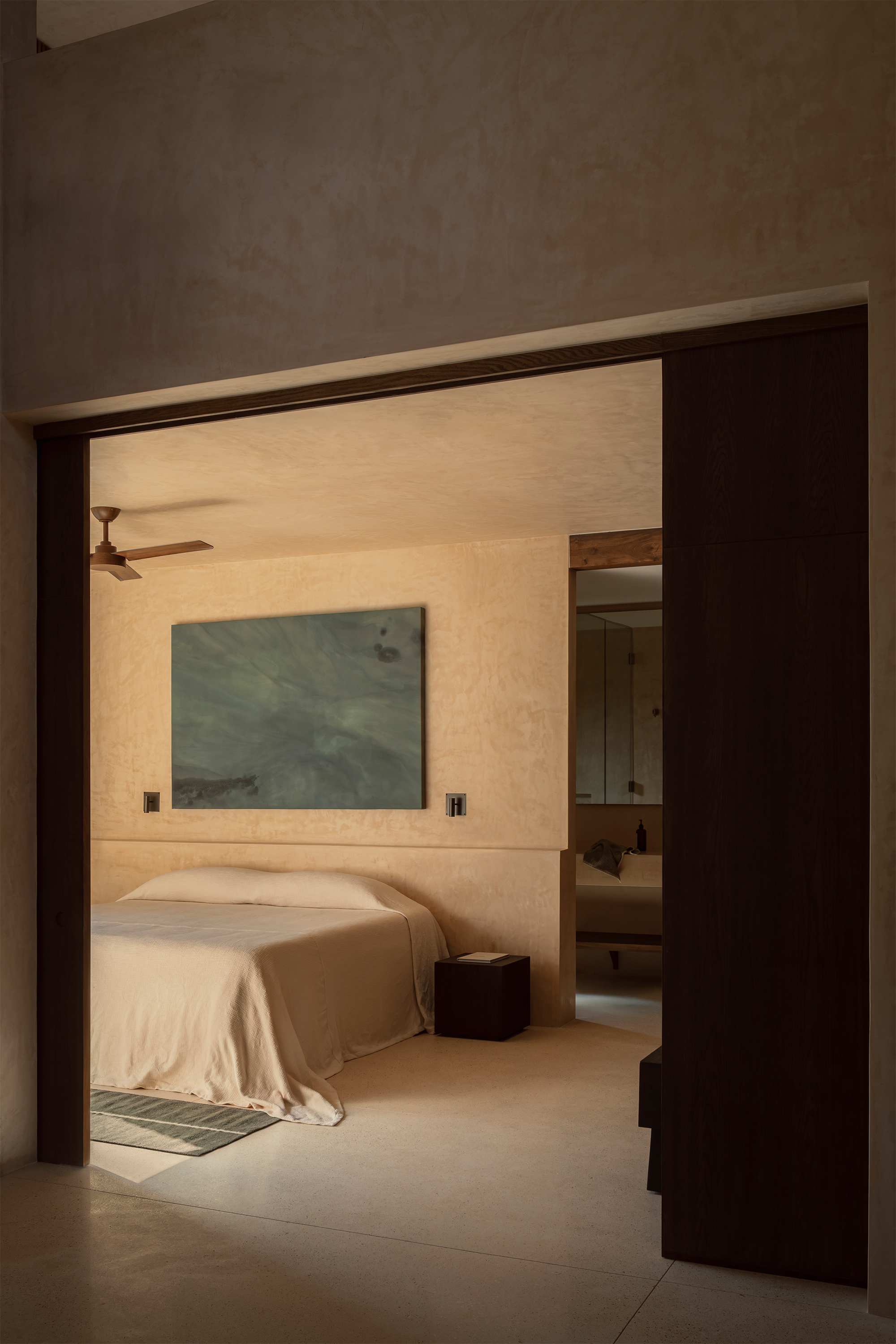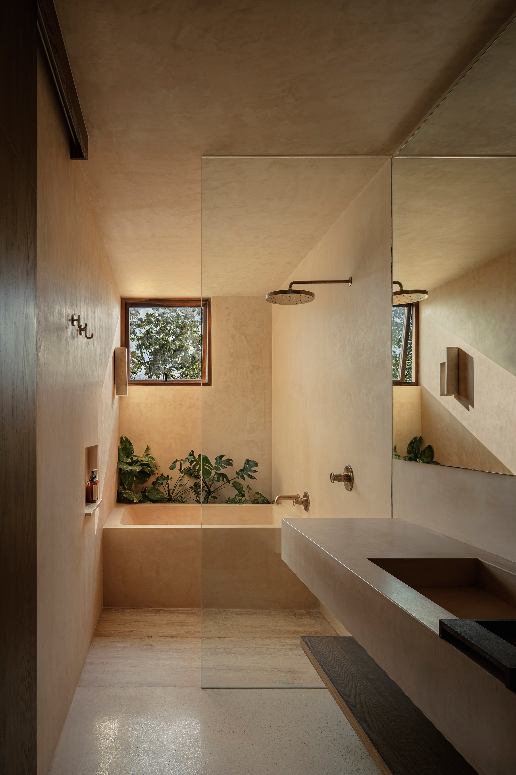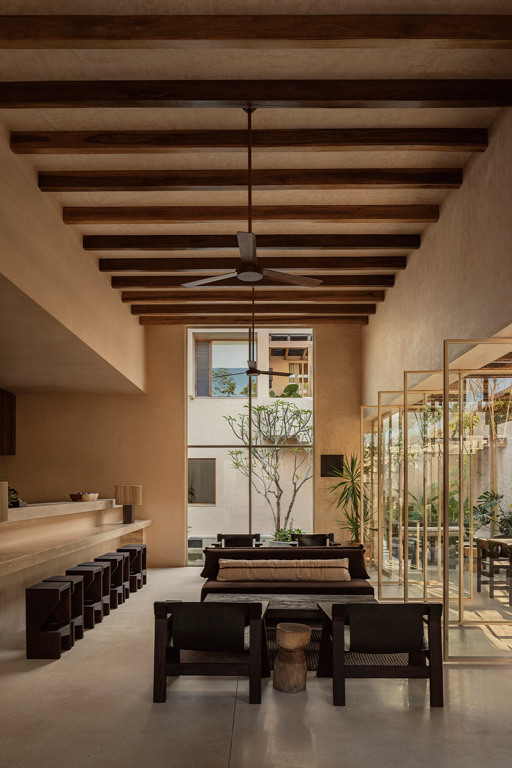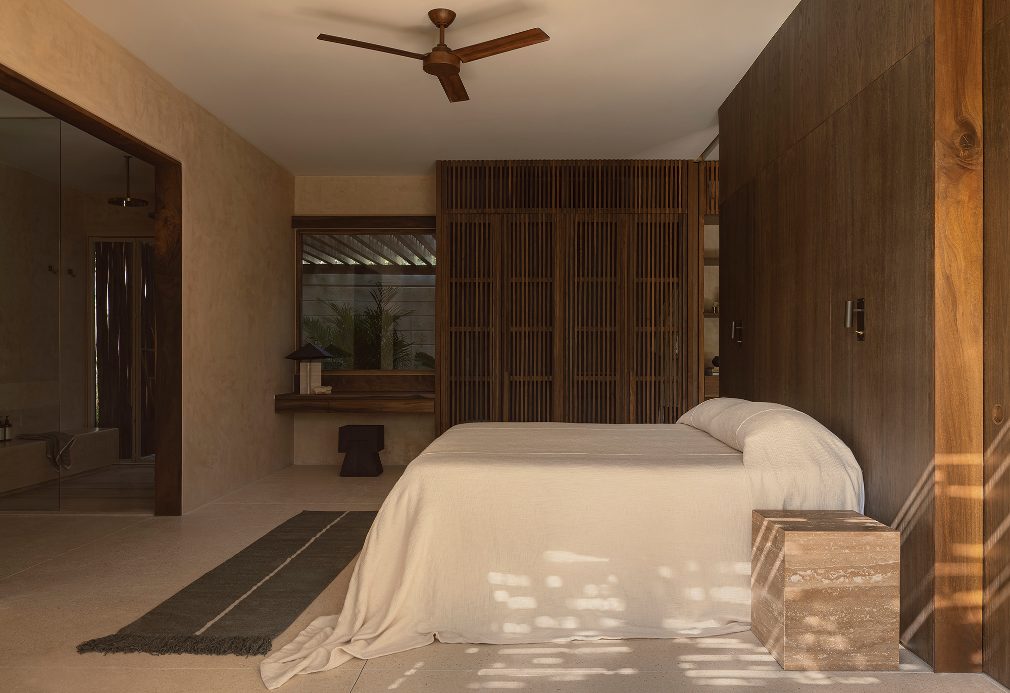 The hotel features 10 rooms, distributed in two different typologies. The ground-floor units follow a horizontal spatial composition that encourages a direct connection with the surroundings through outdoor terraces and indoor-outdoor bathrooms. The upper floor rooms, offer a vertical reading, which includes a double-height social area and two bedrooms with ensuite bathrooms, resolved through a mezzanine. The result is spacious, well-ventilated interiors that perform adequately in Tulum’s warm and humid climate.