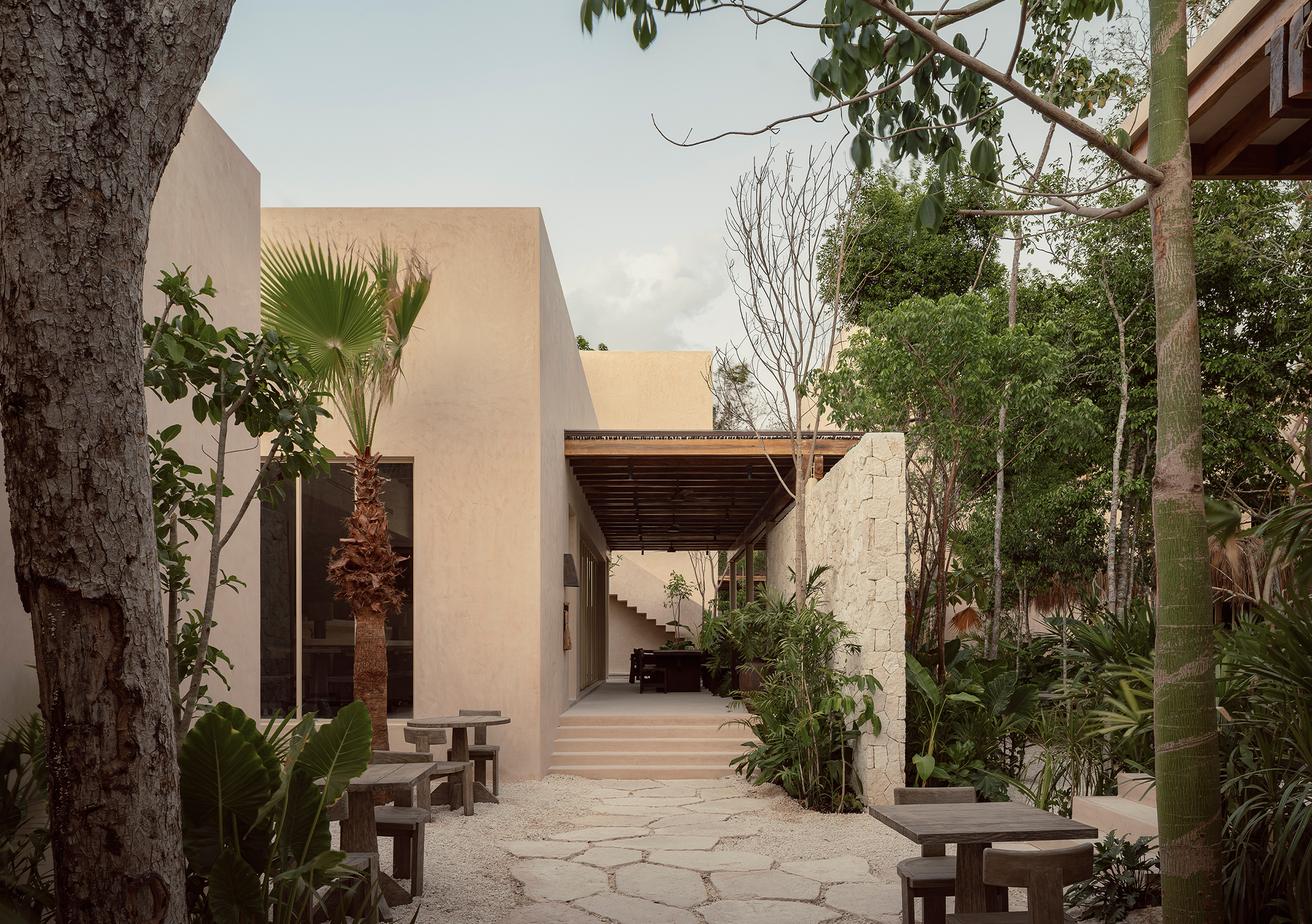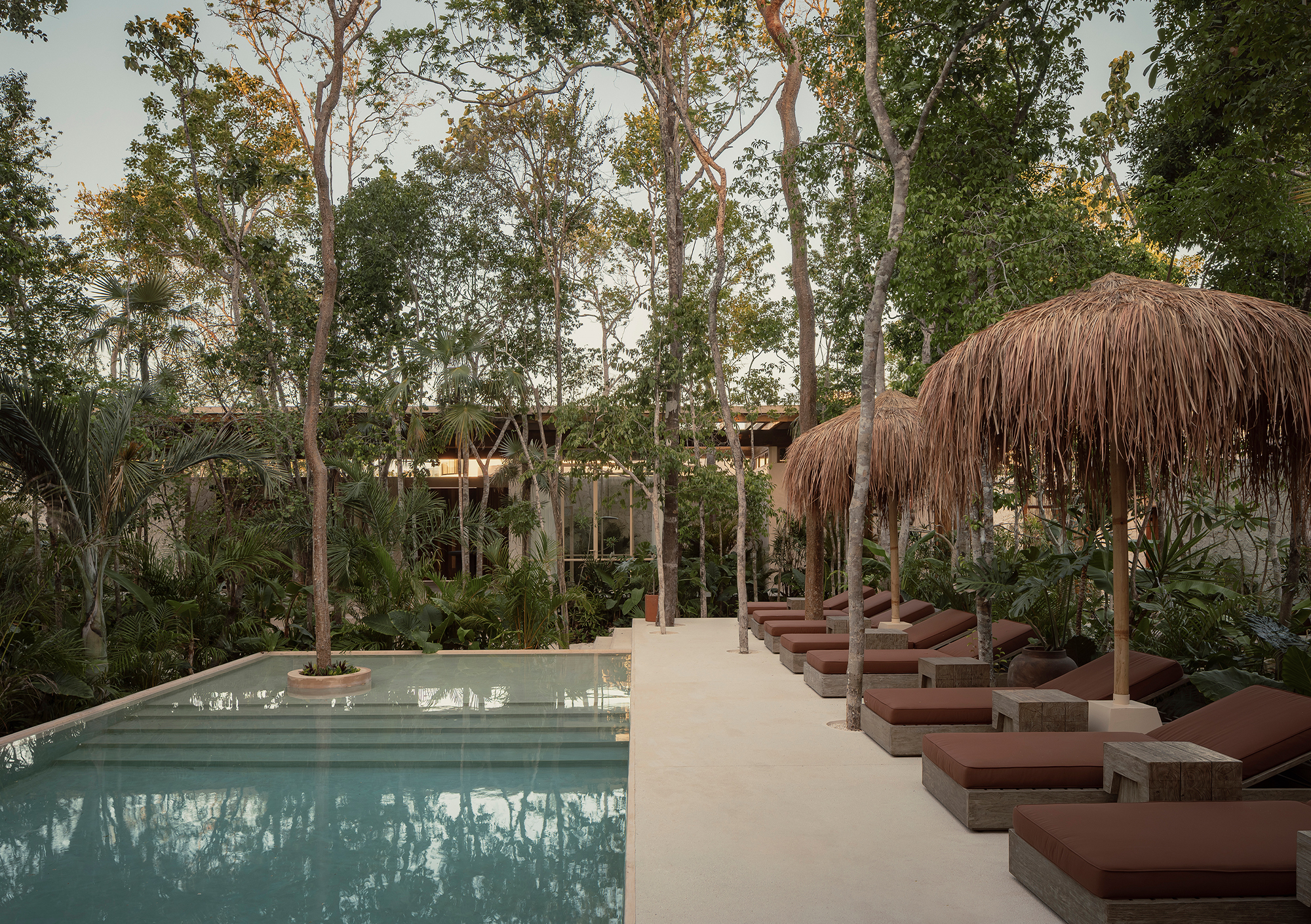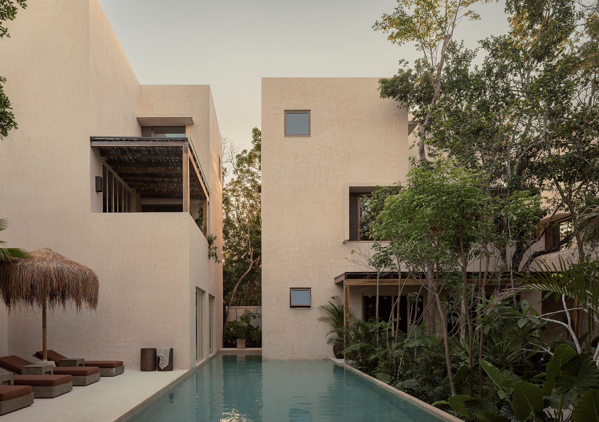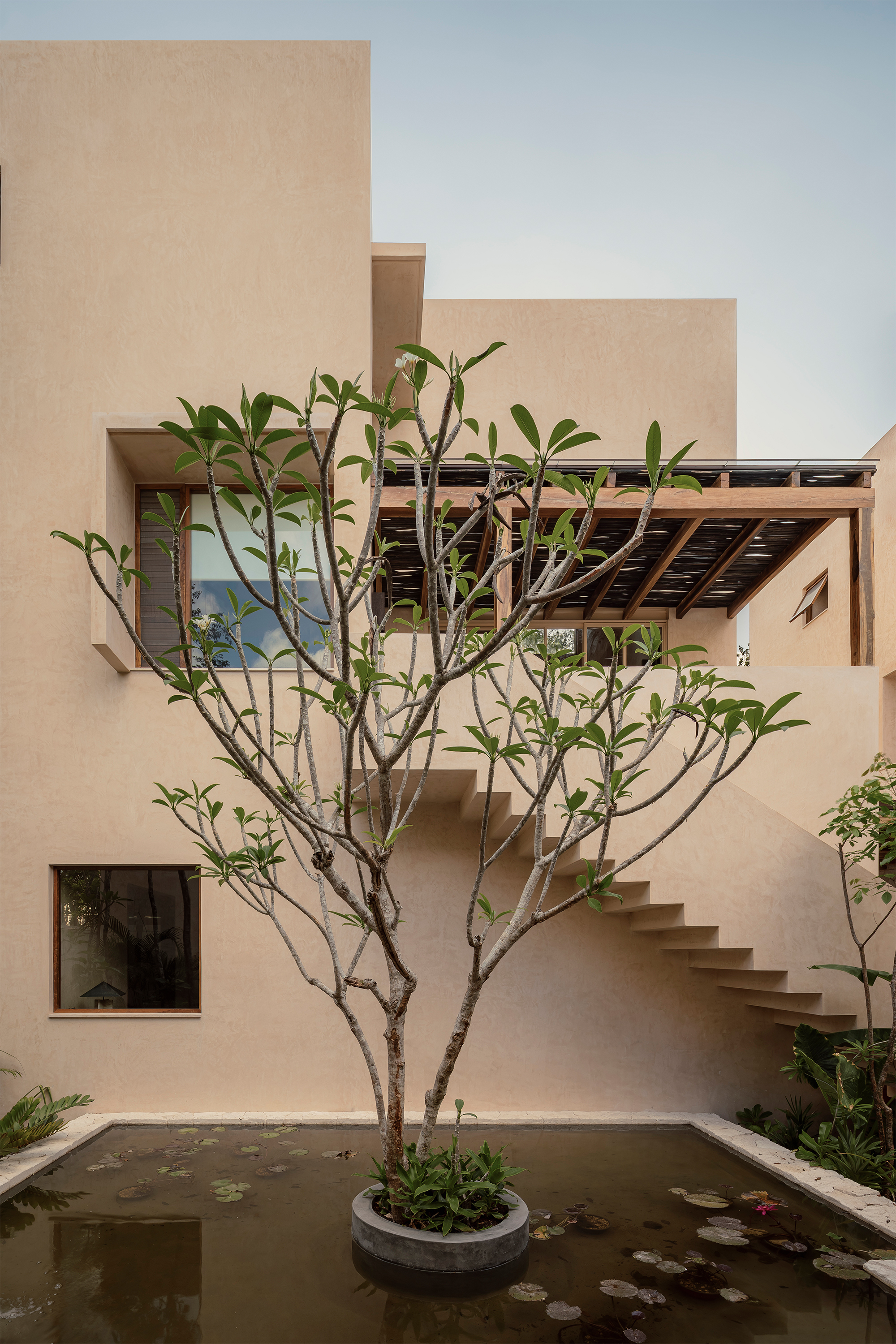 The volumes are arranged around the pool and the tropical garden, which act as the central organizing element of the project. This layout gives the complex an introspective character, creating a microclimate that ensures privacy and fosters the development of a distinct identity.