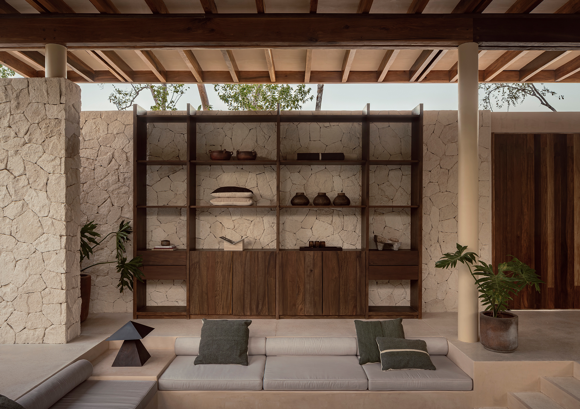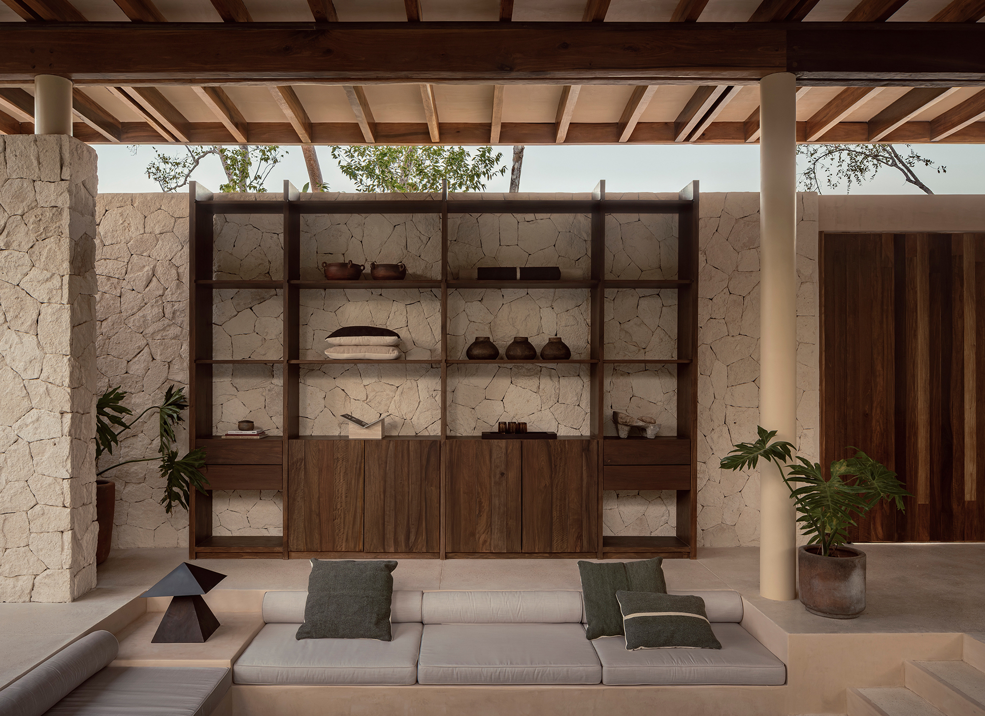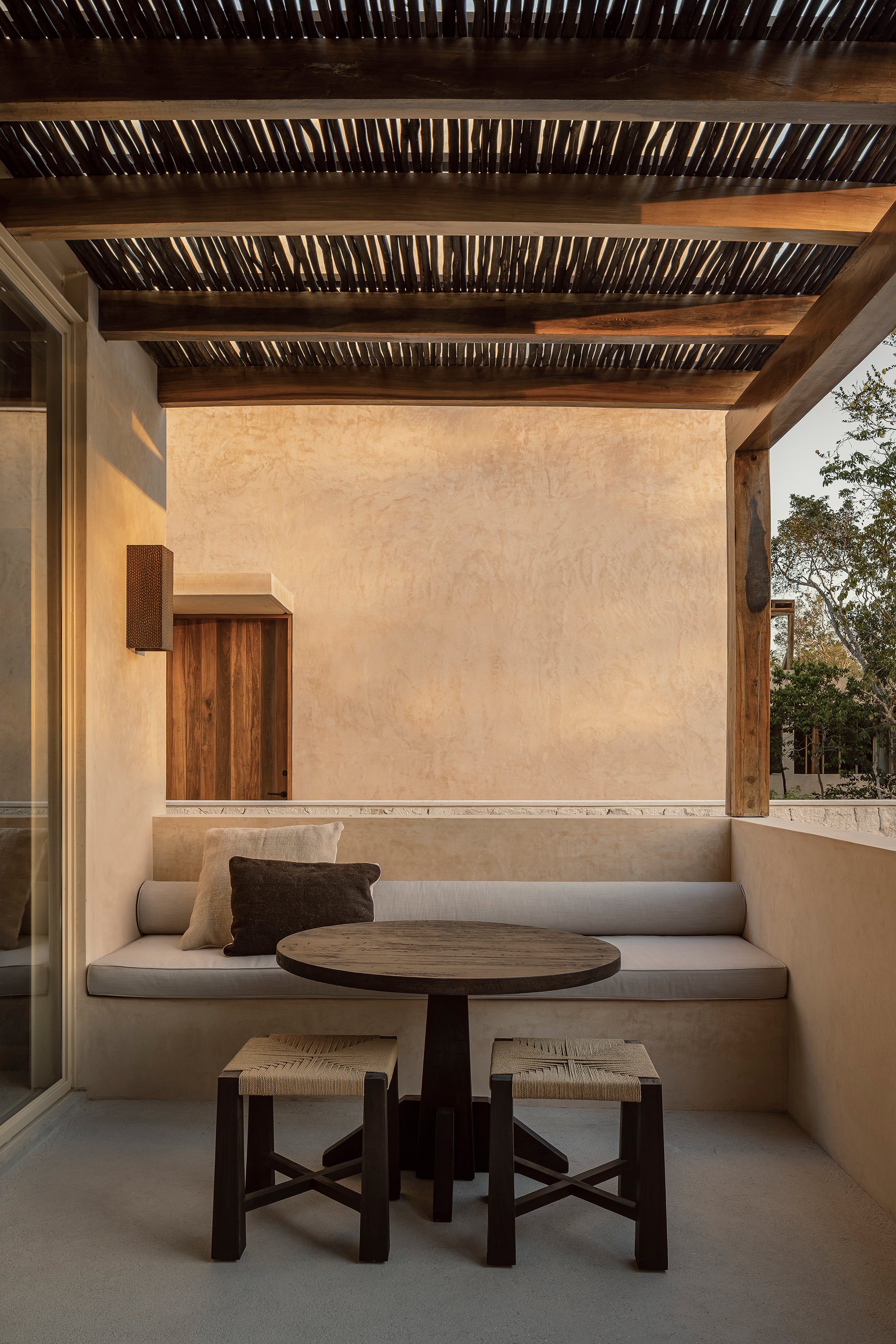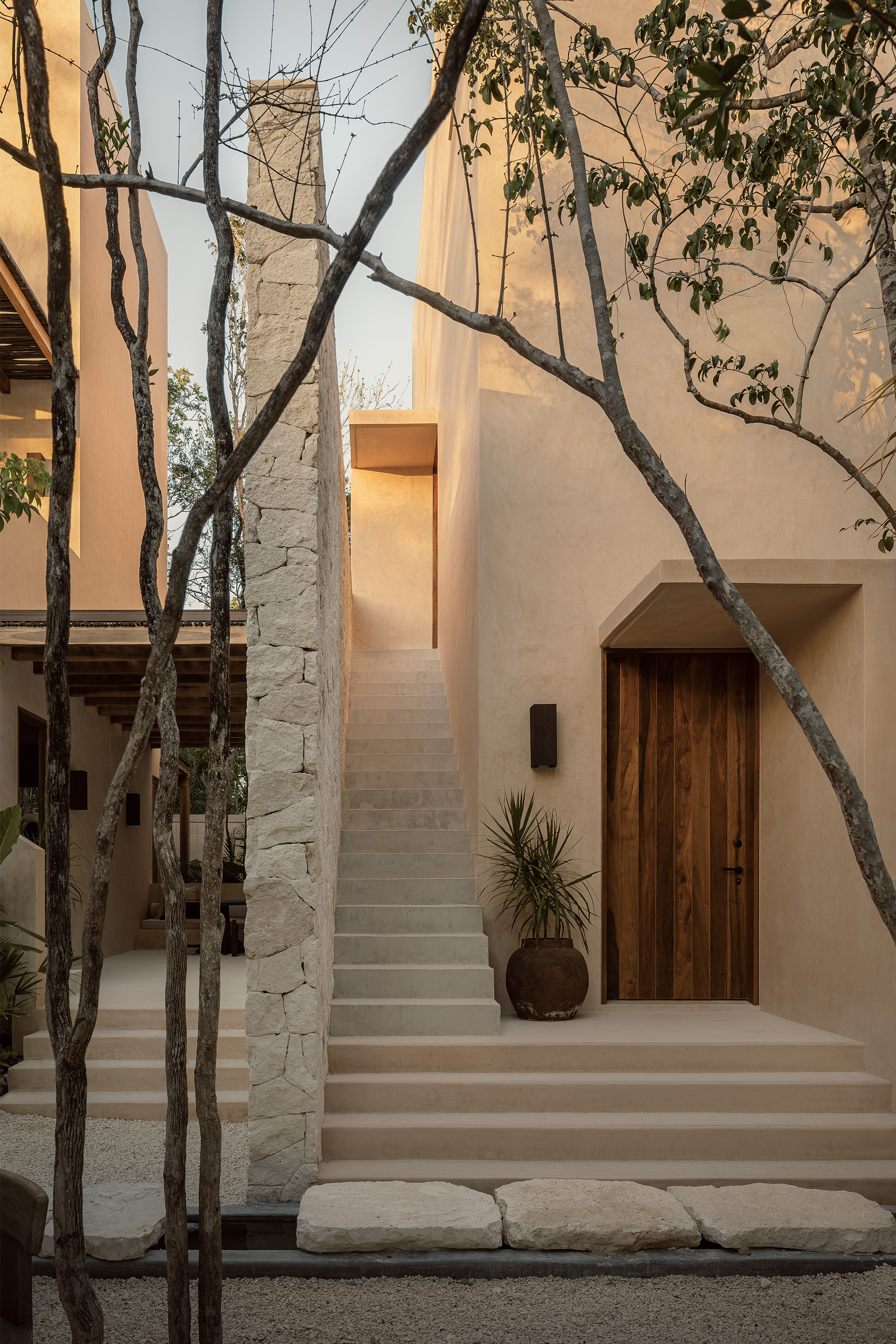 The finishes throughout the project feature natural tones and textures, including wood, limestone, travertine marble, and chukum. The spatial composition is guided by principles of passive design and draws inspiration from the region’s vernacular architecture. At Naboa, the pursuit of simple solutions, slow-paced atmospheres, and sensory-rich details defines the architectural approach.