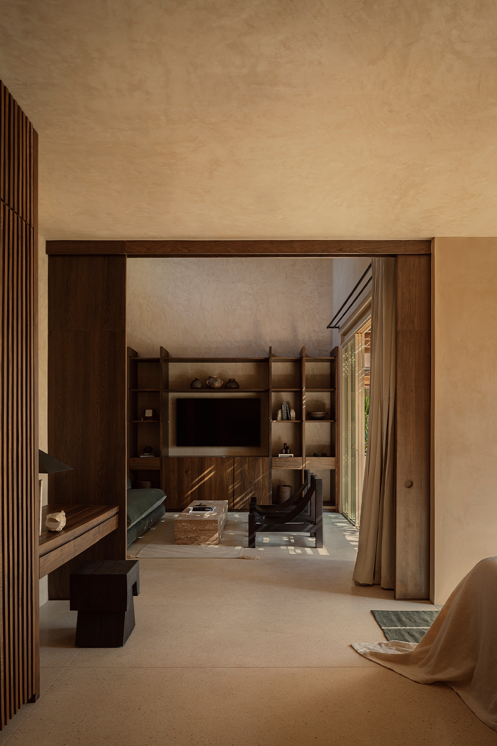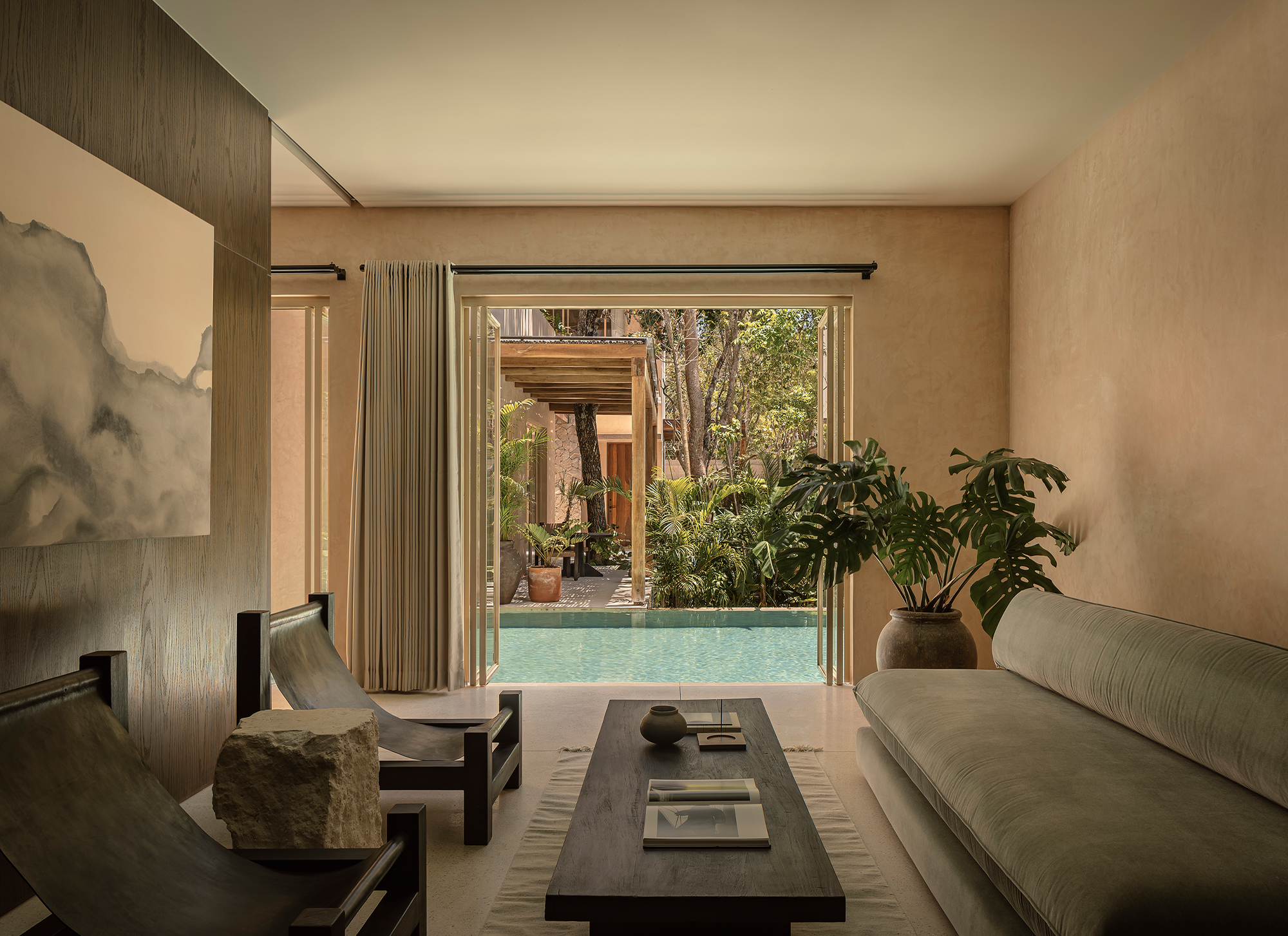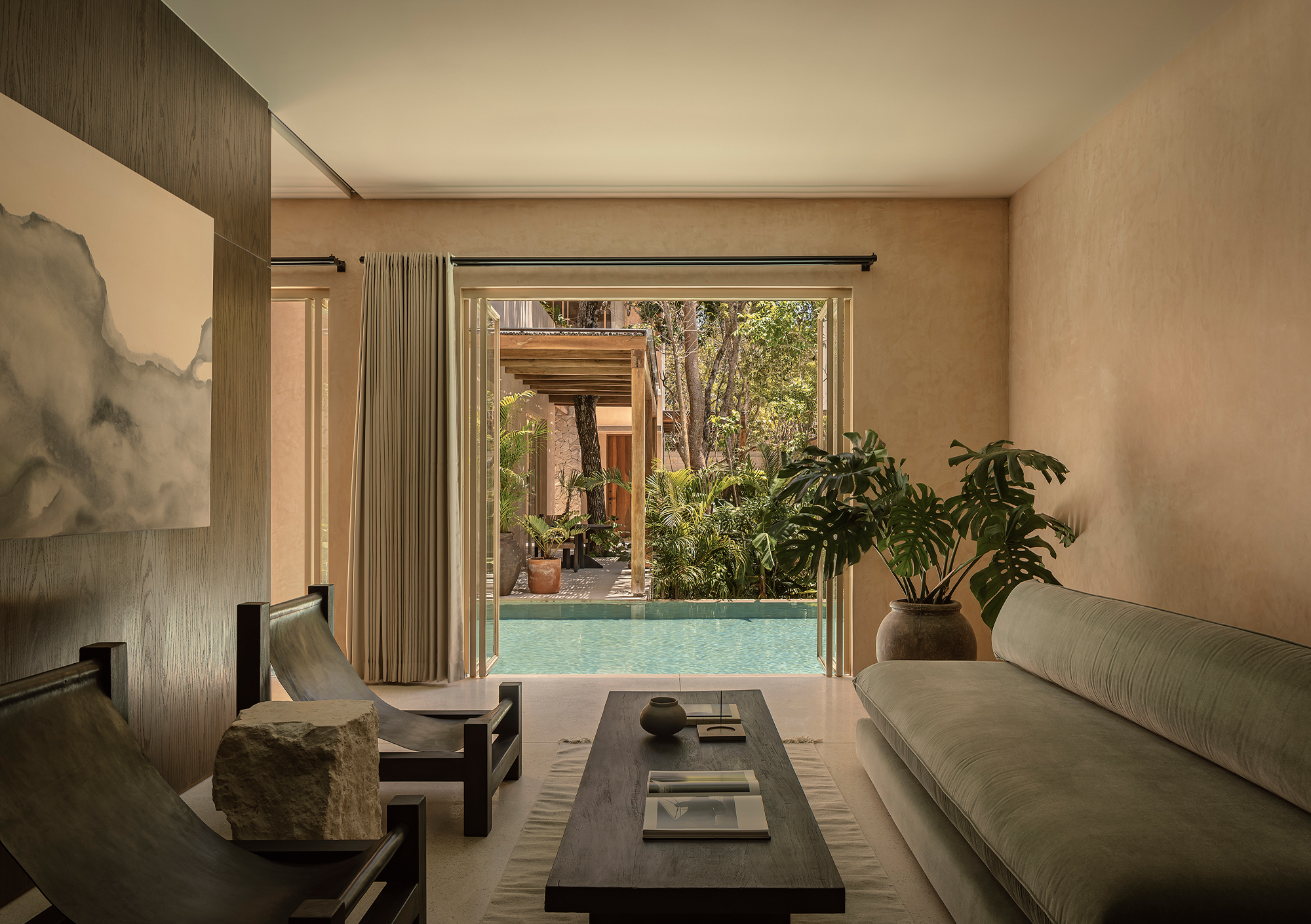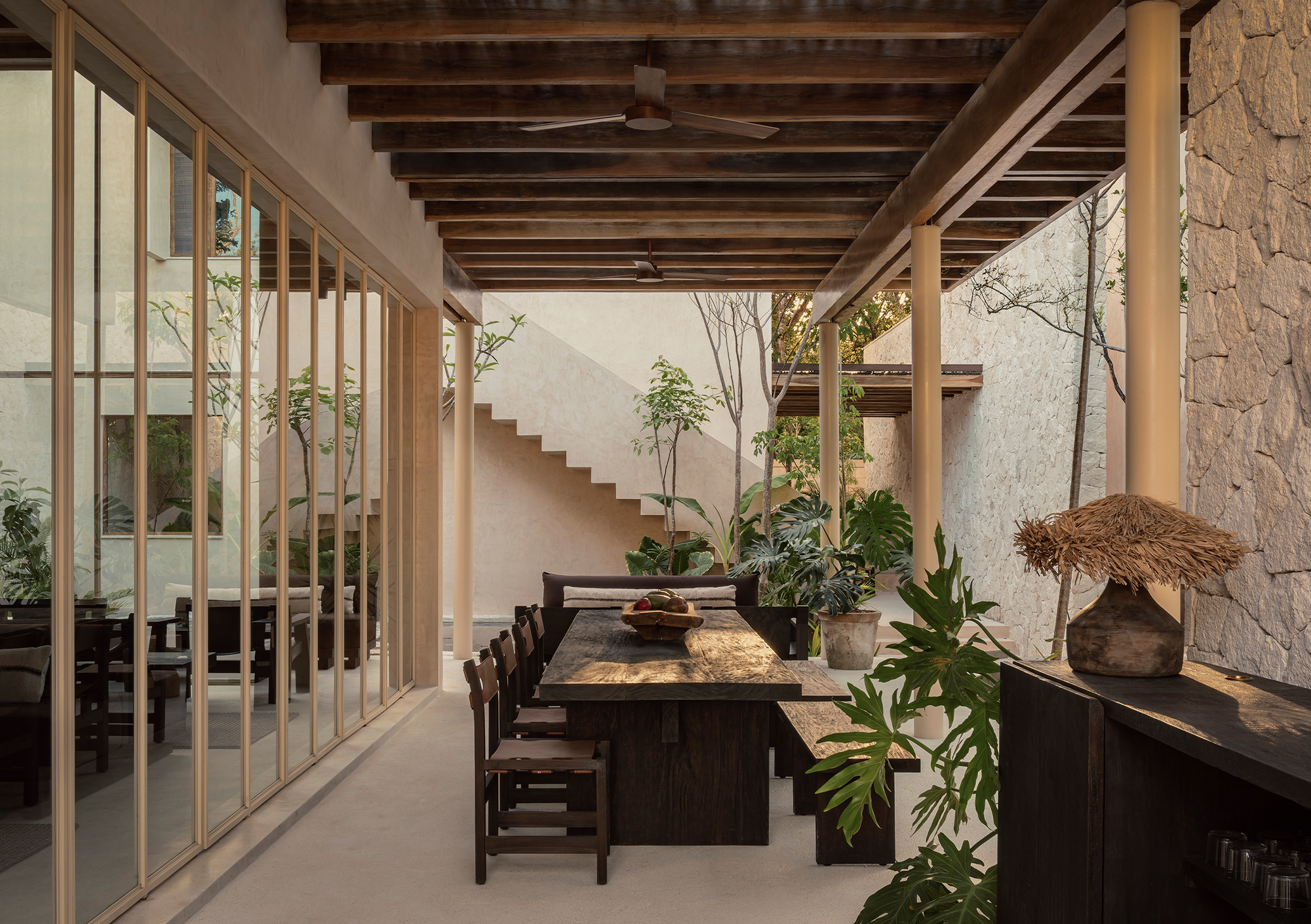 The finishes throughout the project feature natural tones and textures, including wood, limestone, travertine marble, and chukum. The spatial composition is guided by principles of passive design and draws inspiration from the region’s vernacular architecture. At Naboa, the pursuit of simple solutions, slow-paced atmospheres, and sensory-rich details defines the architectural approach.