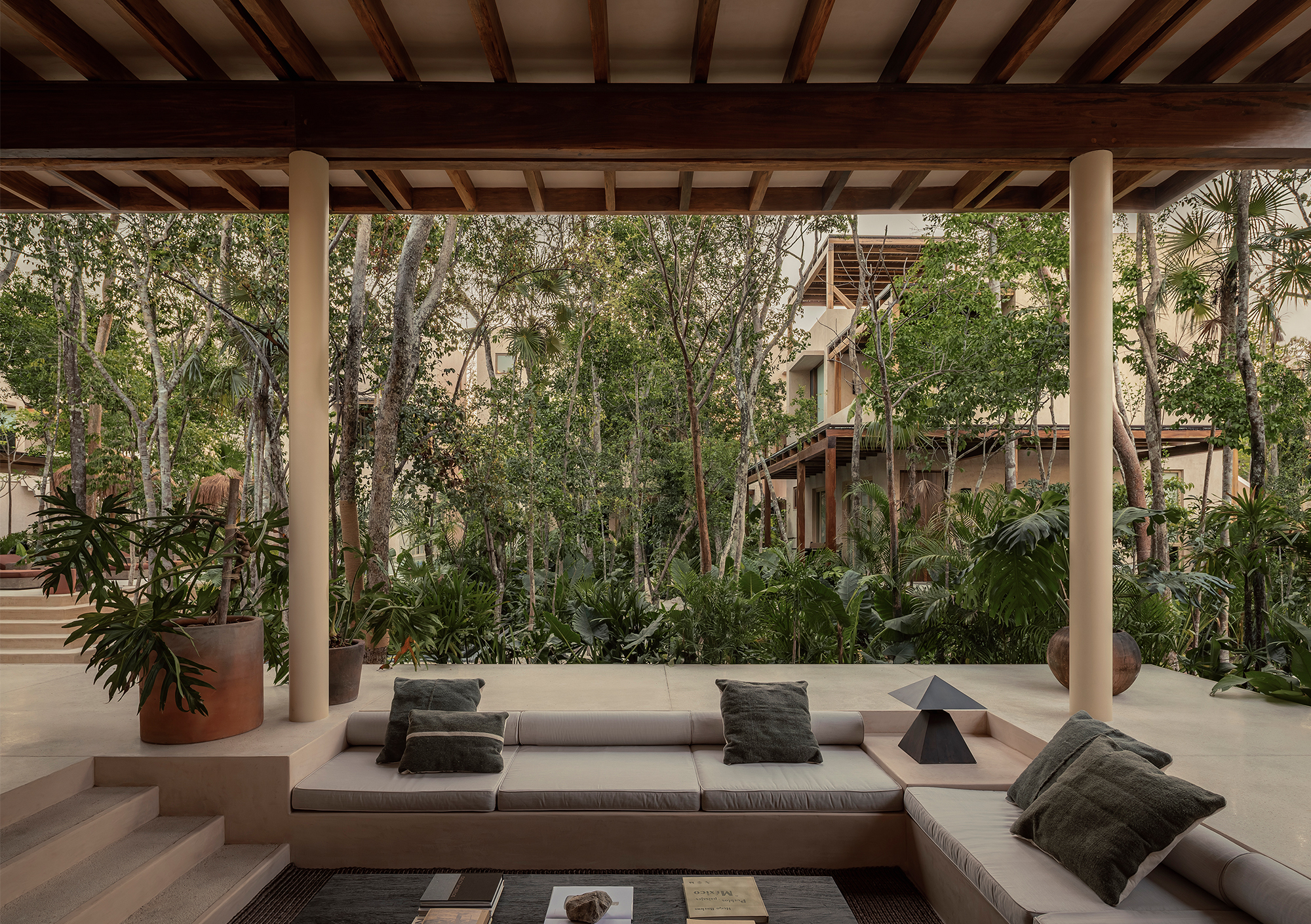 Located in Tulum, on a square plot of 2,500 m2, Naboa was conceived with the premise of creating a project where architecture and landscape converge in an atmosphere of relaxation and comfort. This intention materializes through pure and orderly geometries that contrast with the pre-existing untamed vegetation.
