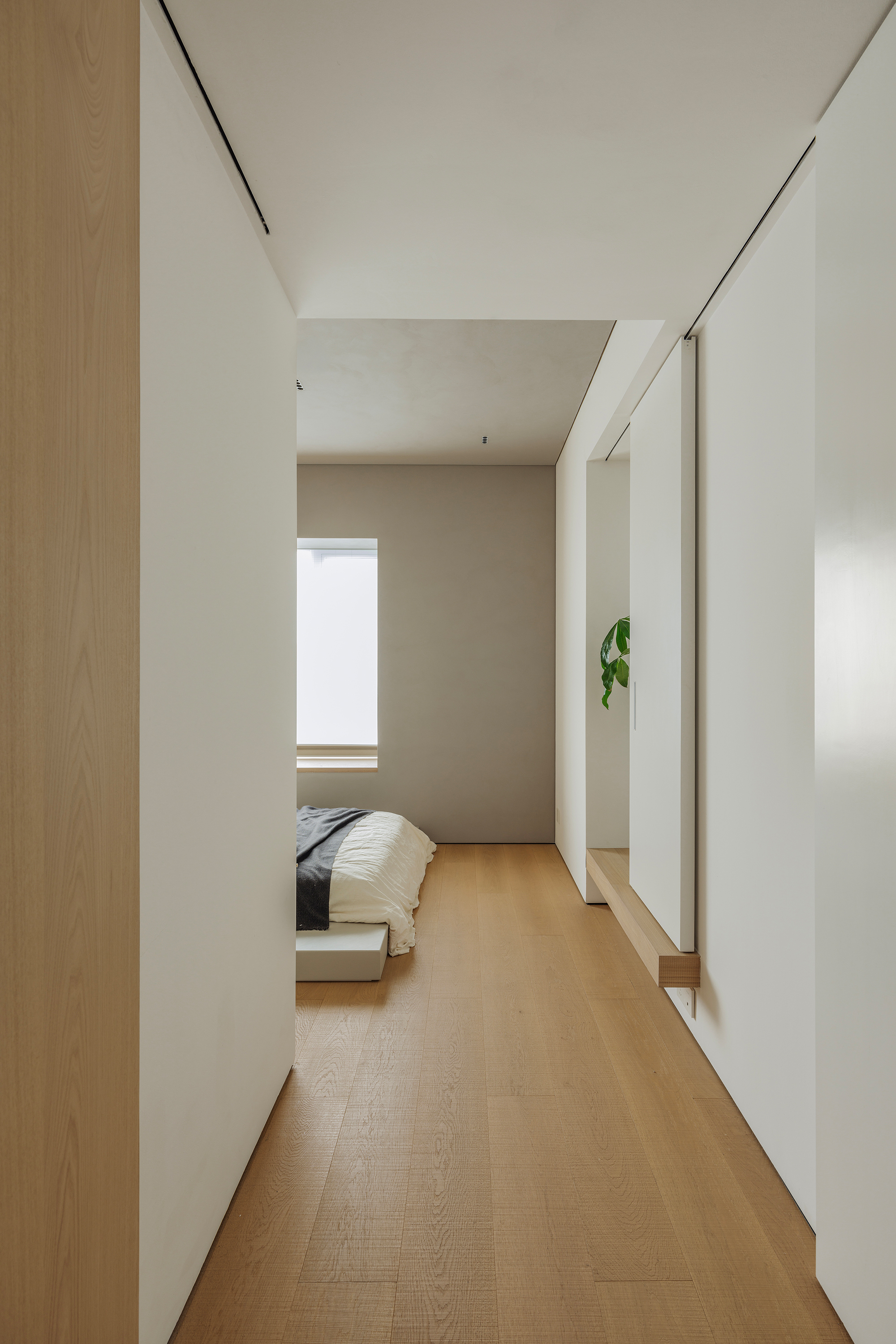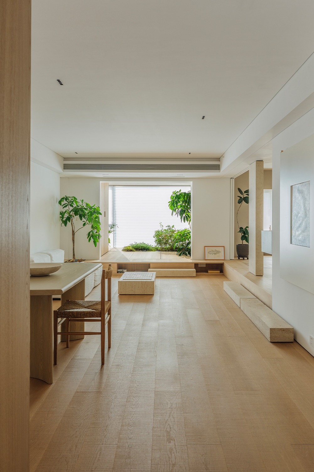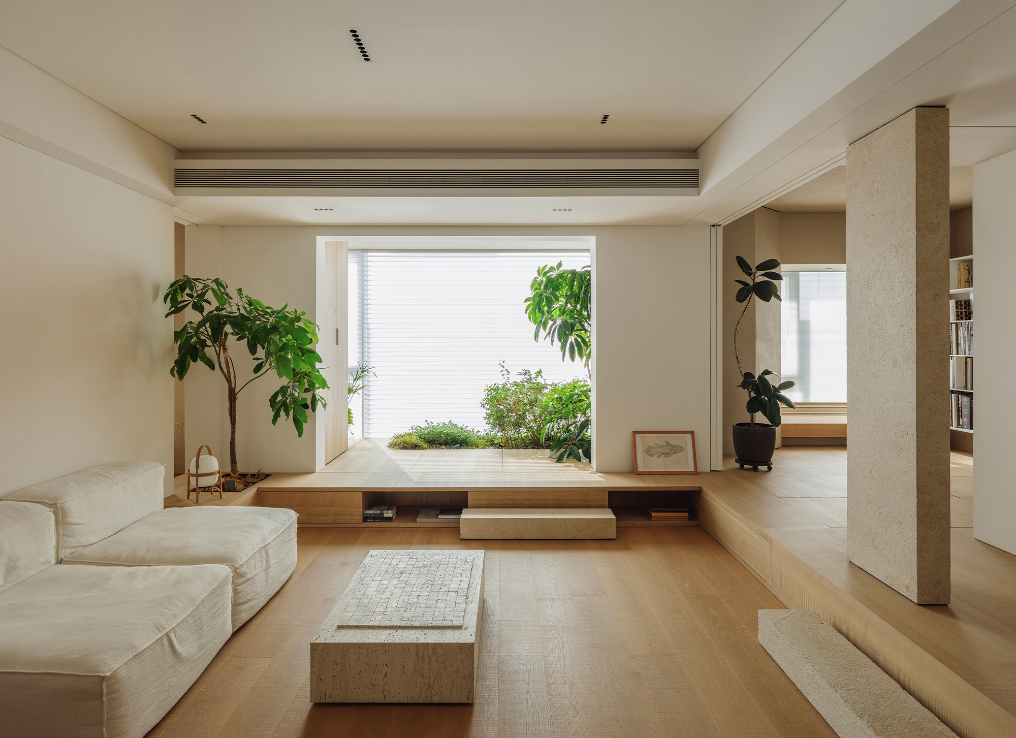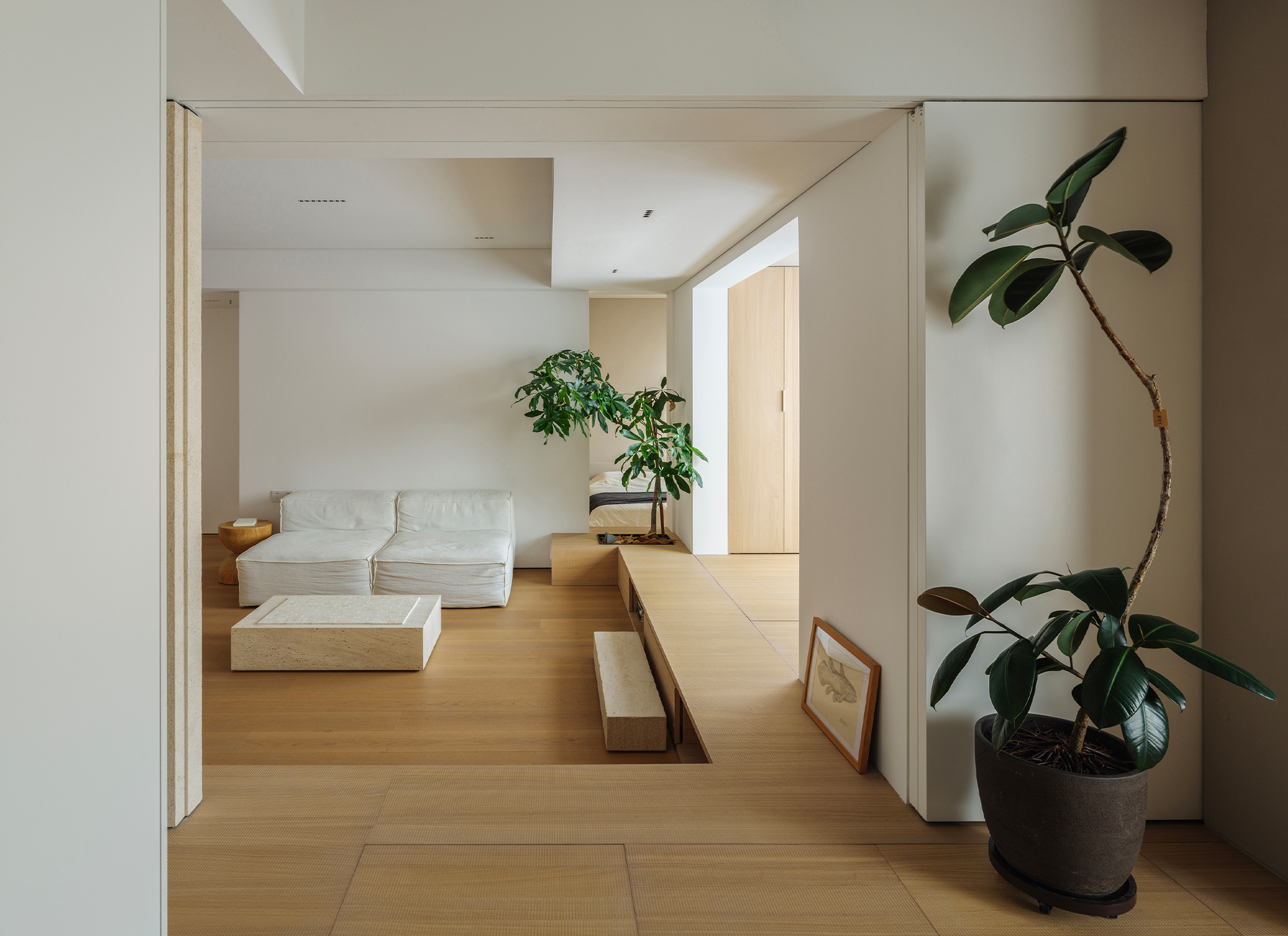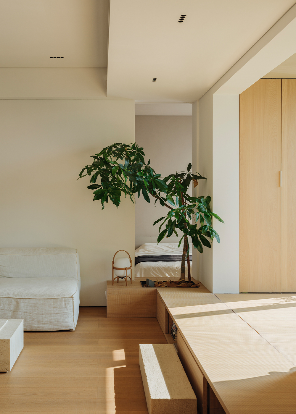 By adjusting the scale, the original hallway space is integrated into the bedroom area, extending the transition from the dynamic zone to the quiet zone. The boundary between the bedroom and living room is defined by a low platform and flexible sliding doors, inspired by the traditional indoor-outdoor relationship of the East. This approach eliminates enclosure, creating fluid spatial connections. The sunken space, combined with partially concealed greenery, blurs the lines between interior and exterior, fostering a tranquil and pure atmosphere rooted in nature. With the opening and closing of the space, a sense of freedom is nurtured, linking the room to the ‘wild.’