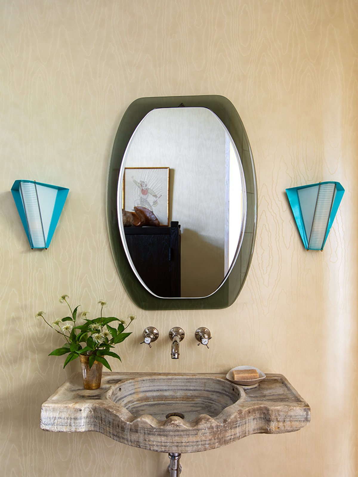 “I aspire to that kind of layering—rich and textured but very personal,” Driver says. To wit, the living room in Driver’s home is a worldly pastiche of collectibles old and new, manifesting as a spontaneous and synergistic tableau. A rather prim Fritz Hansen midcentury settee, covered in lush Liberty floral velvet, offers a level of decorum offset by the humorous geometry of Ettore Sottsass’s famous Tahiti lamp, a playful postmodern interpretation of a flamingo.