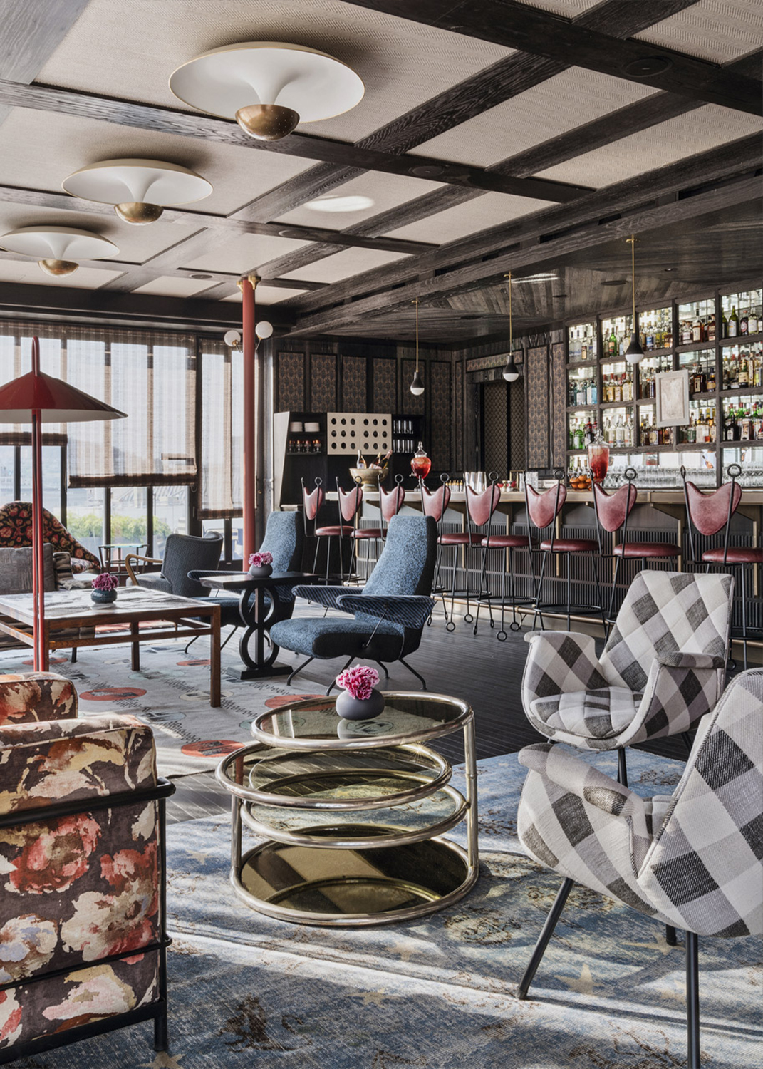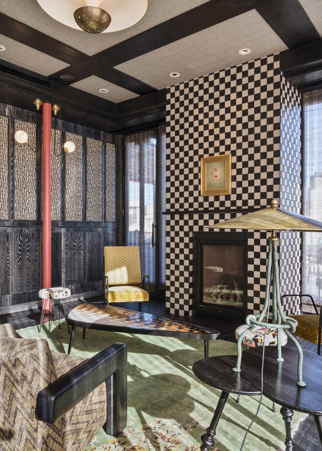 The dynamic, streamlined ebonized wood and brass bar at one end of the interior space is appointed with a row of crimson leather and wrought iron bar stools while the vista at the other end centers on a checkerboard tiled fireplace with distinctive seating areas of a reimagined European salon. At every turn are unique vintage furnishings inspired by historical, iconic designers such as Jean Royère, Gio Ponti and Adolf Loos, and richly patterned vintage rugs that bring additional warmth and residential layering atop ebonized walnut floors.
