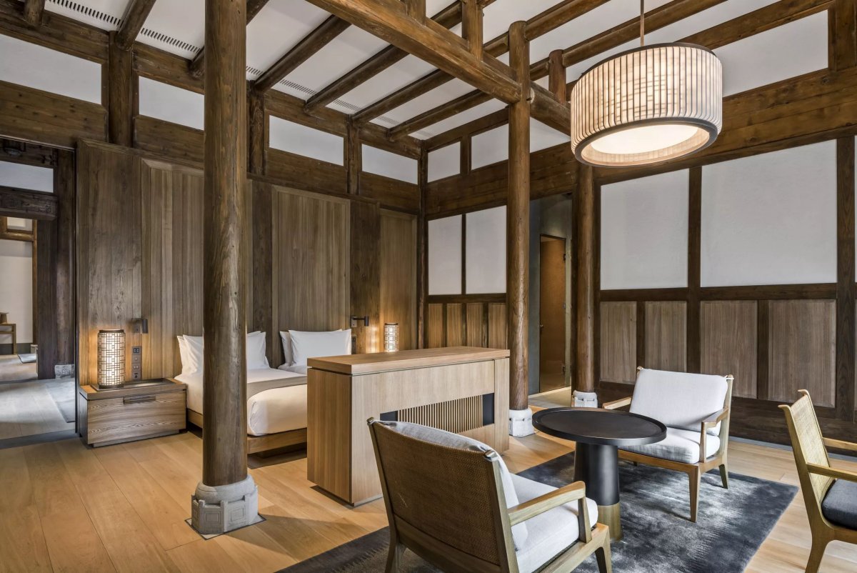 The restored buildings comprise the hotel's 24 guest rooms, 43 villas and public spaces.The hotel includes a cultural centre offering guests an education in Chinese cultural activities. In addition to the amenities of the resort, each private residence includes a large flexible multi-purpose level which has been designed to include a state-of-the-art gallery, cinema, gym, tea-room and wine cellar.The layout of the hotel is based on the concept of "a walled village" consisting of several courtyards surrounded by guest rooms, a common Chinese housing typology.