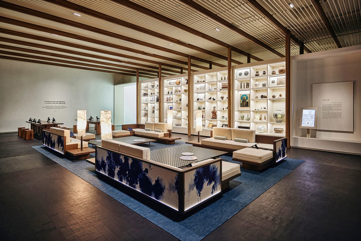 The second part is the donation exhibition hall. All the exhibits inside are mostly donated by people voluntarily, so that the public can better understand the past history of Korea. The exhibits are placed in the center of the room, where carefully designed warm lighting makes the exhibits the visual center of the space, while the surrounding dim light and retro colors add a sense of gravity.