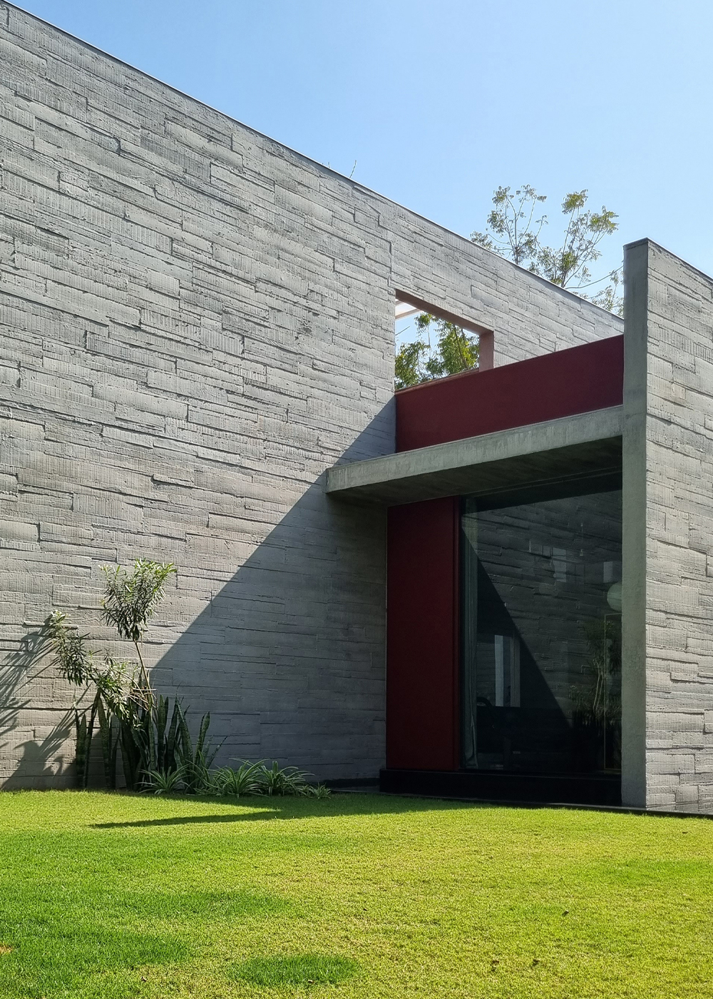 The building is cast from waste in a rough wood shuttering (now registered as an intellectual property of the Architects) that compliments the trees in the horizontal cut direction. It has no continuous vertical or horizontal joint that is normally seen in form finished concrete, making the walls into textured planes catching various nuances of the sunlight on them. The floor is in cool dark Kudapah sand stone and the moving parts like doors and panels are cased in terracotta shades. The epitome of this moving feature is a custom designed main door with counter rotating top and lower panels making for an element of delight.