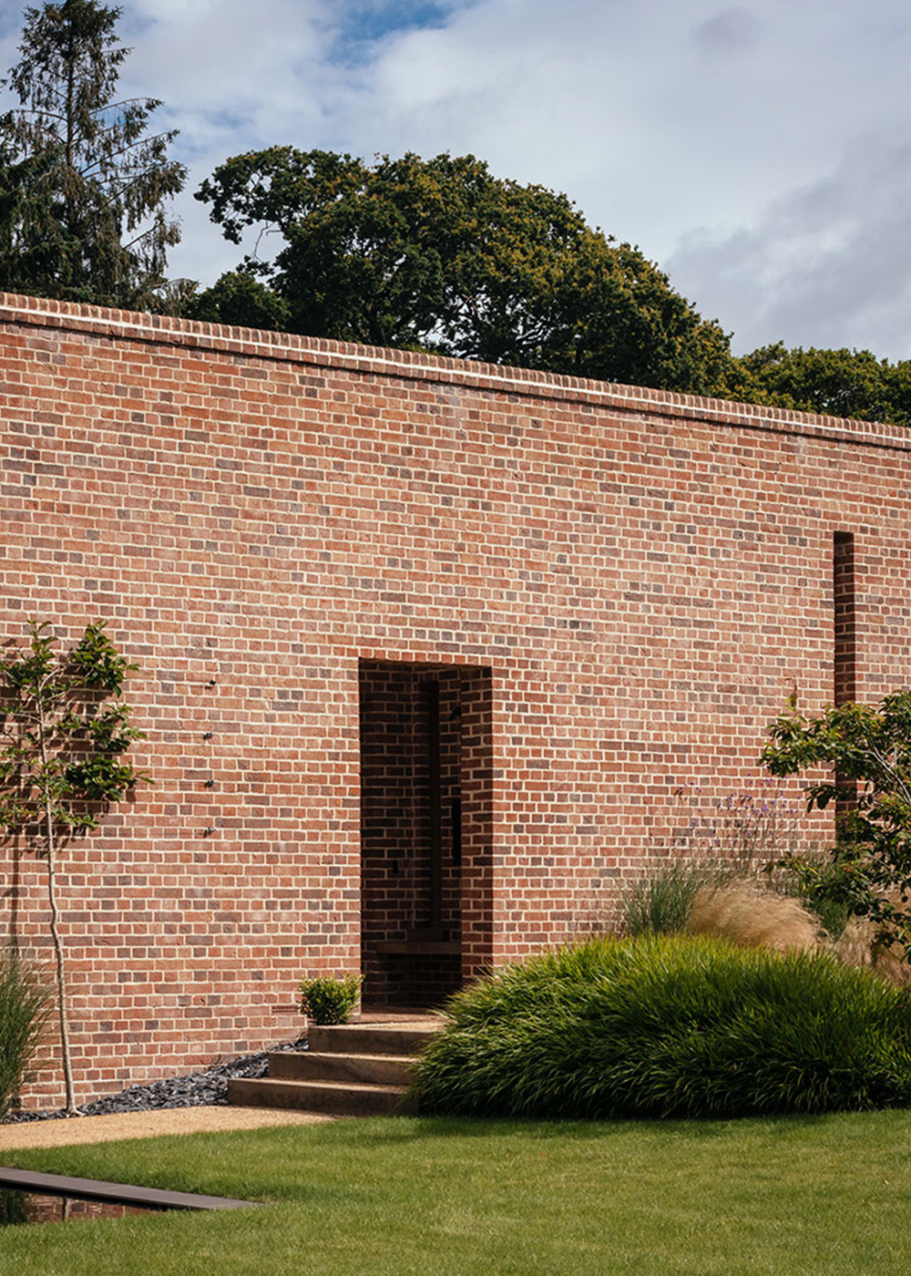 Planning permission for this project was granted under Paragraph 79, the Country House Clause, with a design that draws inspiration from its surroundings. With architecture and interiors by McLean Quinlan, the overall composition is simple and clean. An elegant brick front complements the brickwork of the old garden wall and a discrete front door opening references the gate in the garden wall. Further down, an oriel window breaks through, hinting at what is behind. Elsewhere, dark-rendered surfaces are designed to visually recede, allowing the surrounding garden to take precedence.