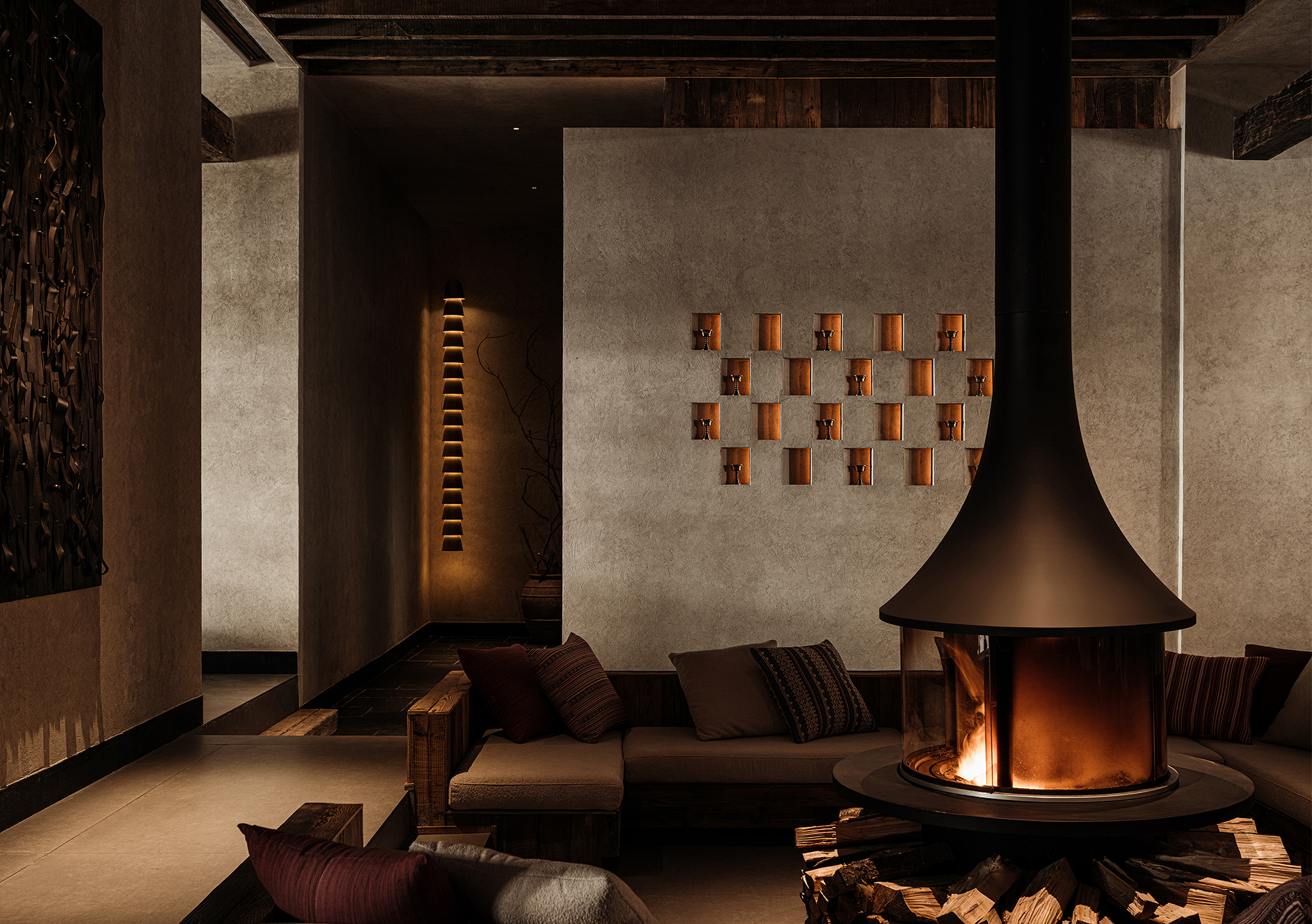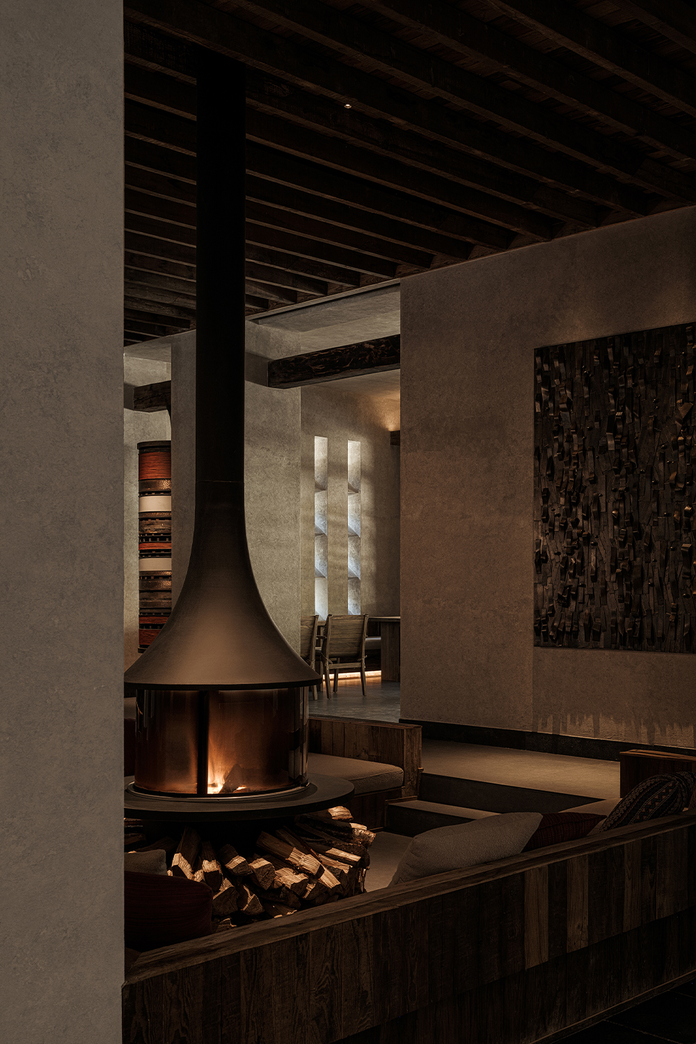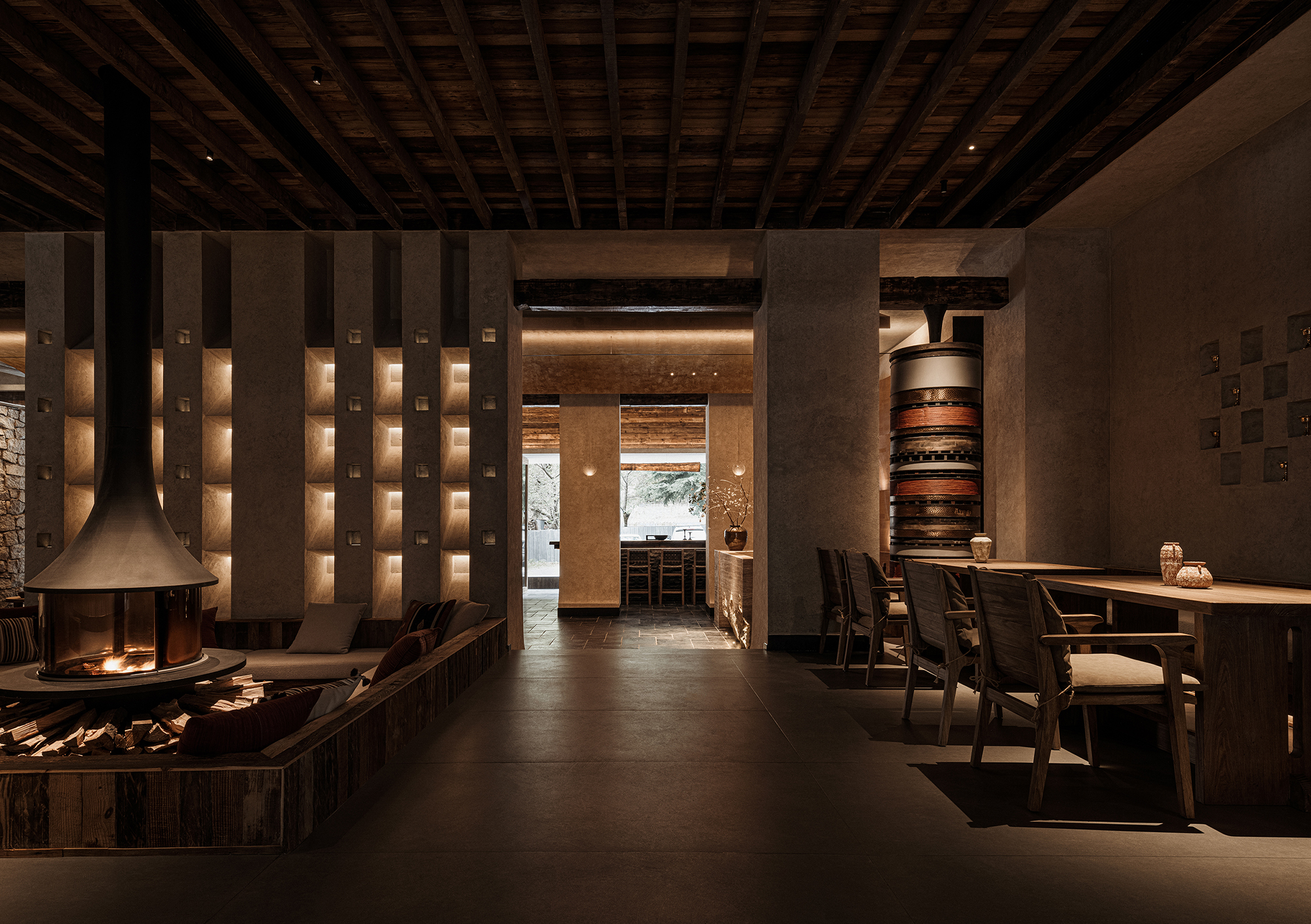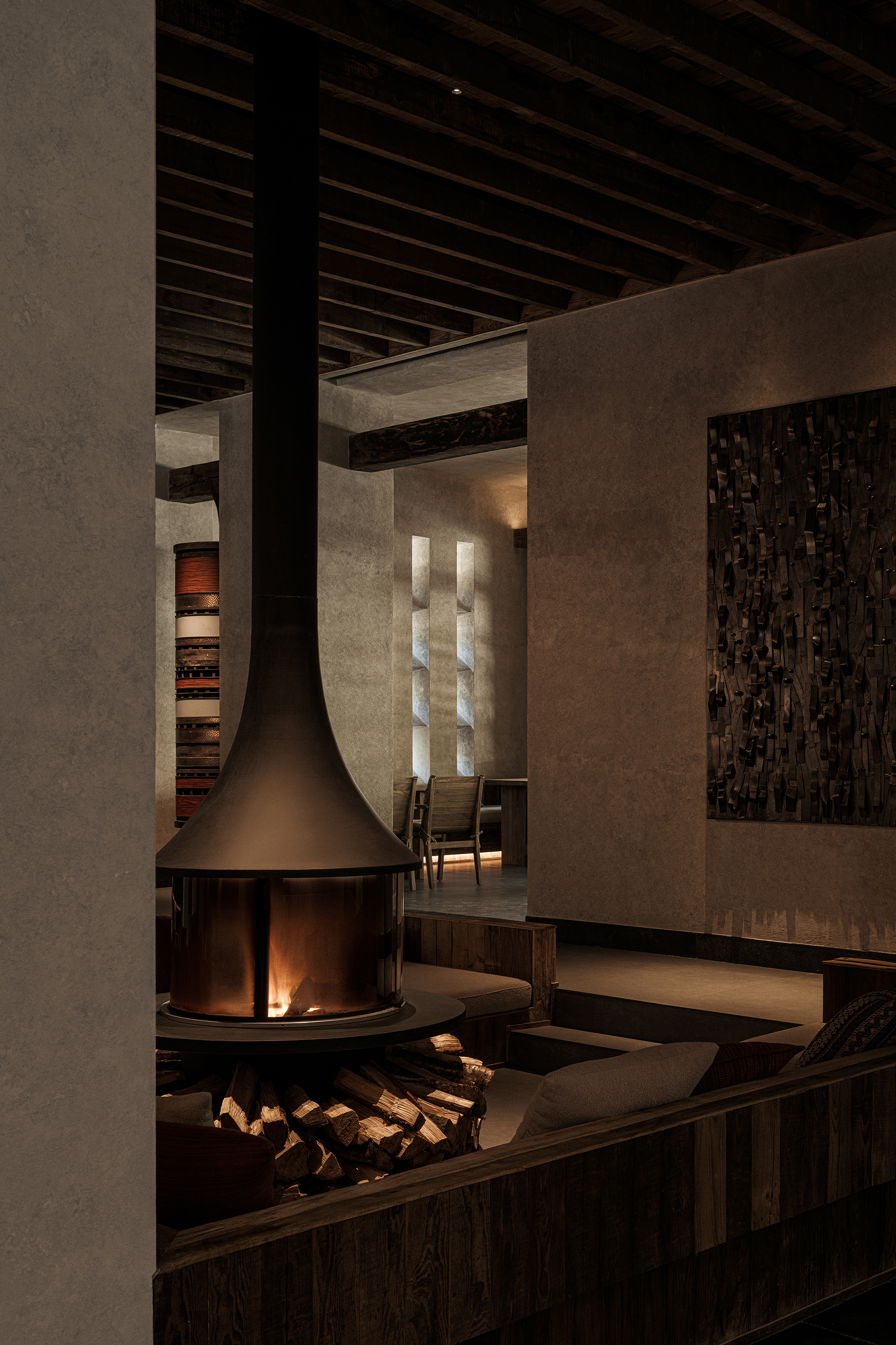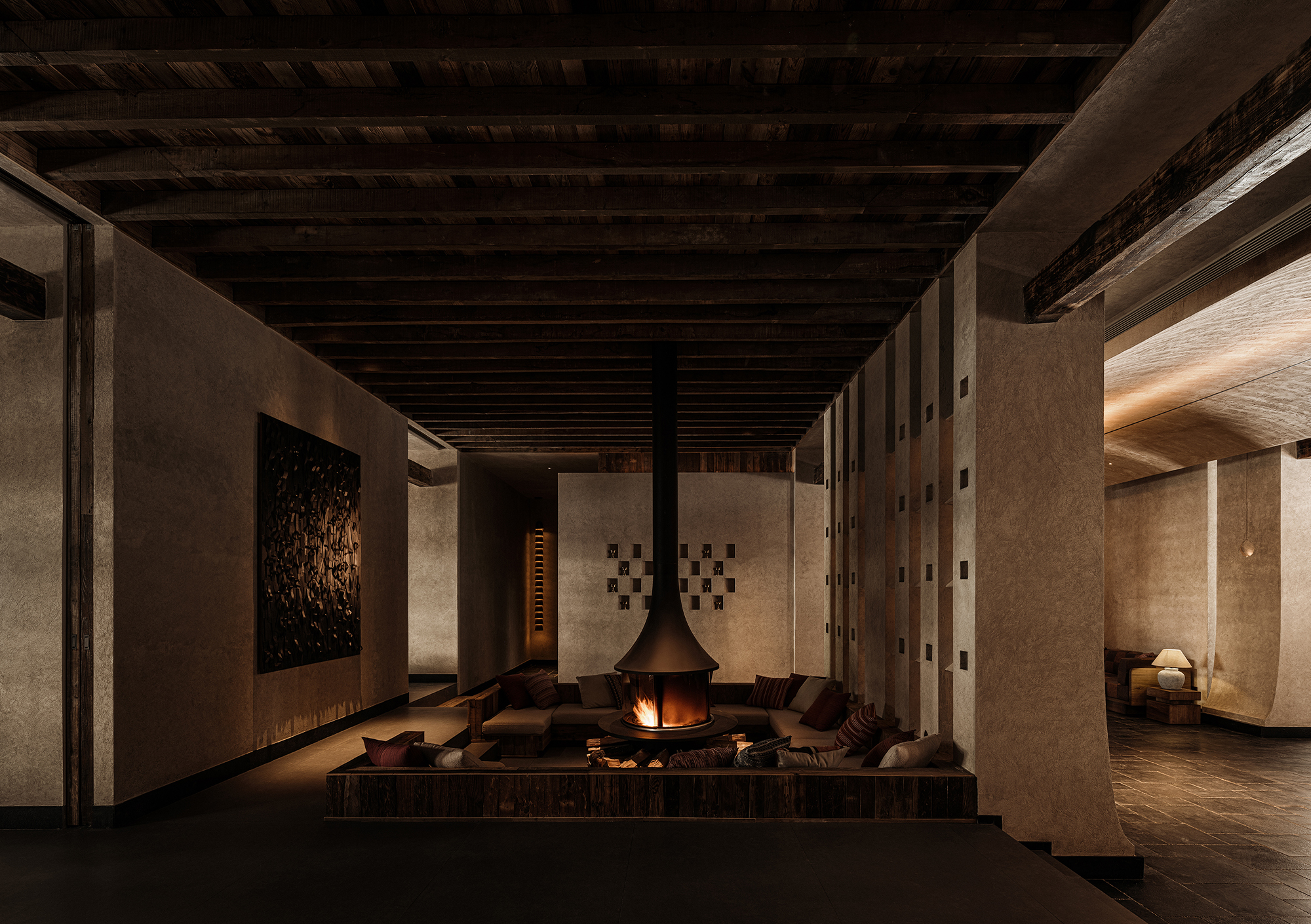 Fire was originally regarded as a microcosm of the sun. In other ancient civilizations, the sacred flame was always initially placed in a specific area before gradually being embraced by the living spaces of households. In Tibetan regions, daily life similarly revolves around the hearth. For Tibetans, fire is both material and spiritual—providing warmth and light. Here, the sunken hearth is emphasized by the space, creating a sense of cozy intimacy. The slightly dimmed surrounding light, the dancing flames within the hearth, and the crackling sound of burning wood all aim to offer a humanistic dimension that, while non-religious, still evokes spiritual resonance.