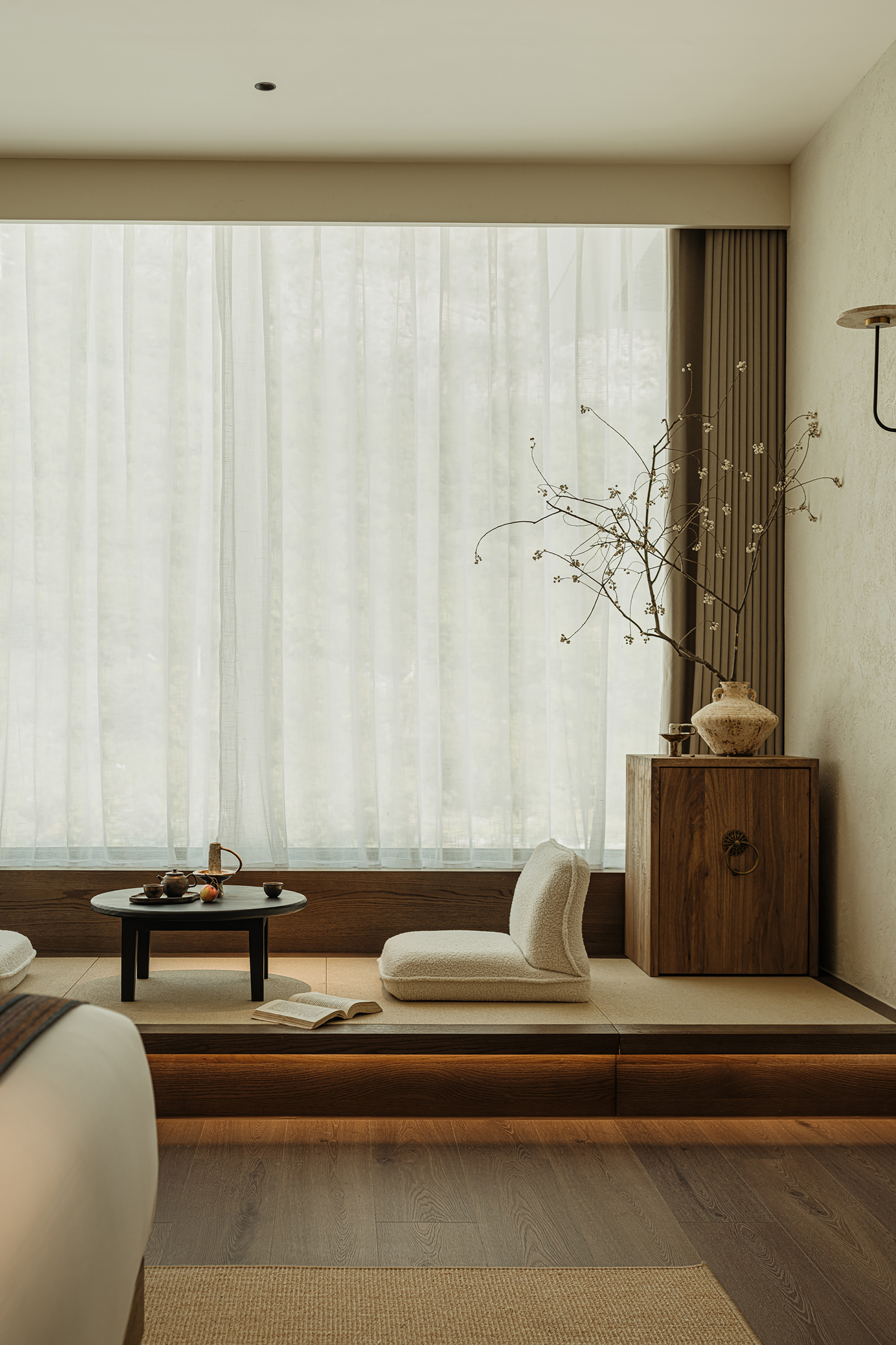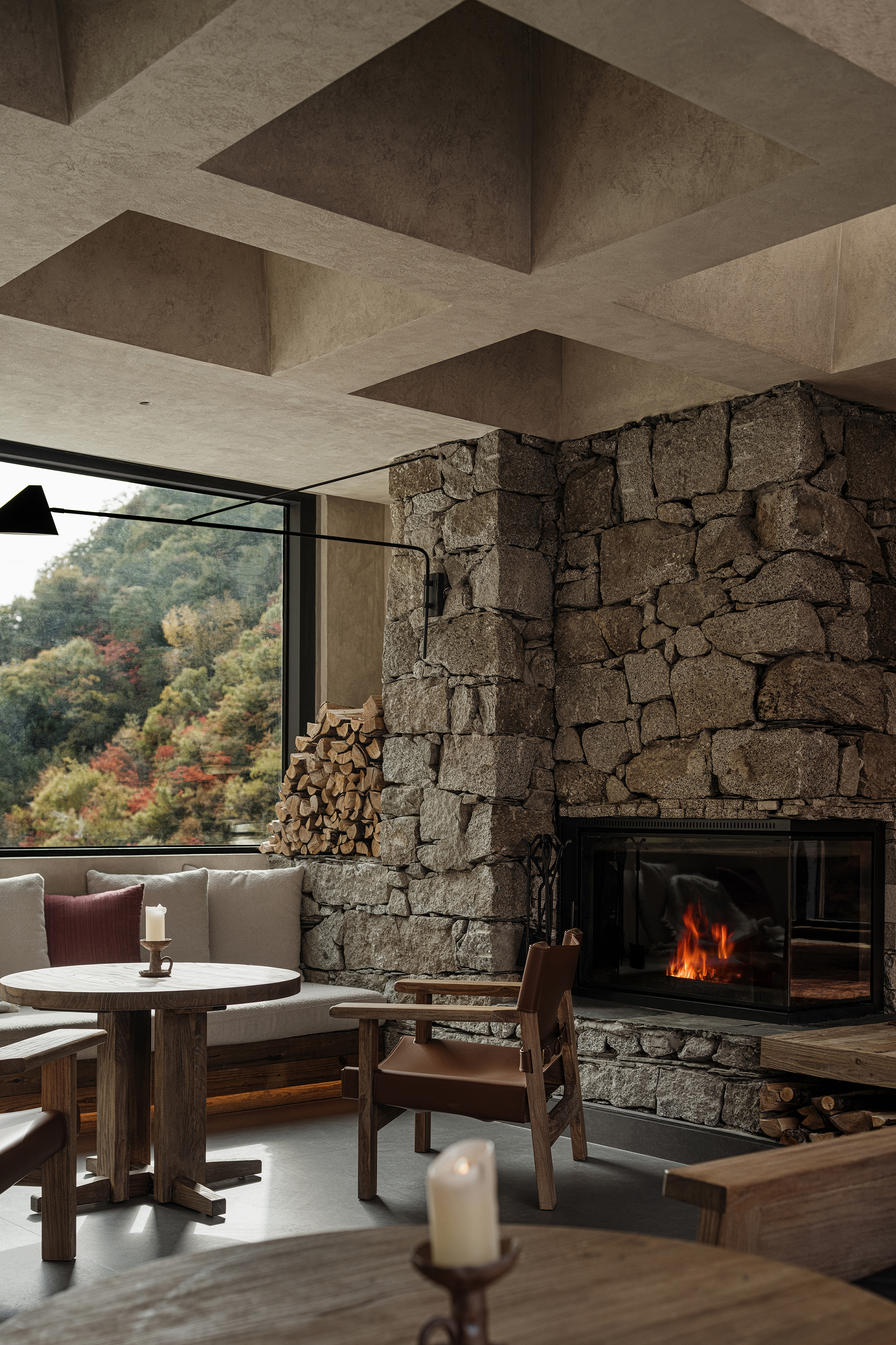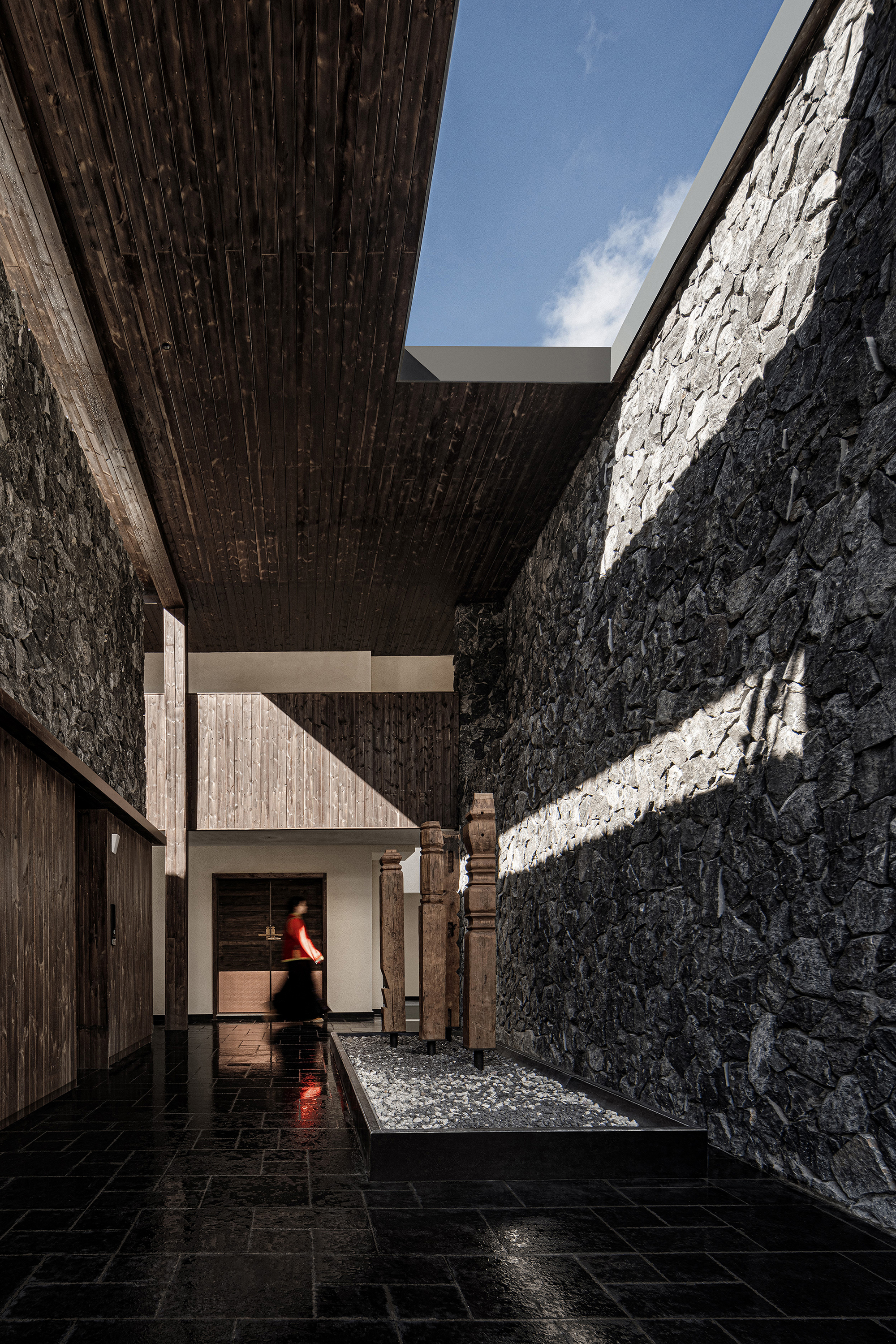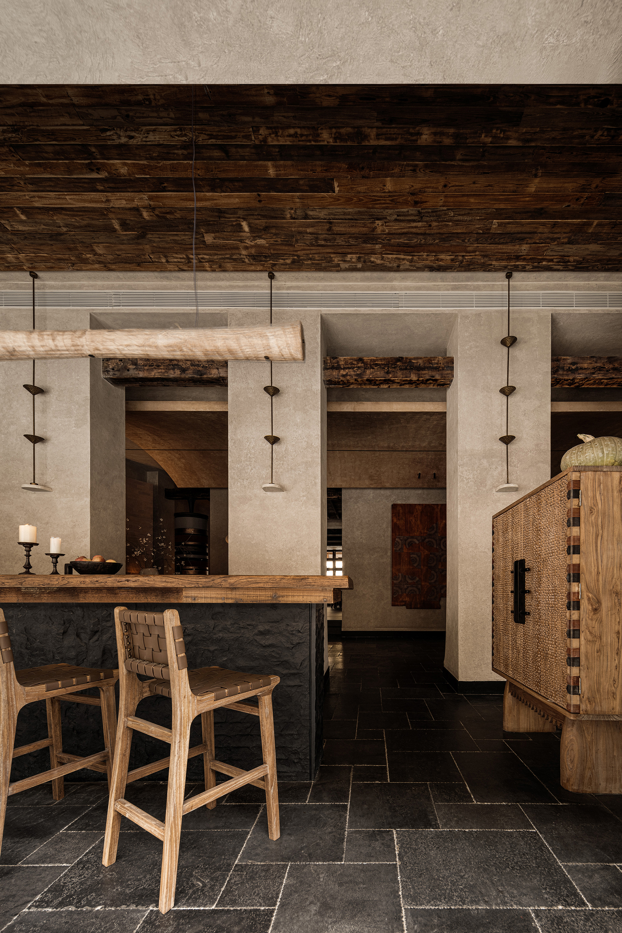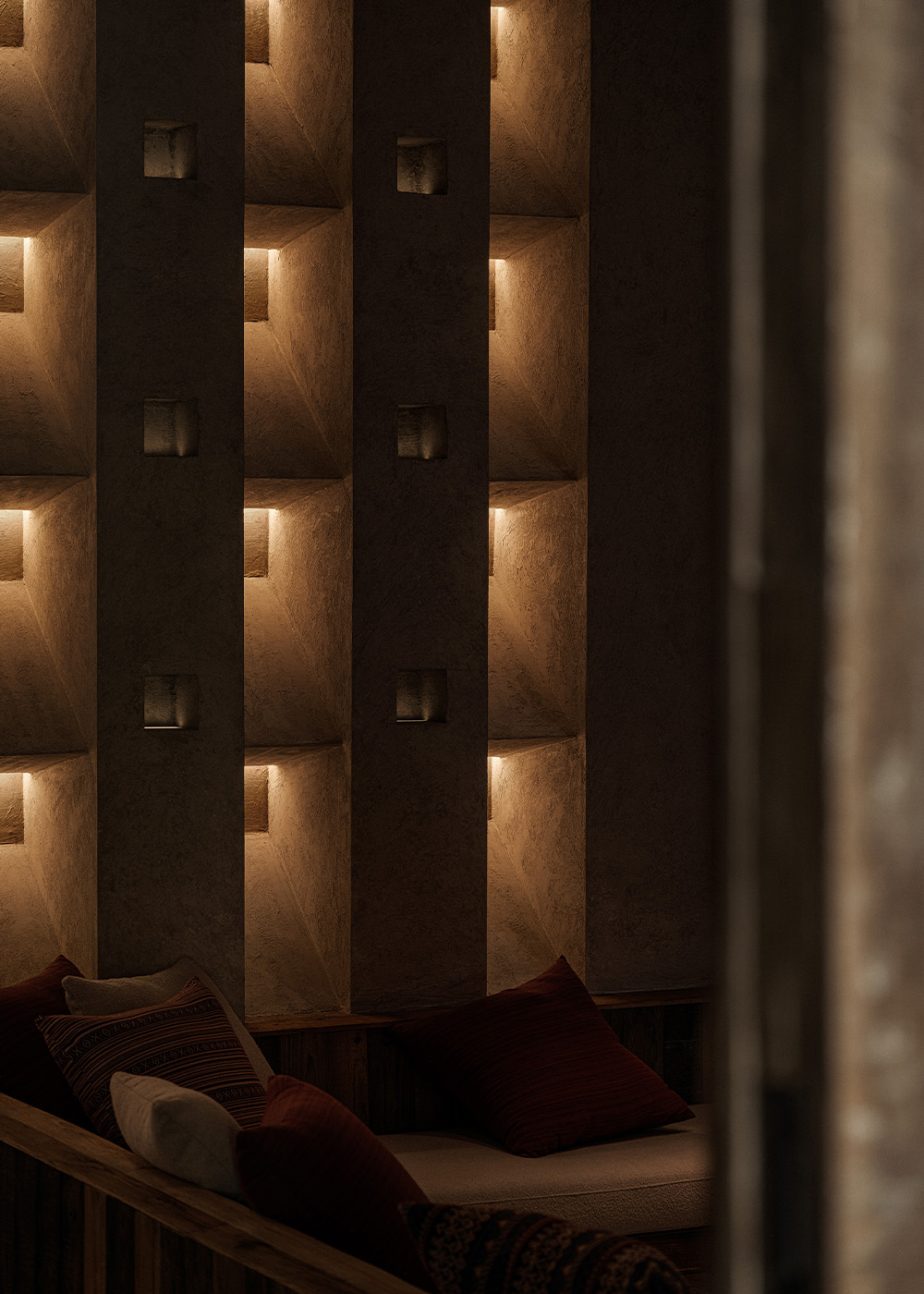Fire was originally regarded as a microcosm of the sun. In other ancient civilizations, the sacred flame was always initially placed in a specific area before gradually being embraced by the living spaces of households. In Tibetan regions, daily life similarly revolves around the hearth. For Tibetans, fire is both material and spiritual—providing warmth and light. Here, the sunken hearth is emphasized by the space, creating a sense of cozy intimacy. The slightly dimmed surrounding light, the dancing flames within the hearth, and the crackling sound of burning wood all aim to offer a humanistic dimension that, while non-religious, still evokes spiritual resonance.