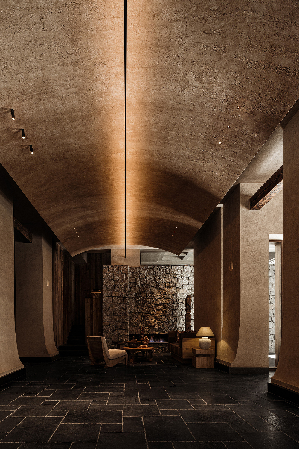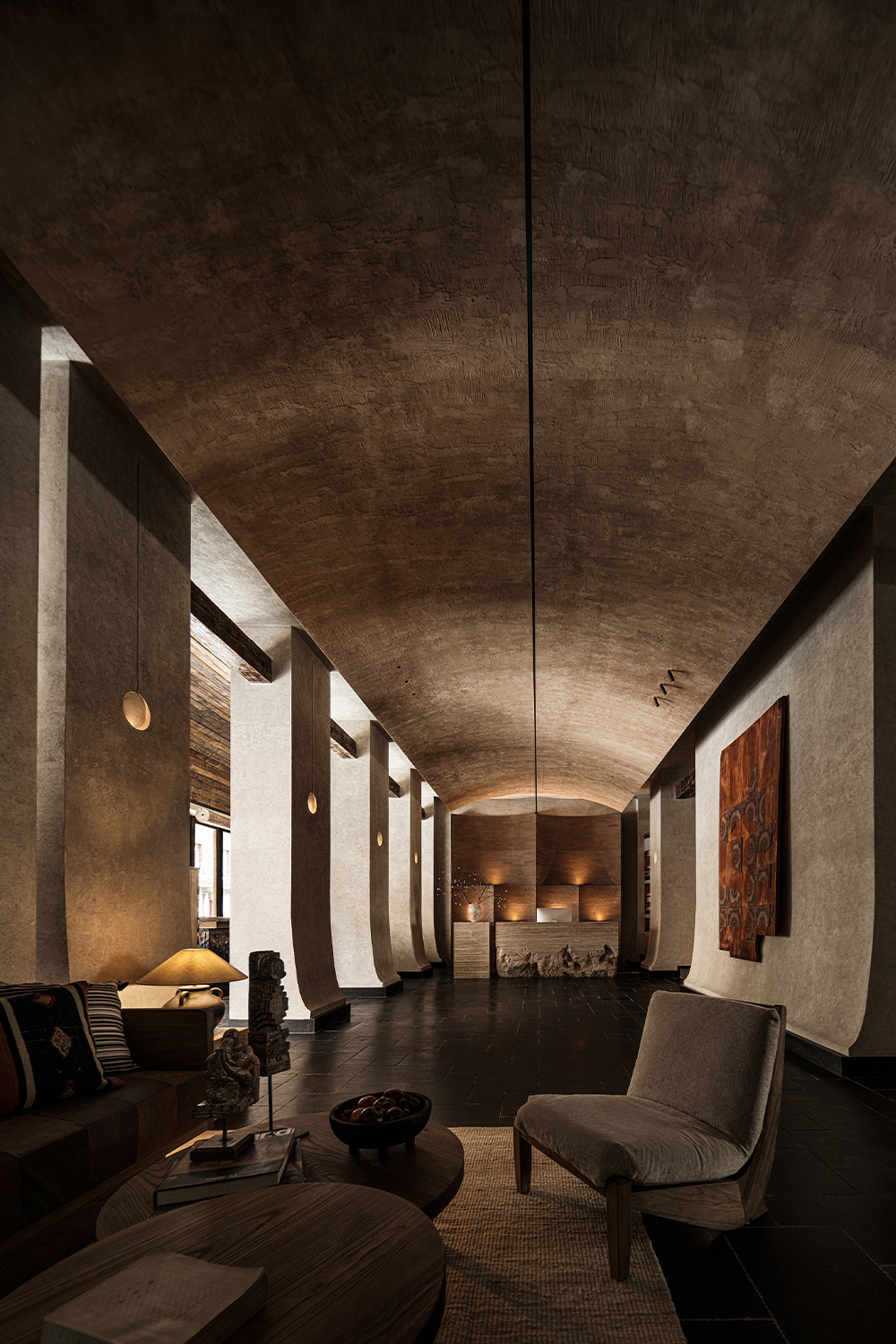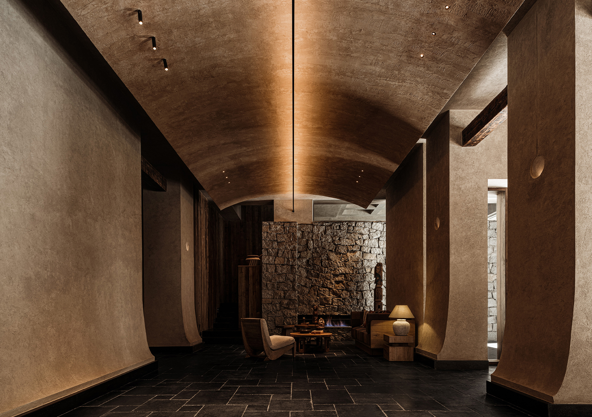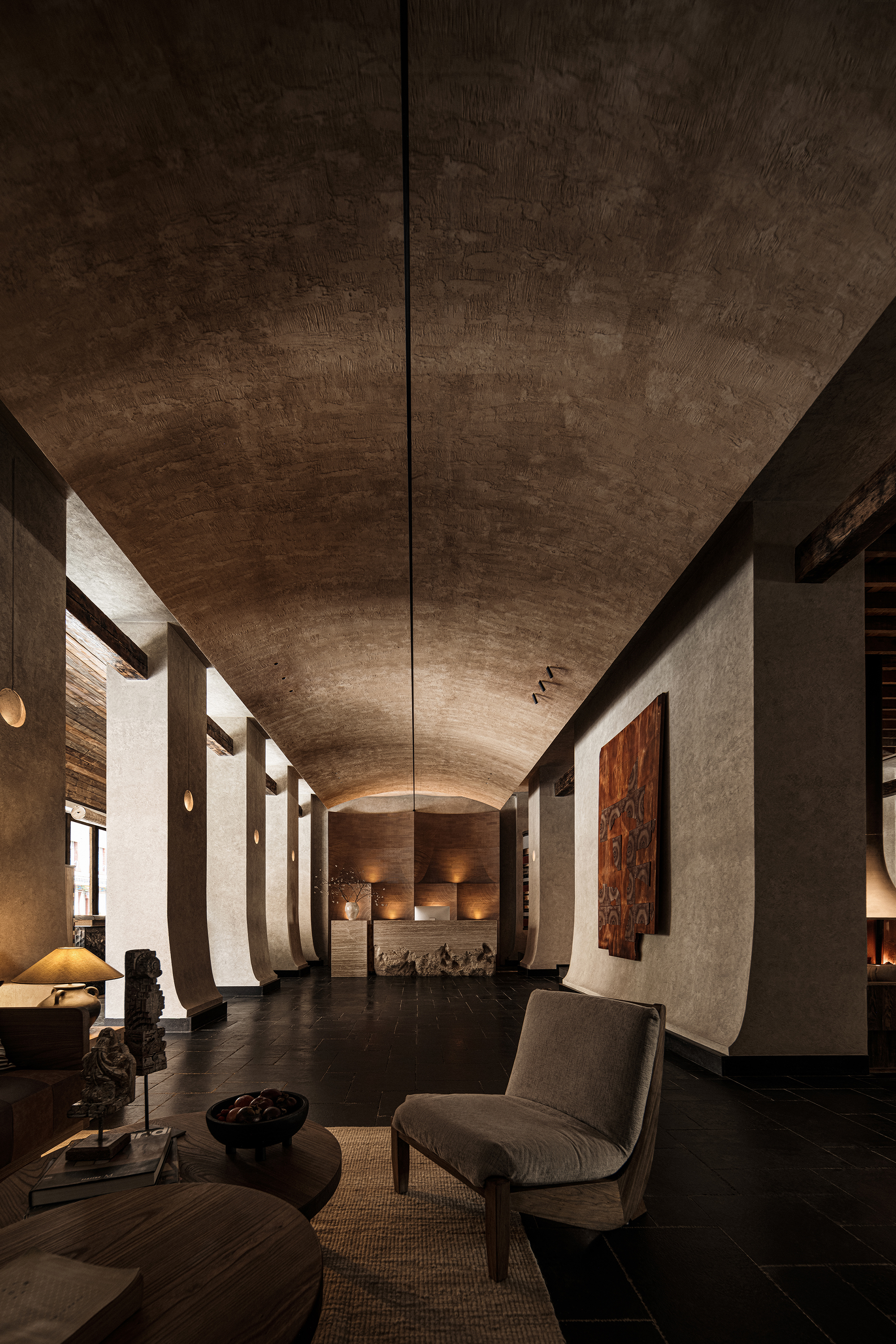 The curved vaulted ceiling echoes the arched column bases. From the rugged brick and stone wall at the entrance, extending to the layered, shrine-like wall constructed with multiple arcs at the opposite end, the sacredness of the space is pushed to its visual limit, becoming the most powerful convergence of ritualistic atmosphere. Here, whether through the vertical extension of the columns or the visual guidance along the spatial depth, a sacred and silent spatial tension is provided.