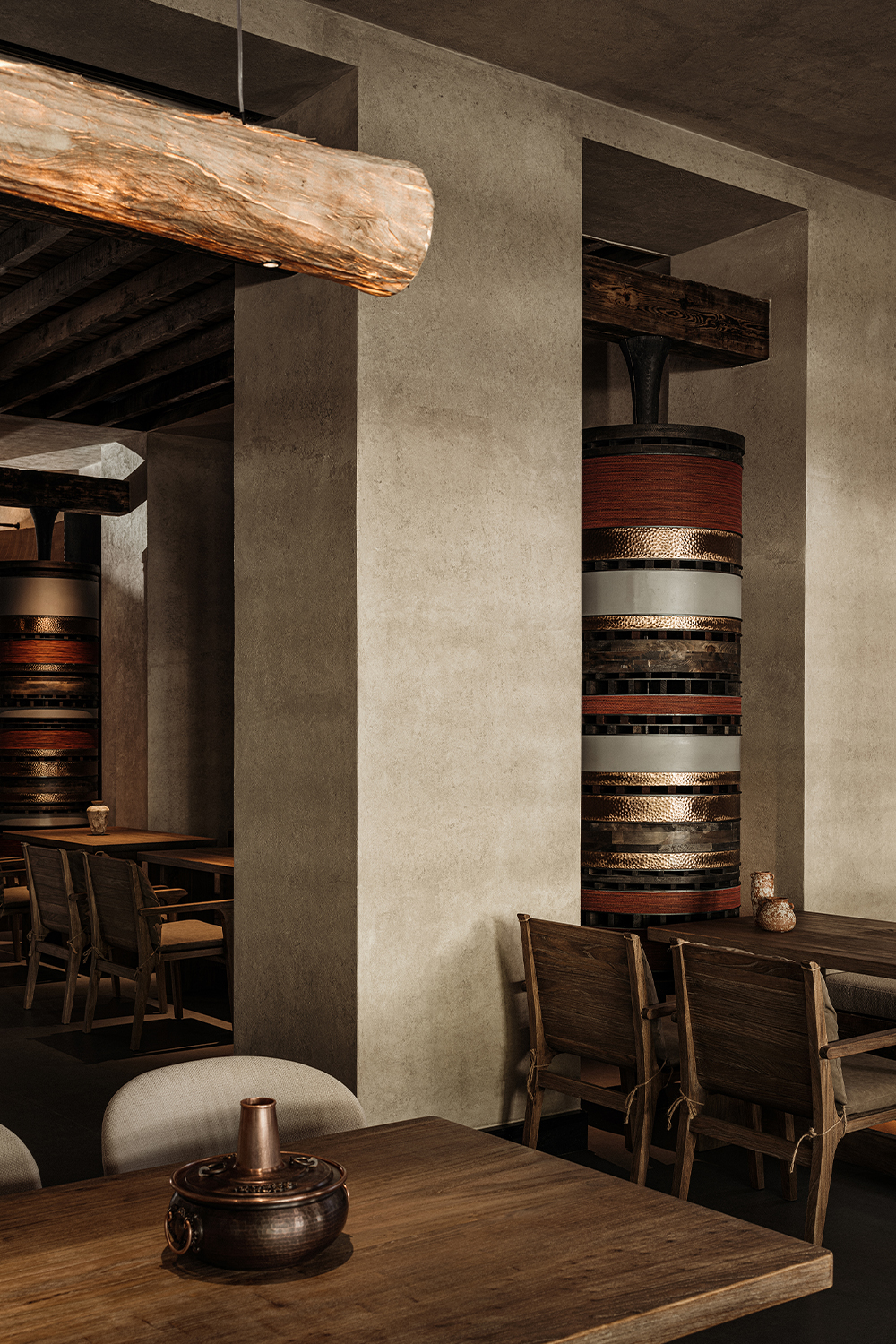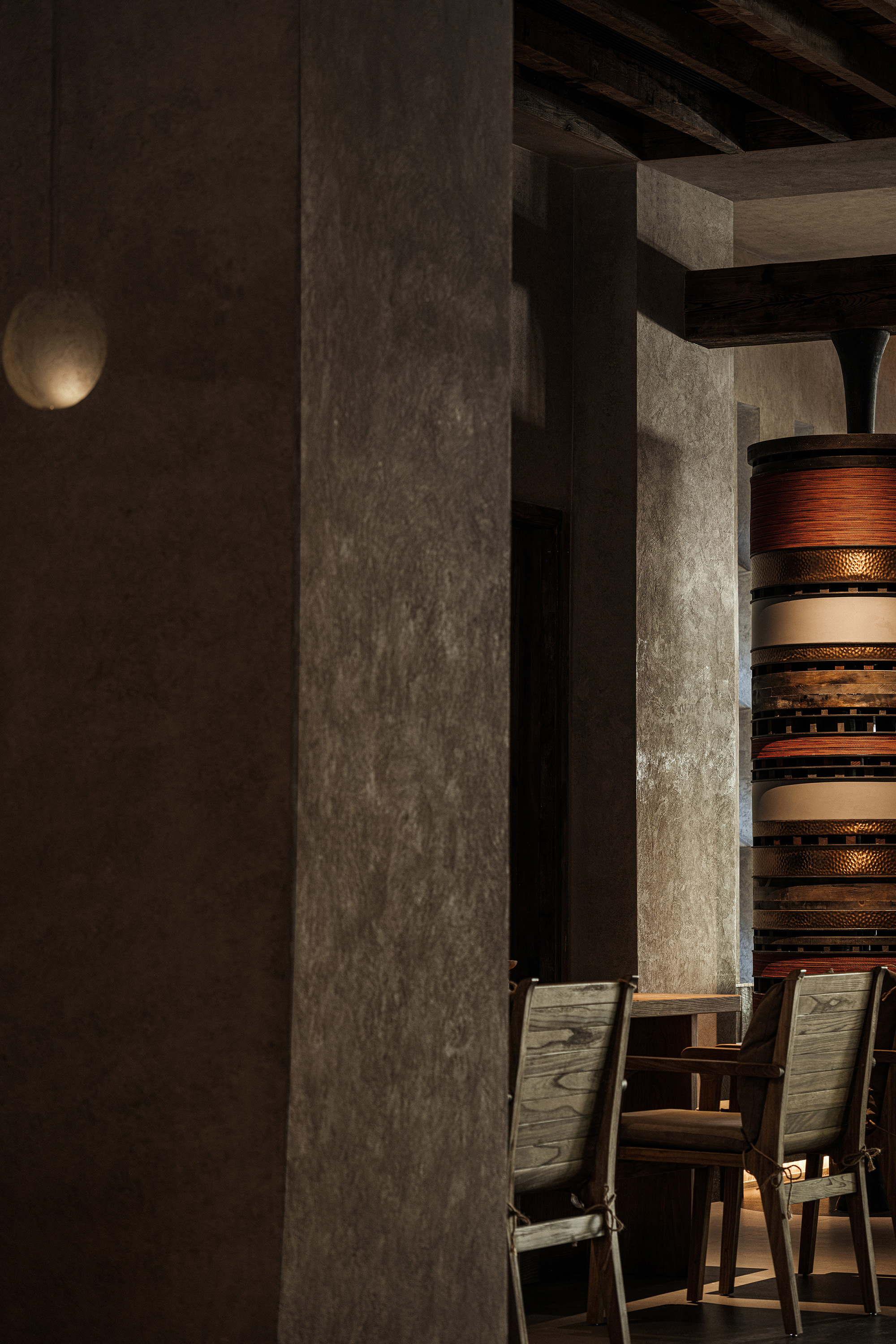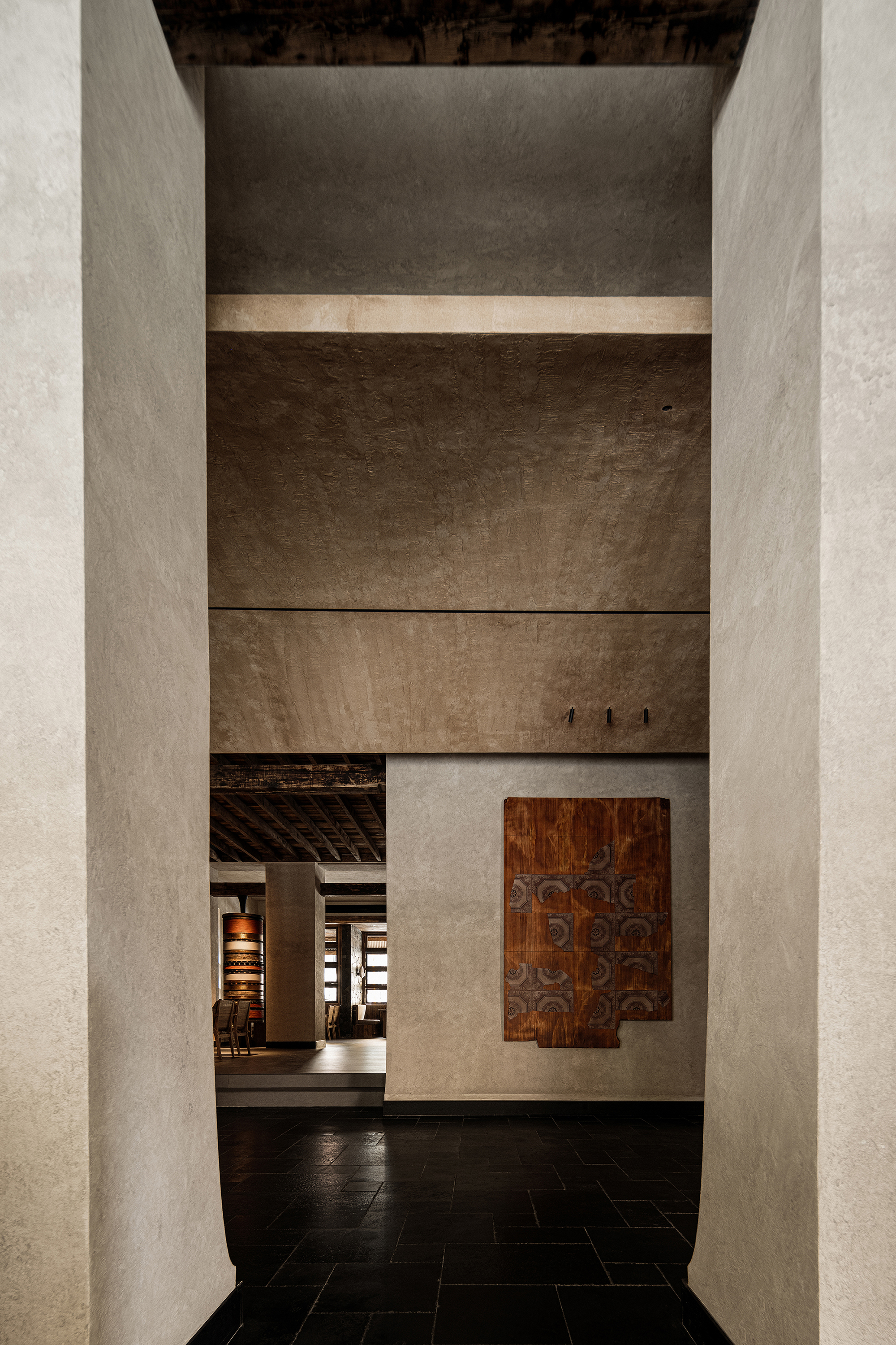 Gathering fleeting glimpses of humanistic essence from the details. The prayer wheel in the dining area, crafted from copper sheets, iron plates, and Tibetan red cotton thread, transforms religious ritual into an artistic installation. The wall hanging above the hearth features a copper-sheet composition resembling ravines, adorned with Tibetan bells. As the firelight dances across it, it casts shifting patches of light and shadow—a response to the rhythms of daily life. Meanwhile, small apertures in the thick walls allow light to seep through, gradually fading into a state of soft, permeating grayscale—a silent yet profound reflection of human culture's subtle influence. Thus, sacredness and everyday life intertwine, each enriching the other.