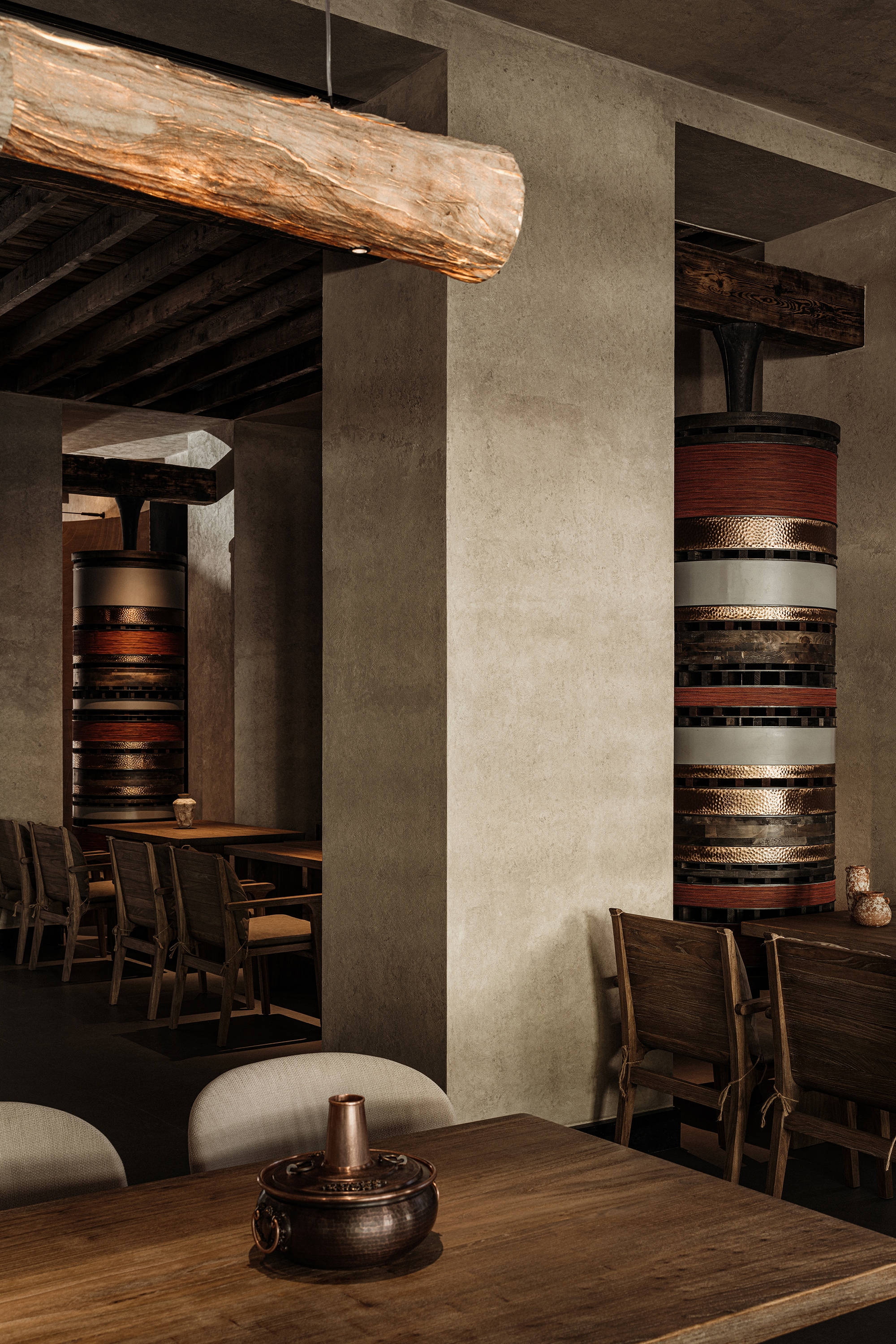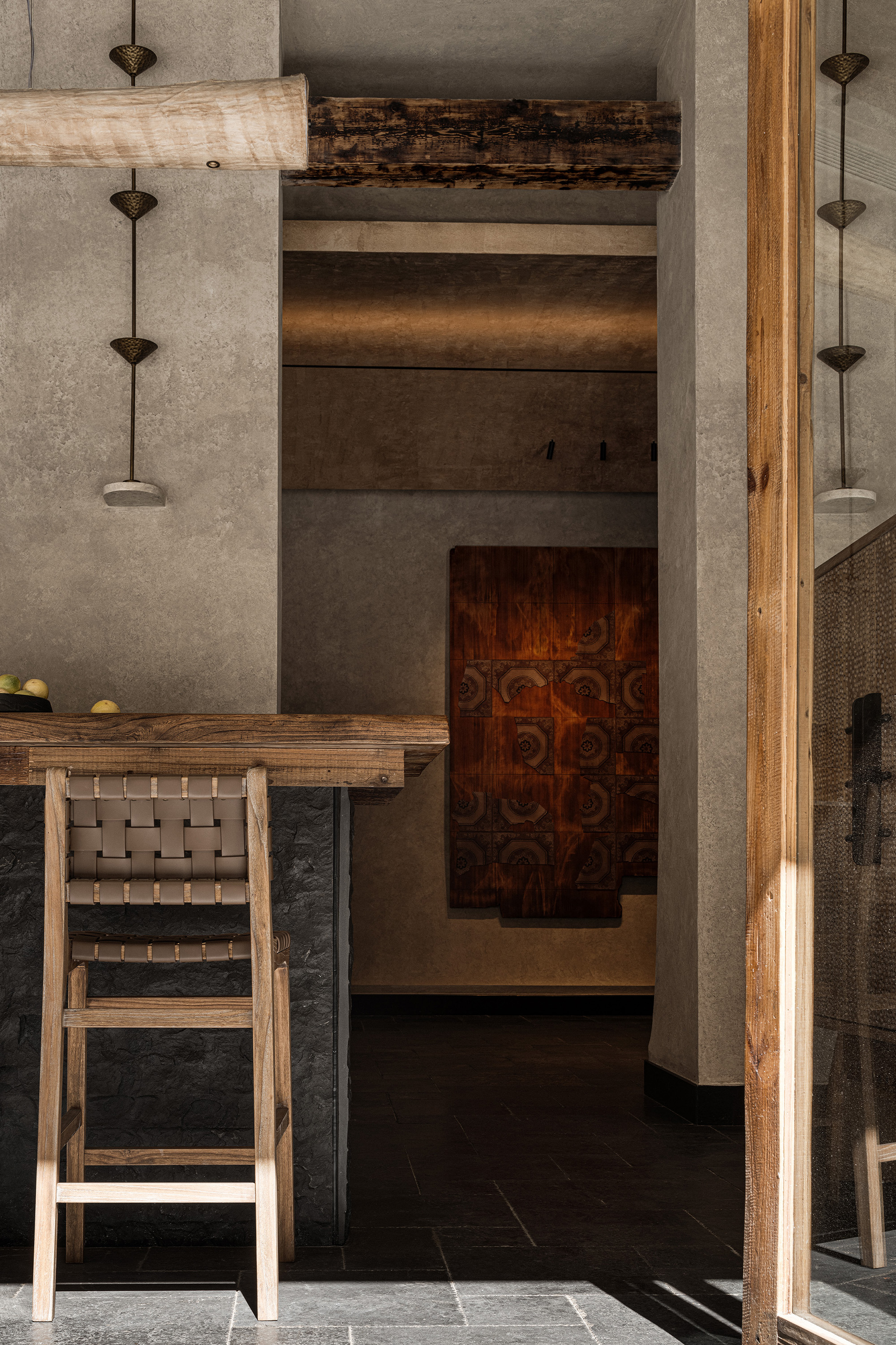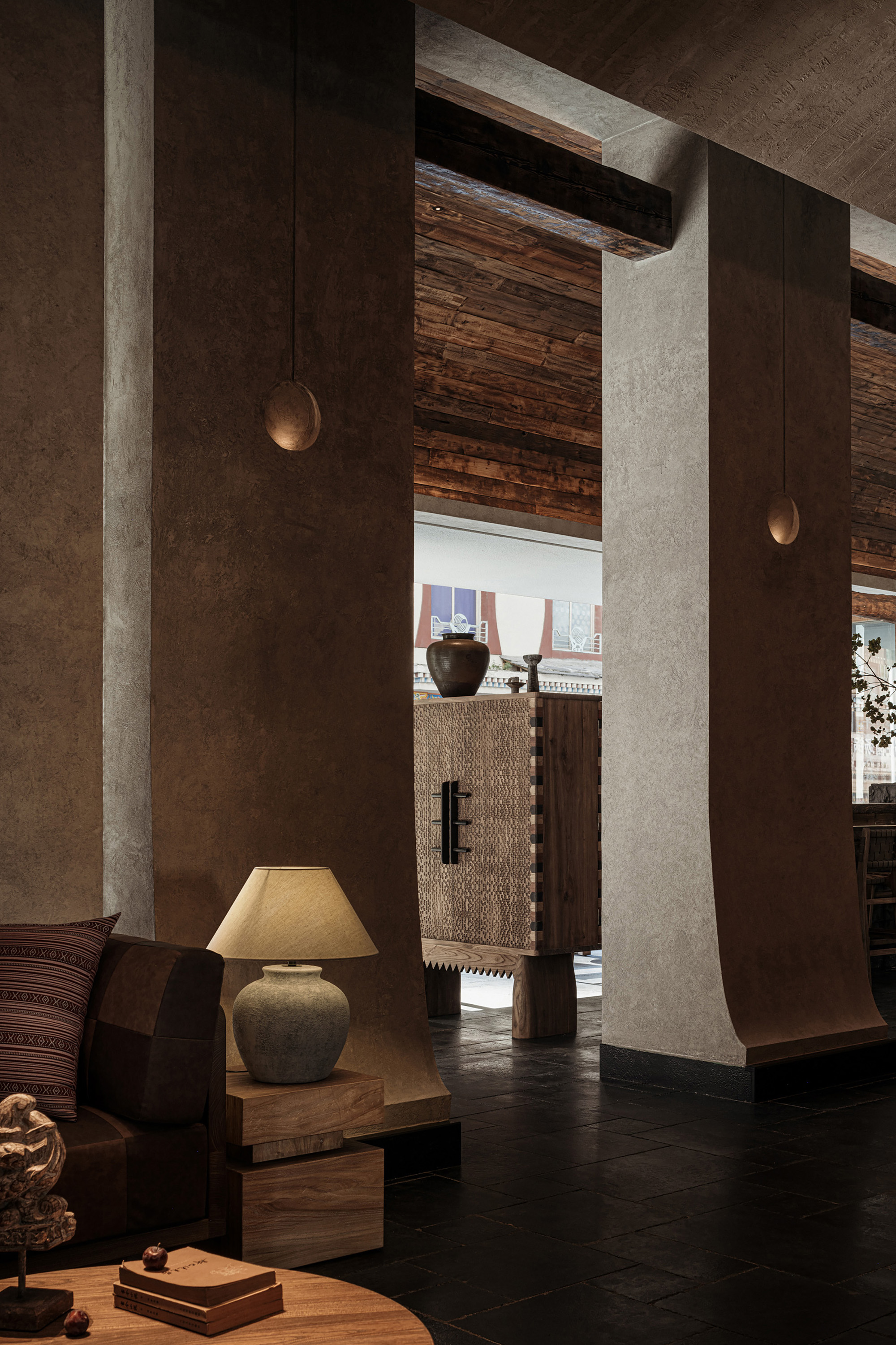 Gathering fleeting glimpses of humanistic essence from the details. The prayer wheel in the dining area, crafted from copper sheets, iron plates, and Tibetan red cotton thread, transforms religious ritual into an artistic installation. The wall hanging above the hearth features a copper-sheet composition resembling ravines, adorned with Tibetan bells. As the firelight dances across it, it casts shifting patches of light and shadow—a response to the rhythms of daily life. Meanwhile, small apertures in the thick walls allow light to seep through, gradually fading into a state of soft, permeating grayscale—a silent yet profound reflection of human culture's subtle influence. Thus, sacredness and everyday life intertwine, each enriching the other.
