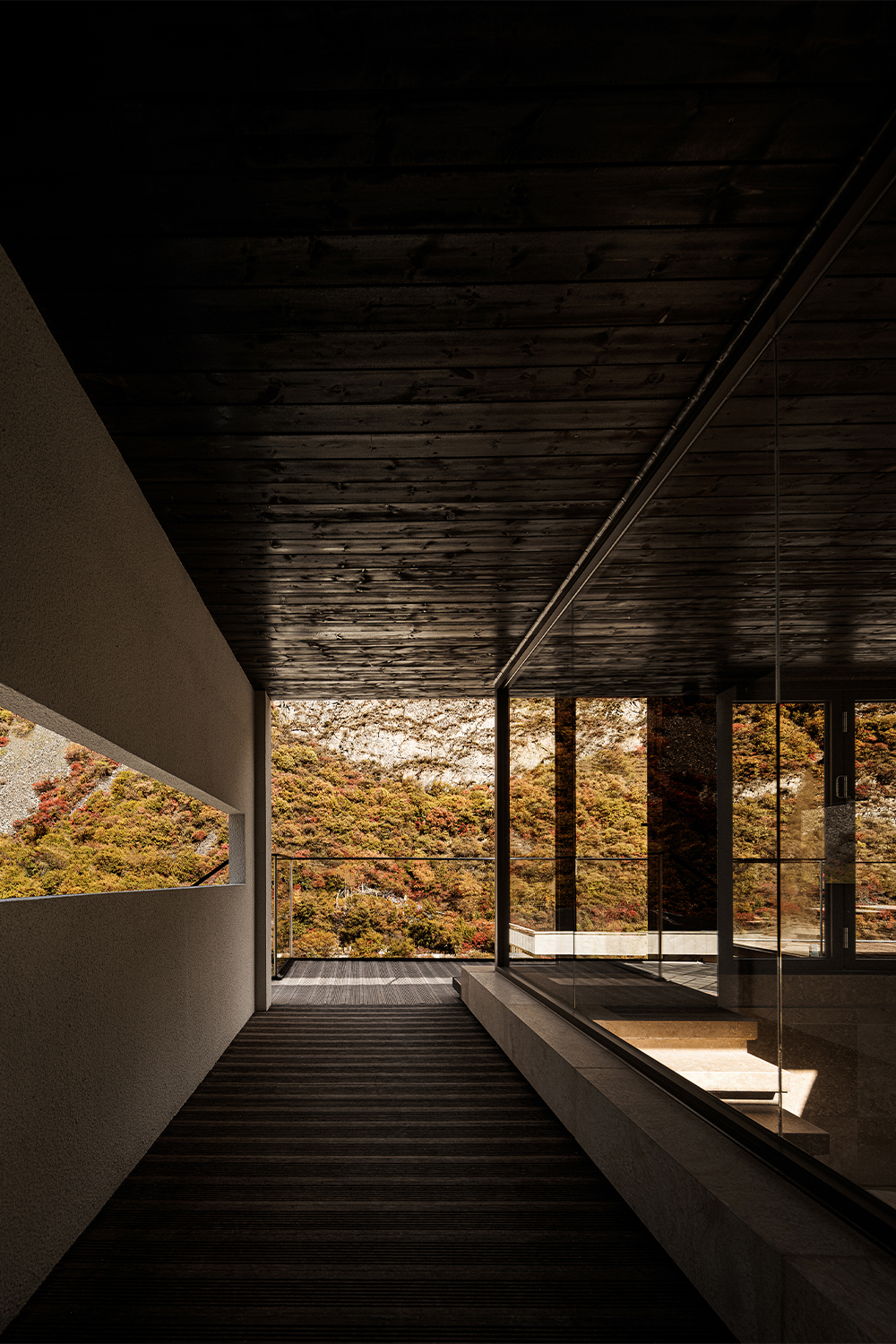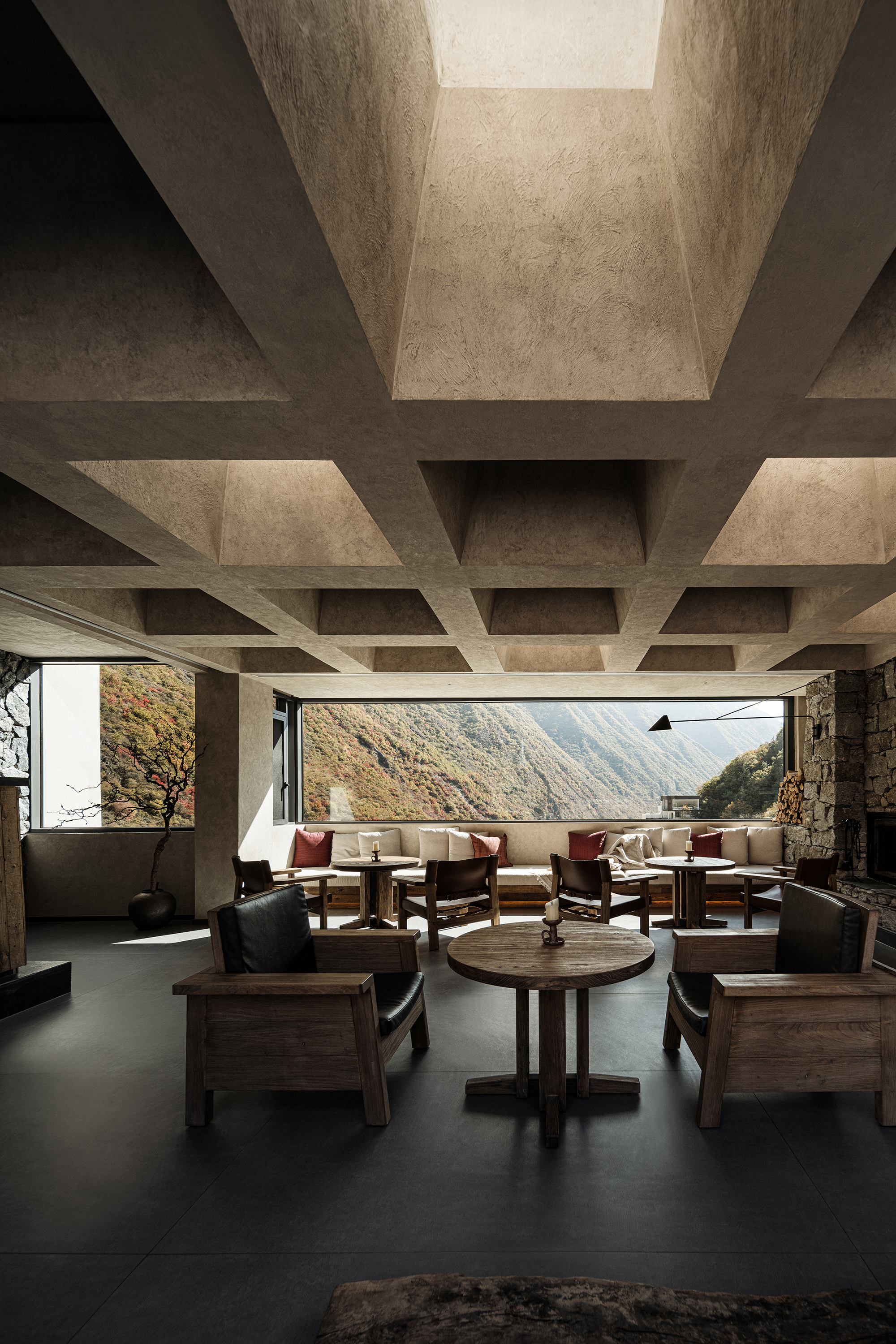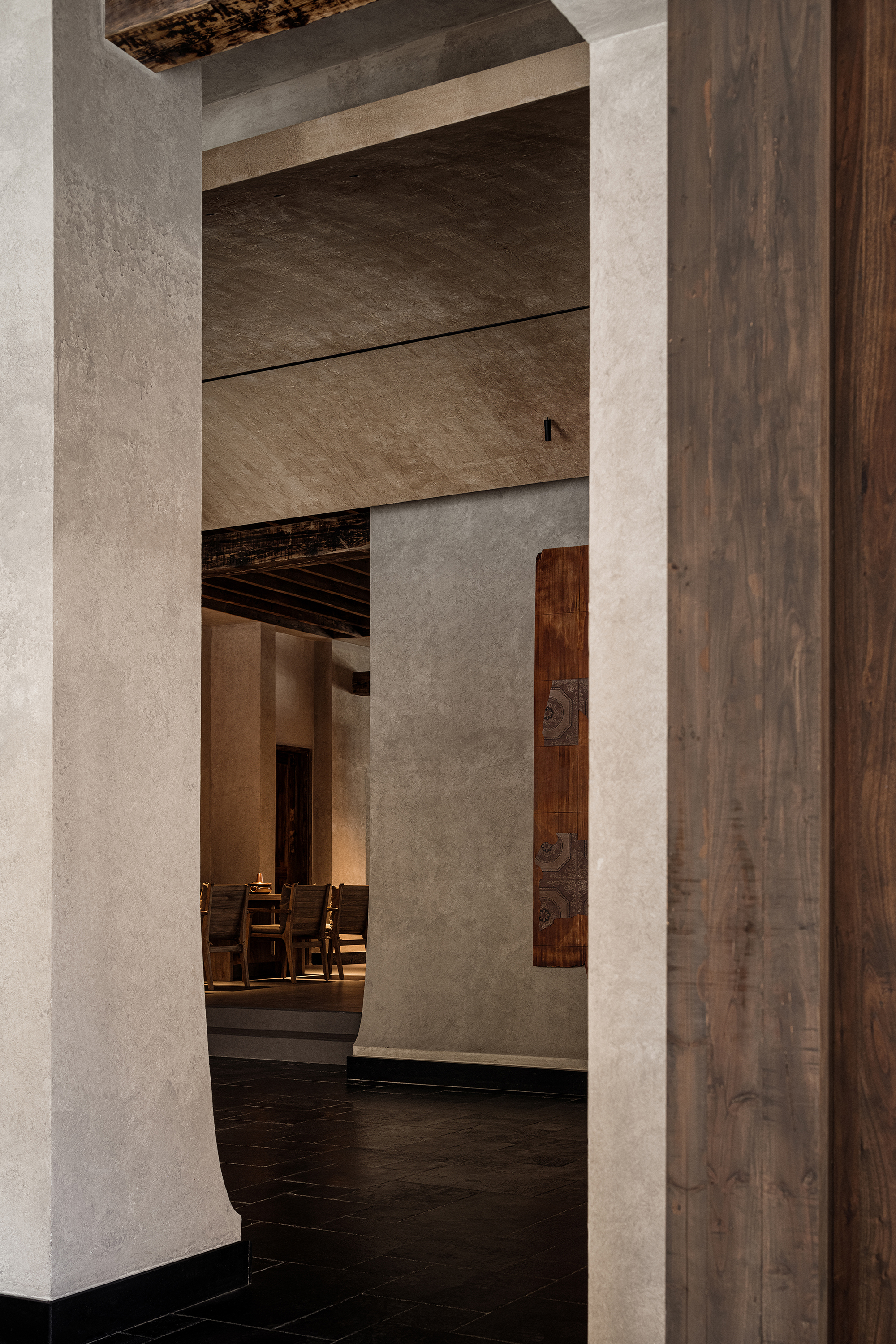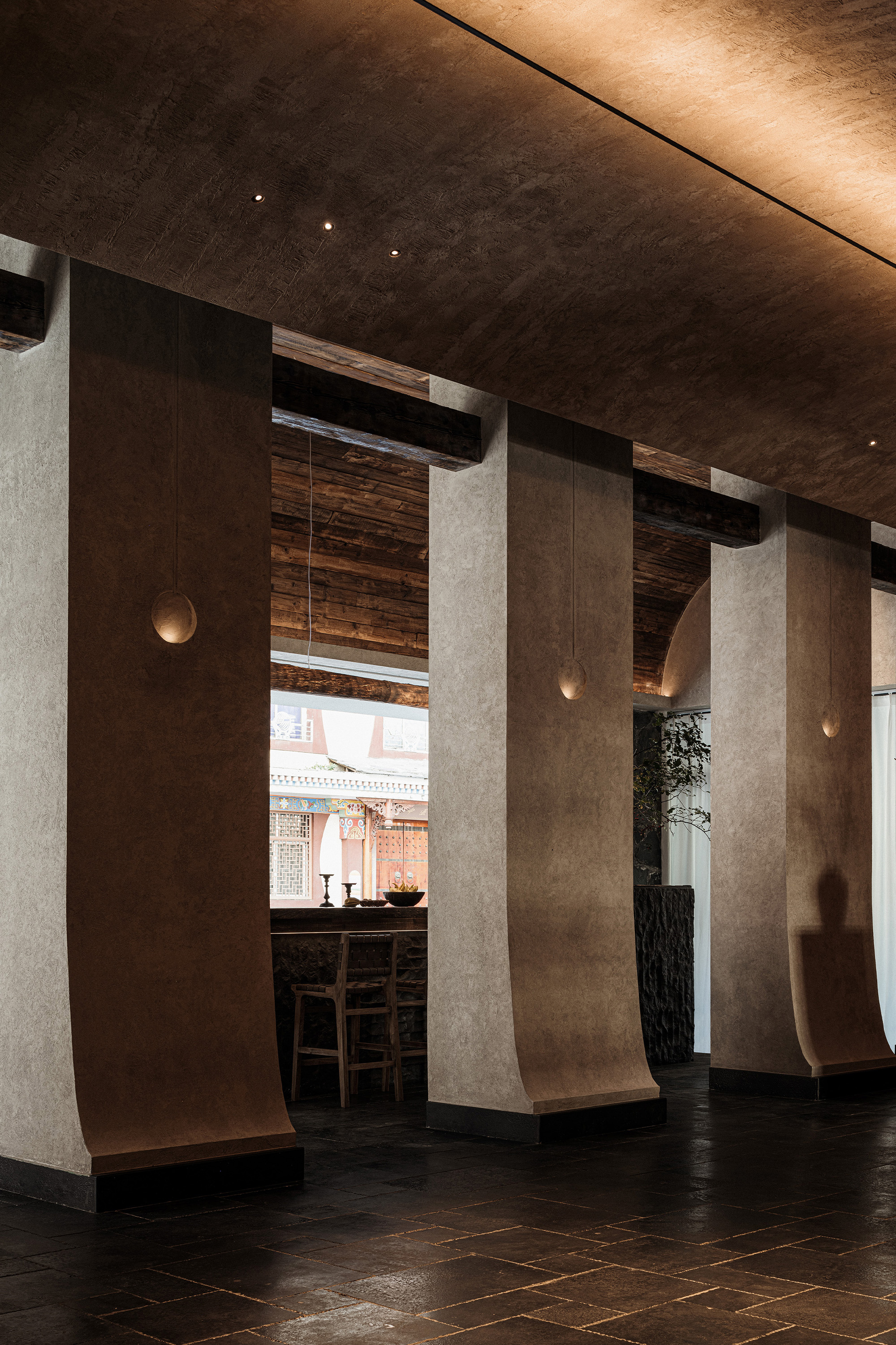 Entering the sacred interior from the bustling National Highway 317 requires passing through a relatively narrow and dim L-shaped passageway. As a transitional space, the abrupt dimming of light prompts the body, responding to experiential intuition, to immediately enter a state of complete immersion. Attention begins to focus inward, inner tranquility takes hold, and multiple senses actively seek spiritual enlightenment from the surroundings. The core area of the space is a colonnaded hall reminiscent of a traditional temple. The columns are substantial and rugged, blending the symmetry and proportion of Western classical architecture with the sacred aura of Tibetan-style architecture's high walls and pillars. A harmony of strength and beauty is achieved between the minimalist geometric forms and the gentle curves of the column bases.