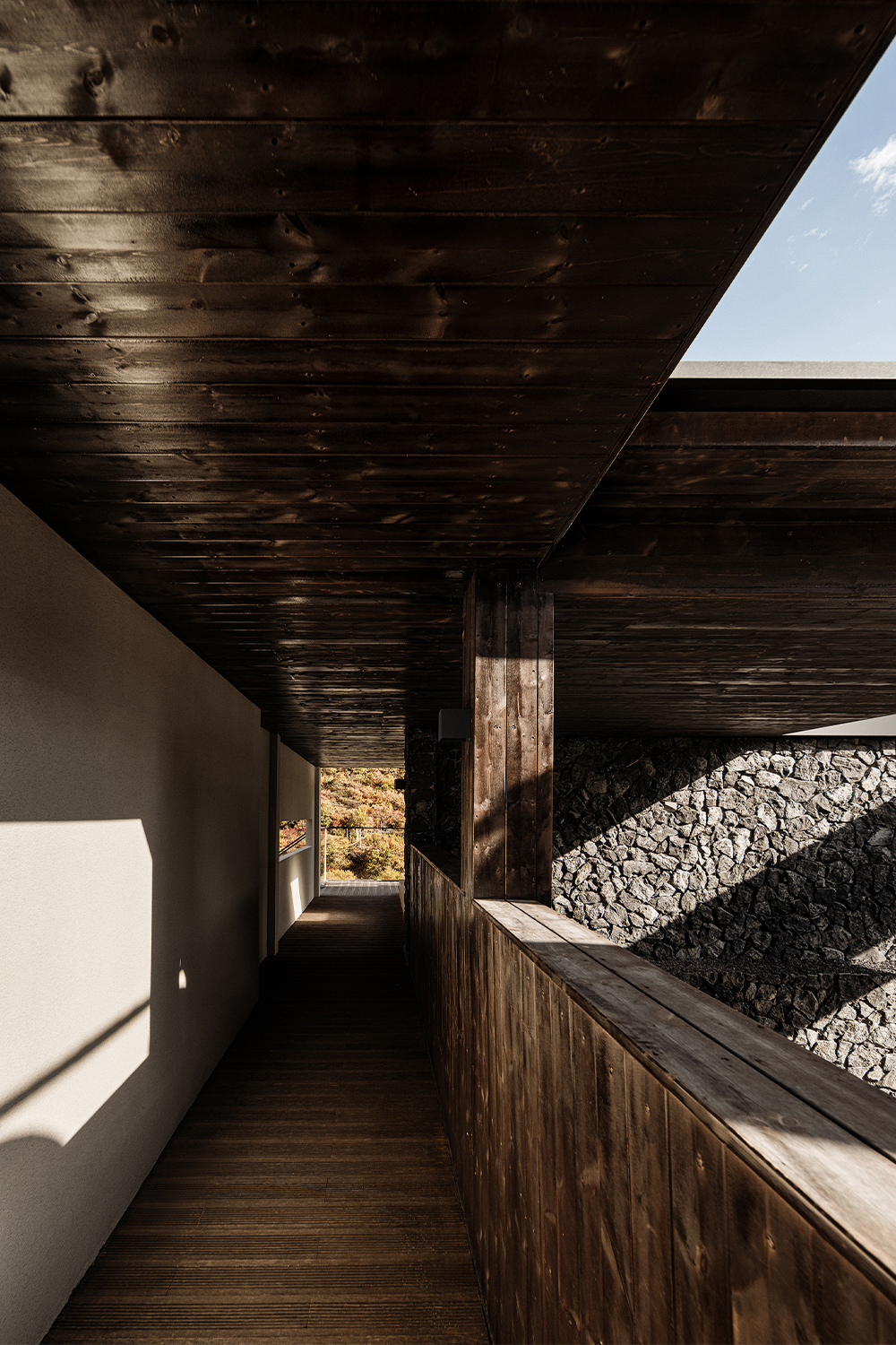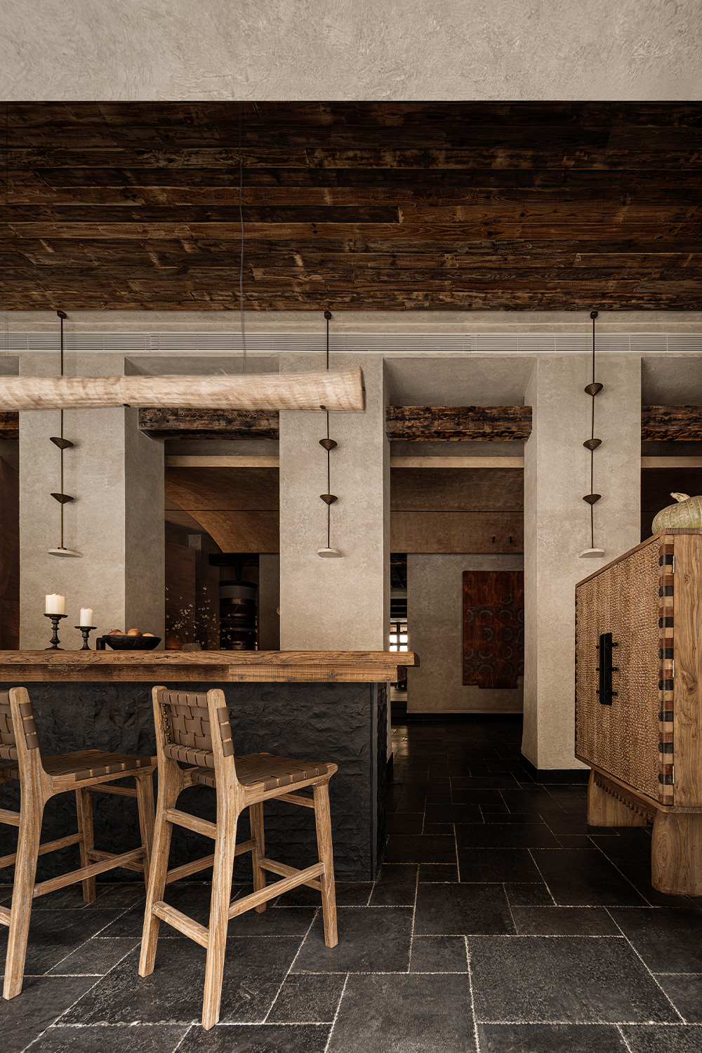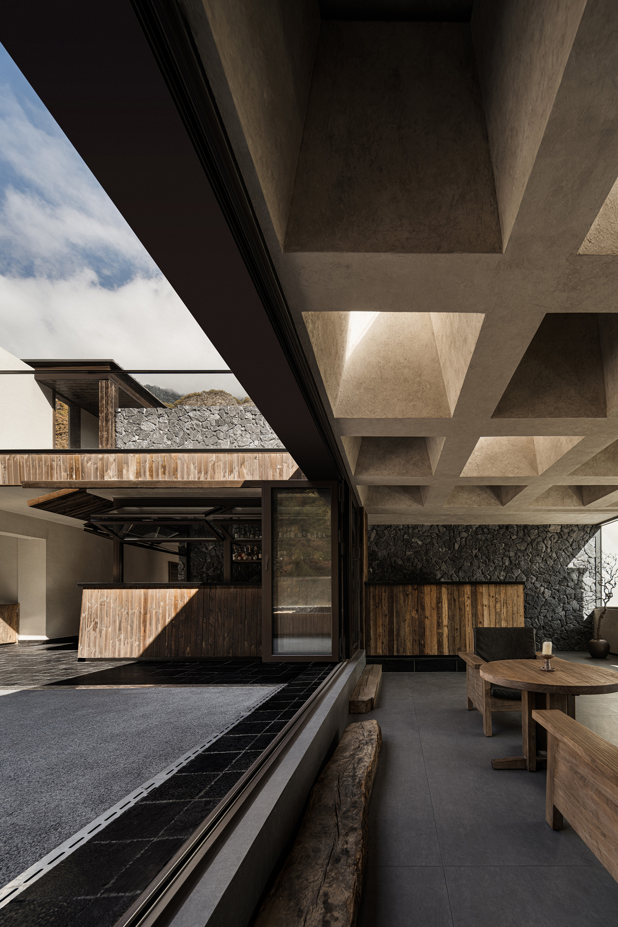 Positioning the bar on the top floor serves a dual purpose: first, to complement the ground-floor communal area, enriching the diversity of the public space in terms of visual experience and spatial perception; second, to extend the spiritual and pure essence of the space vertically, transforming it into an architectural will. For instance, the grid-like structure at the top and the translucent openings directly echo the columnar order and the play of light through perforations found in the ground-floor communal space.