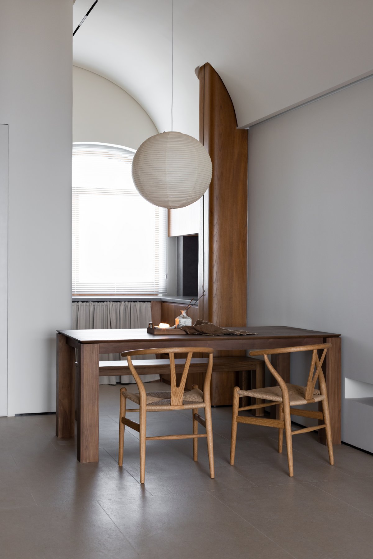 The owners are teachers and couples who have returned from studying in Europe. Their only expectation for a way of life is a poetic dwelling. The special apartment type has an original floor height of over 4m. The micro-arched window structure opens up the styling cues of this private house project. Muka Architects reorganized the relationship between the line and surface and the space construction itself, evaded the original constraints, and reconstructed a rational construction logic.