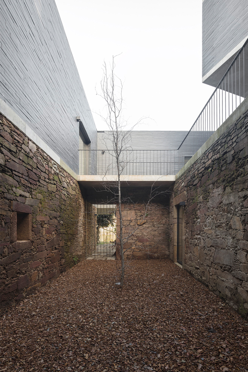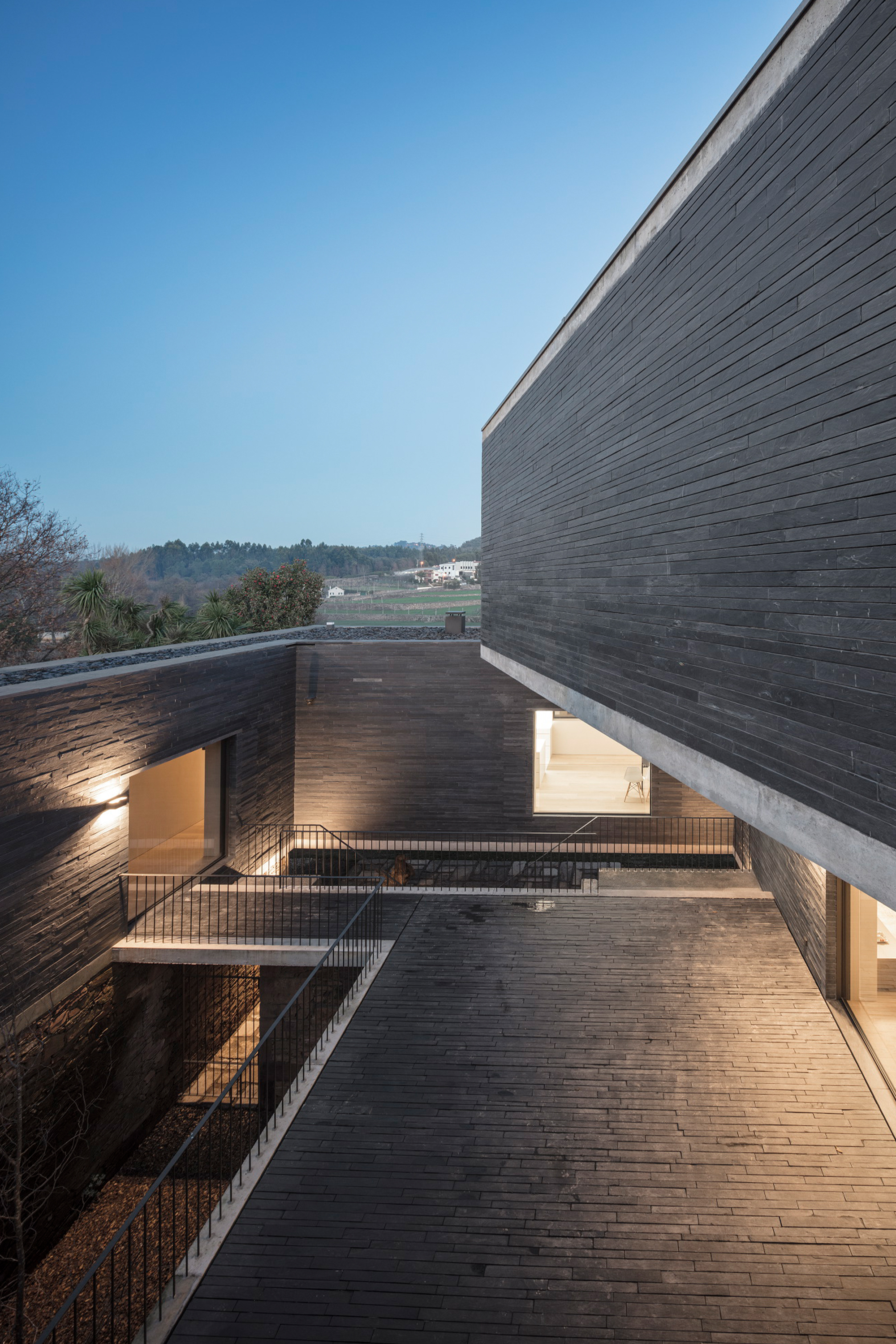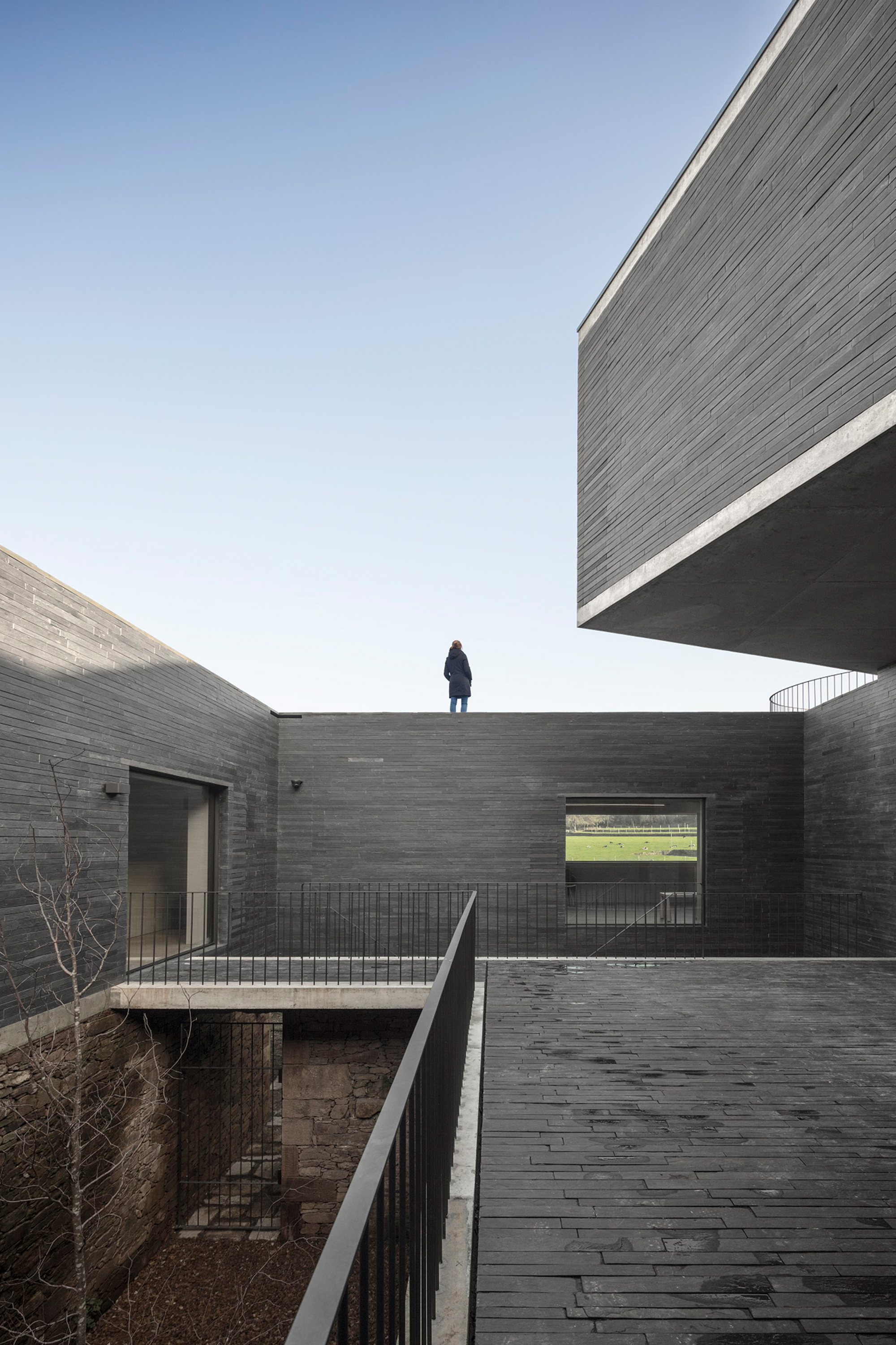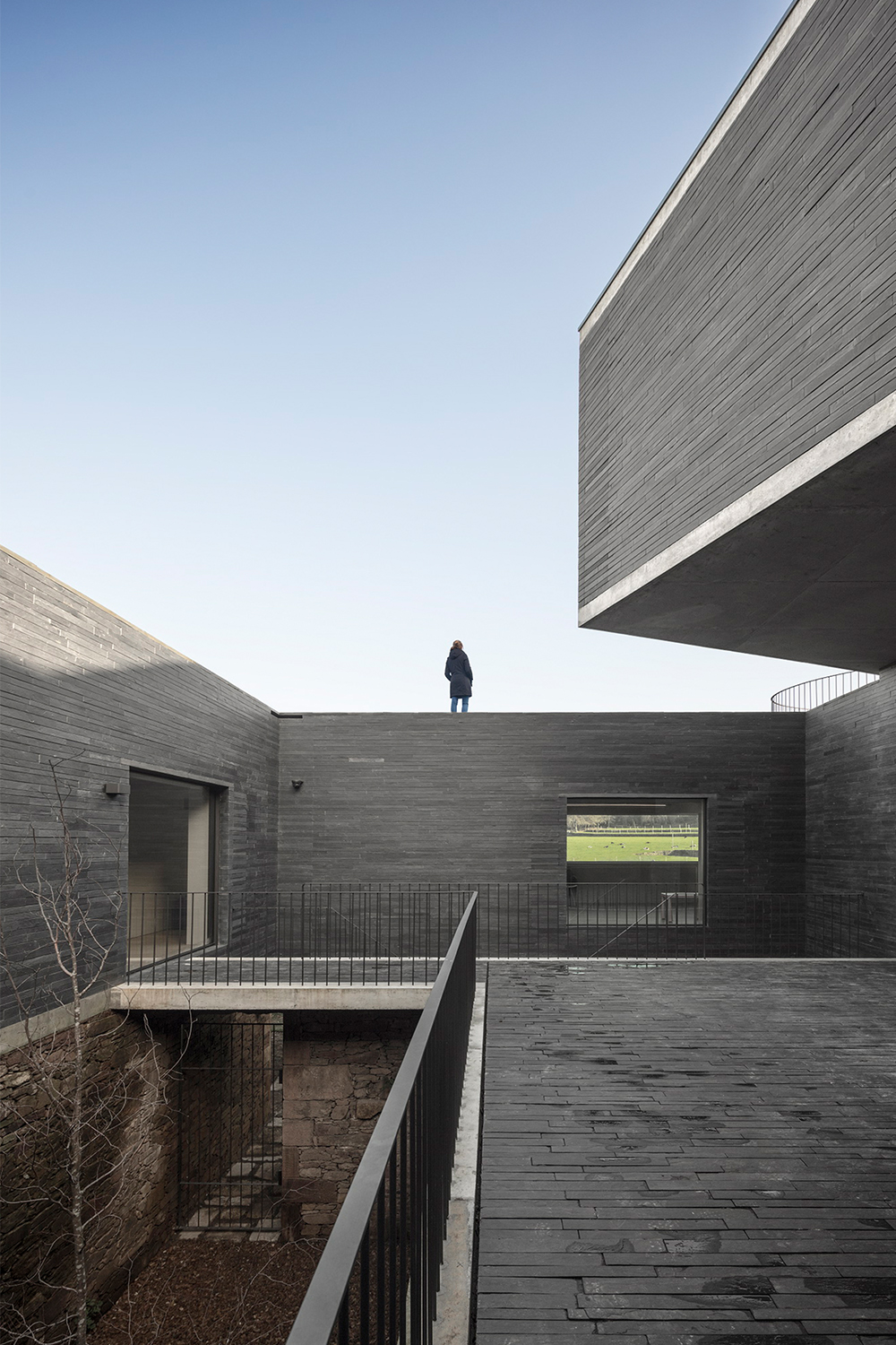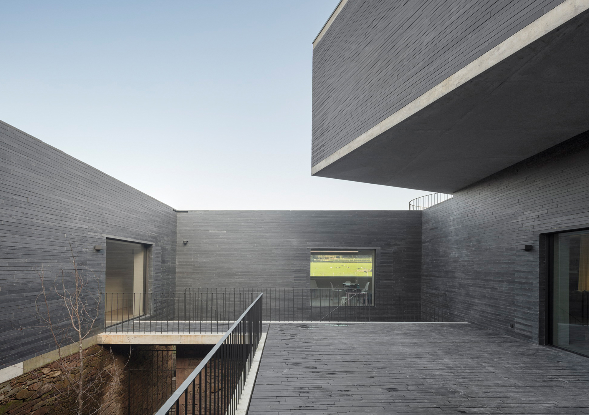 The new construction, (completely made or reinforced concrete) is a dark mass of slate sitting on the lower walls of the old house made of schist blocks against the old terraces of granite and schist.