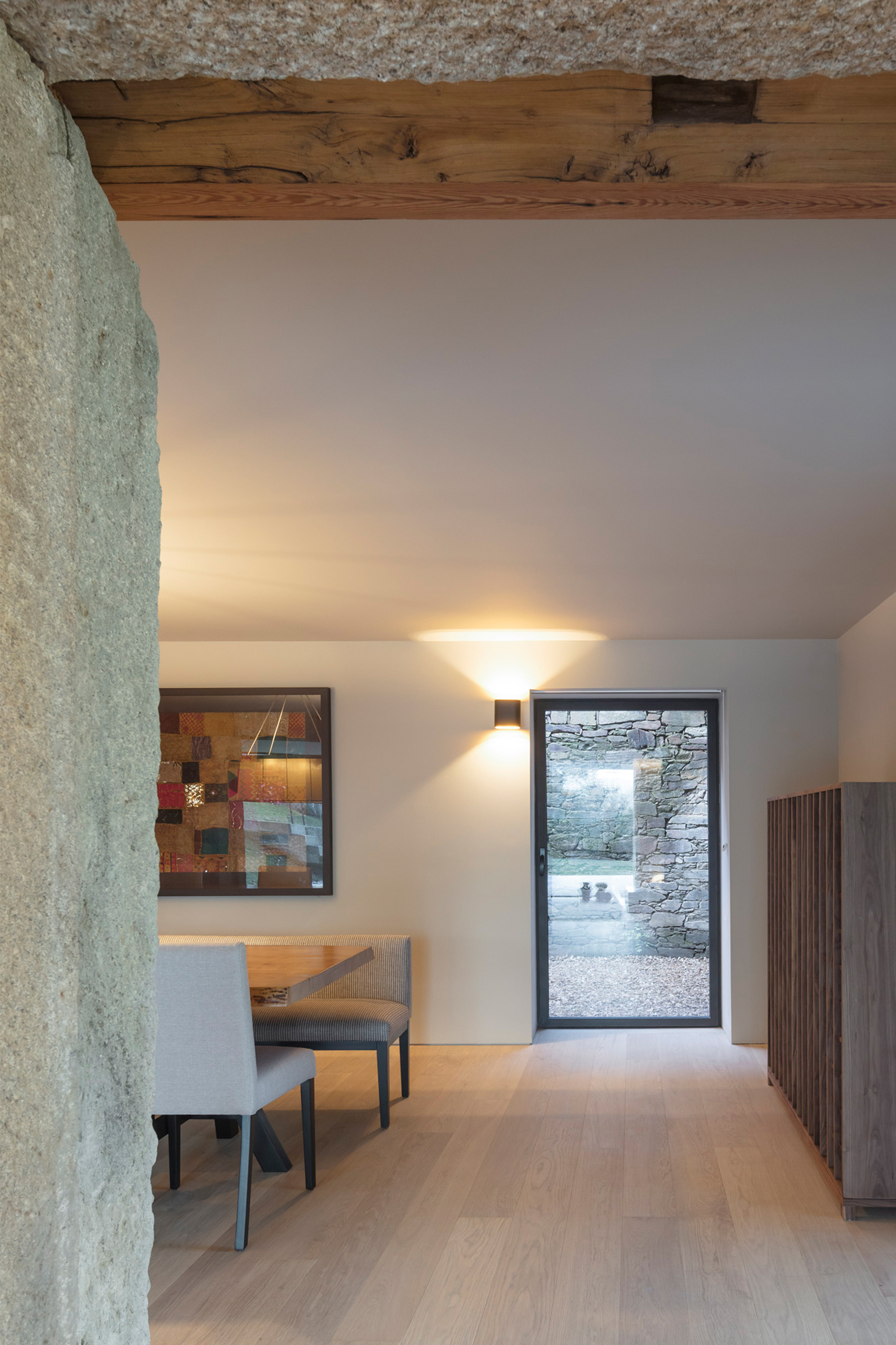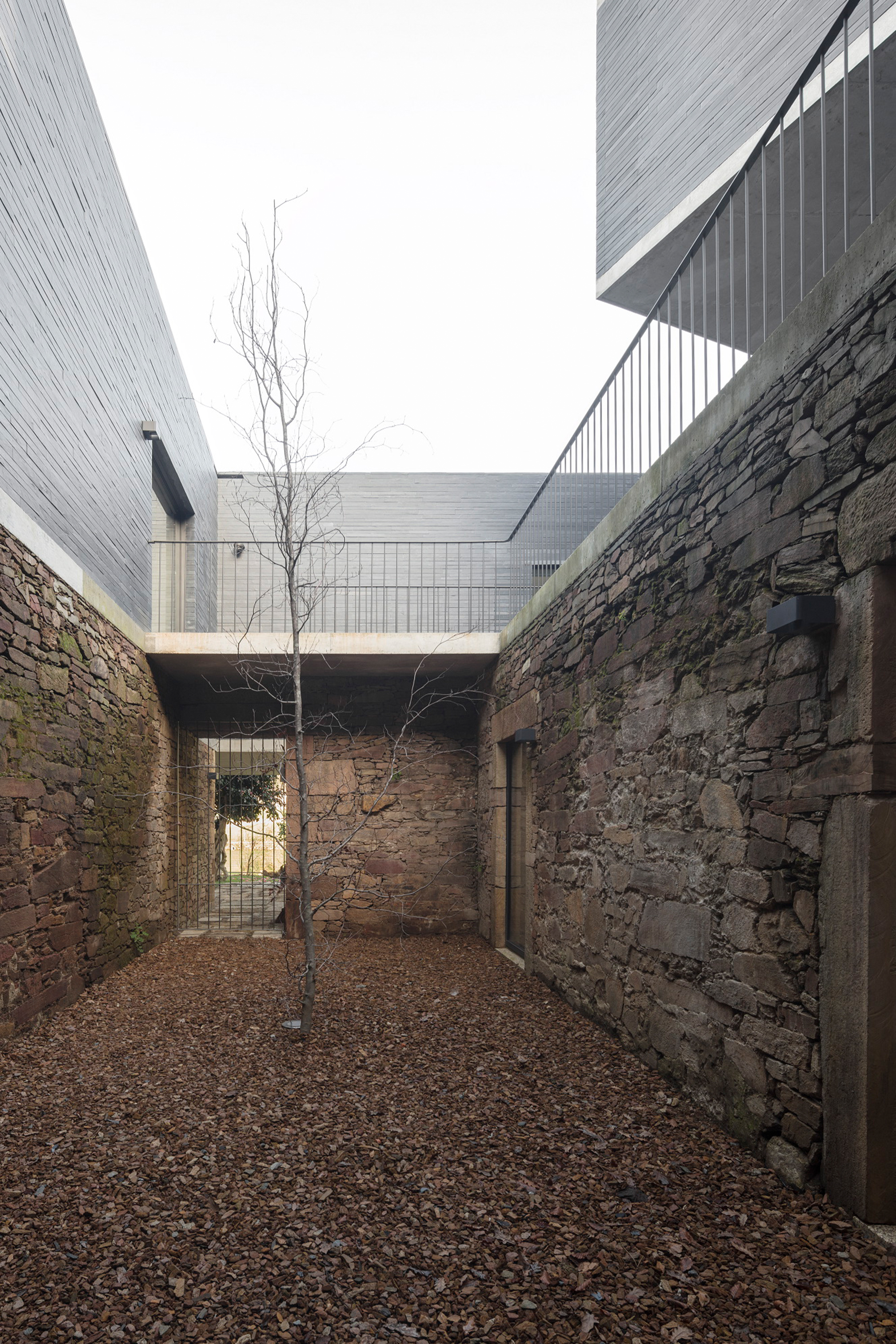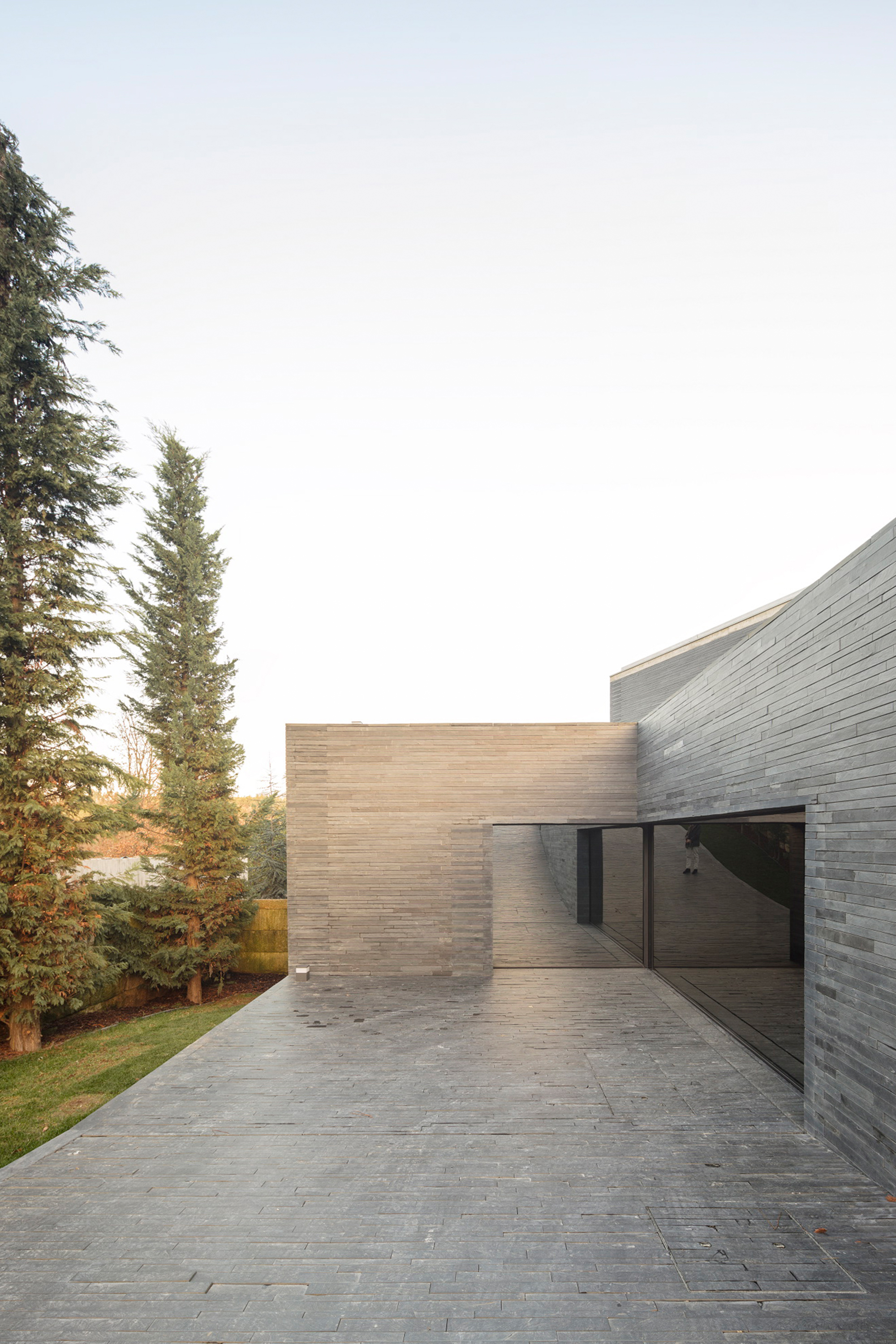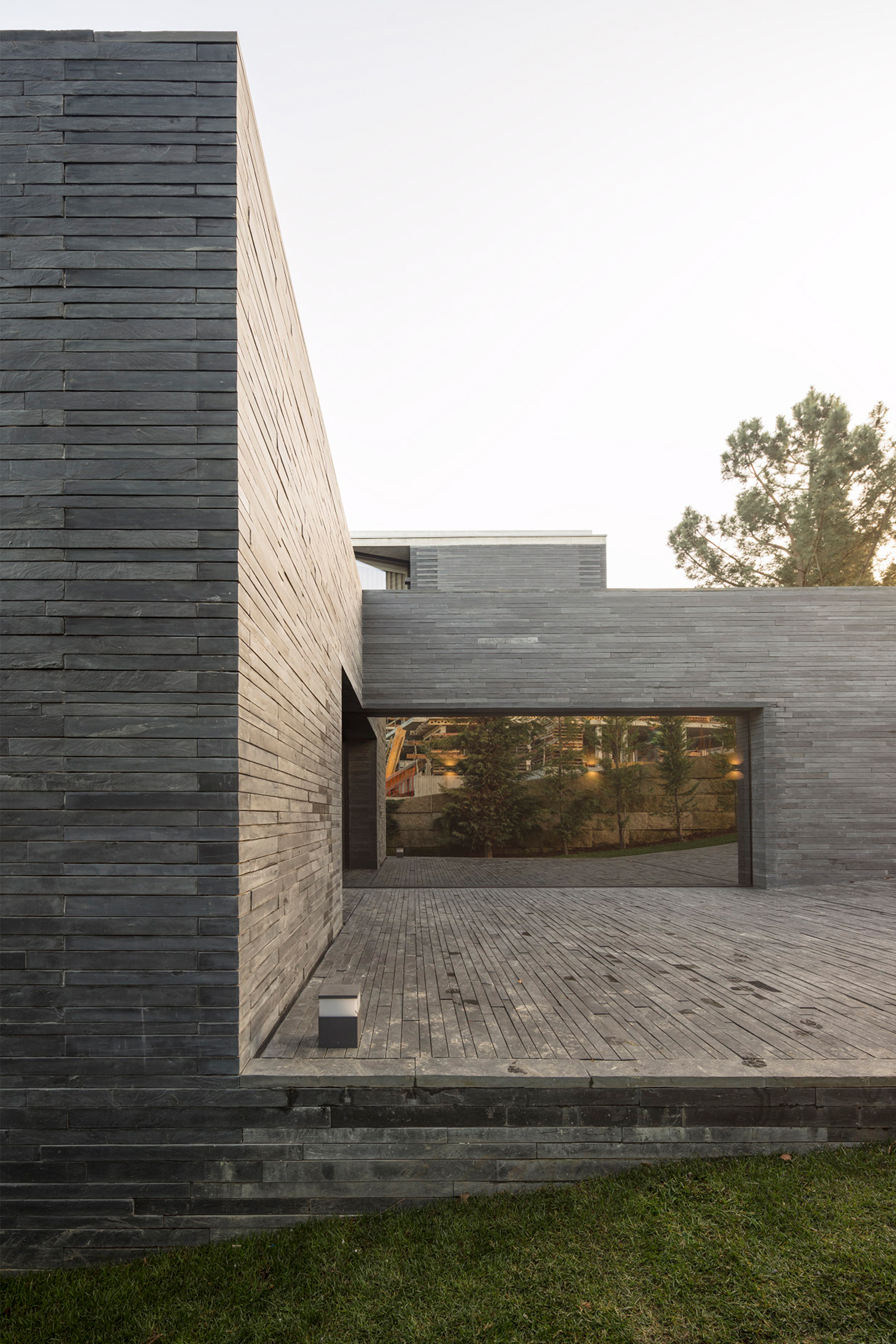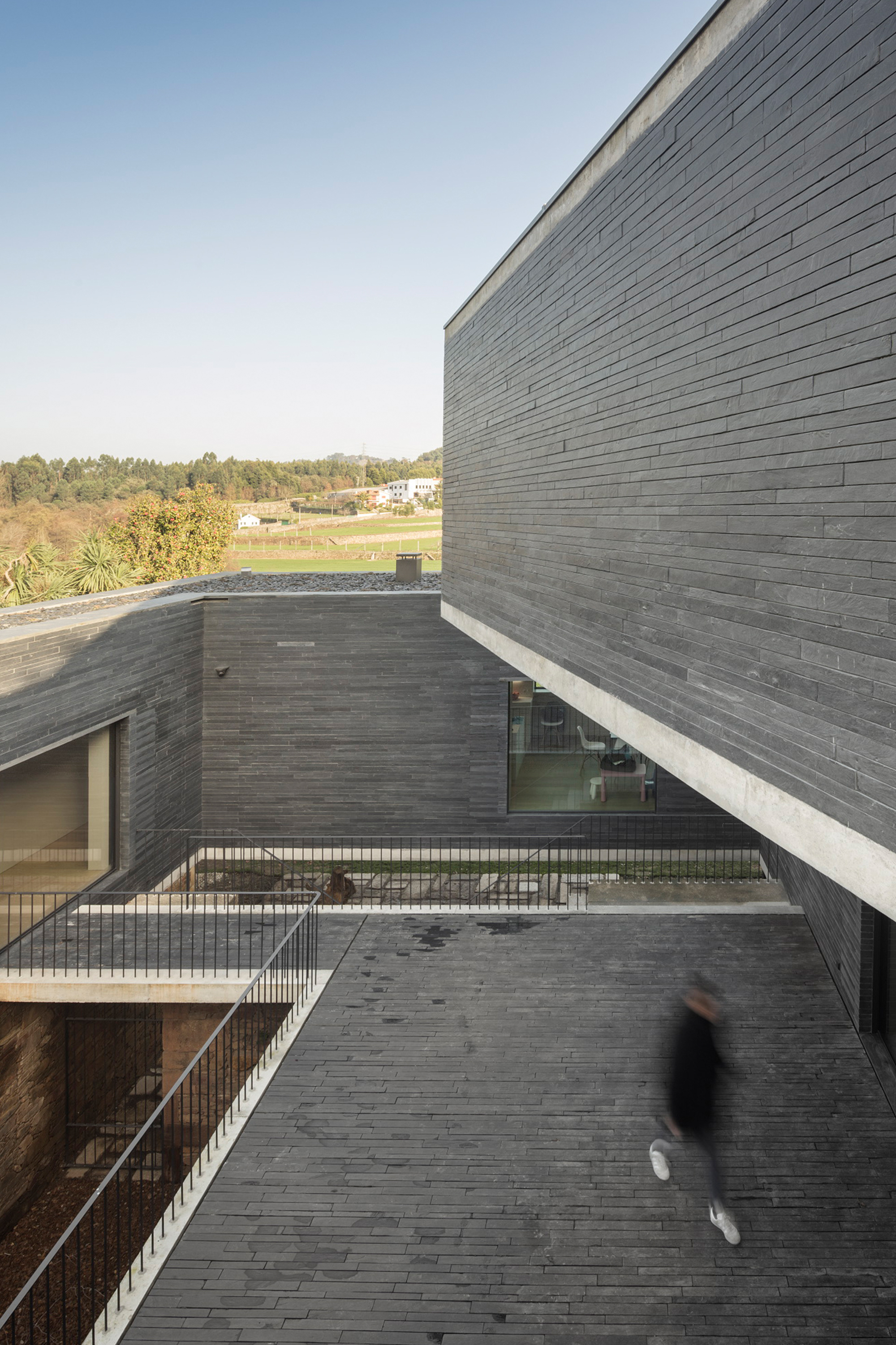 The new construction, (completely made or reinforced concrete) is a dark mass of slate sitting on the lower walls of the old house made of schist blocks against the old terraces of granite and schist.
