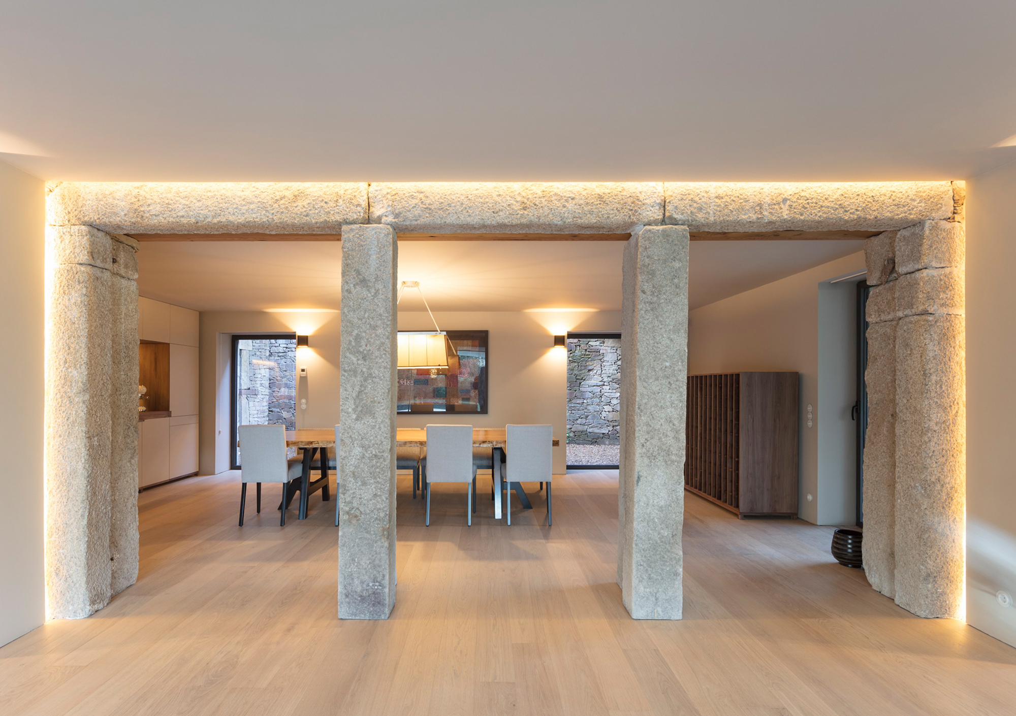 Floor 0 (level -2, under street level) was rehabilitated and expanded. It houses the social functions and patio support. To the north, the interior of this floor is ventilated and illuminated by a patio that used to be a cellar. The new co-exists with the old. Floor 1 (mezzanine) is organised around the larger patio (clipped by the floor 0 patio) and is used for the family’s daily life. To the north, the entrance to the covered parking, leads the inhabitants to the kitchen through a corridor. The rooms overlook the patio to the south. Floor 2, visible from the street, is used for relaxation. It partially overlaps the first-floor volume, it shelters the entrance space and the patio. It is divided into three bedrooms and respective toilets. The roofs are flat. The floor-1 roof, which is at street level, has an esplanade facing the horizon.