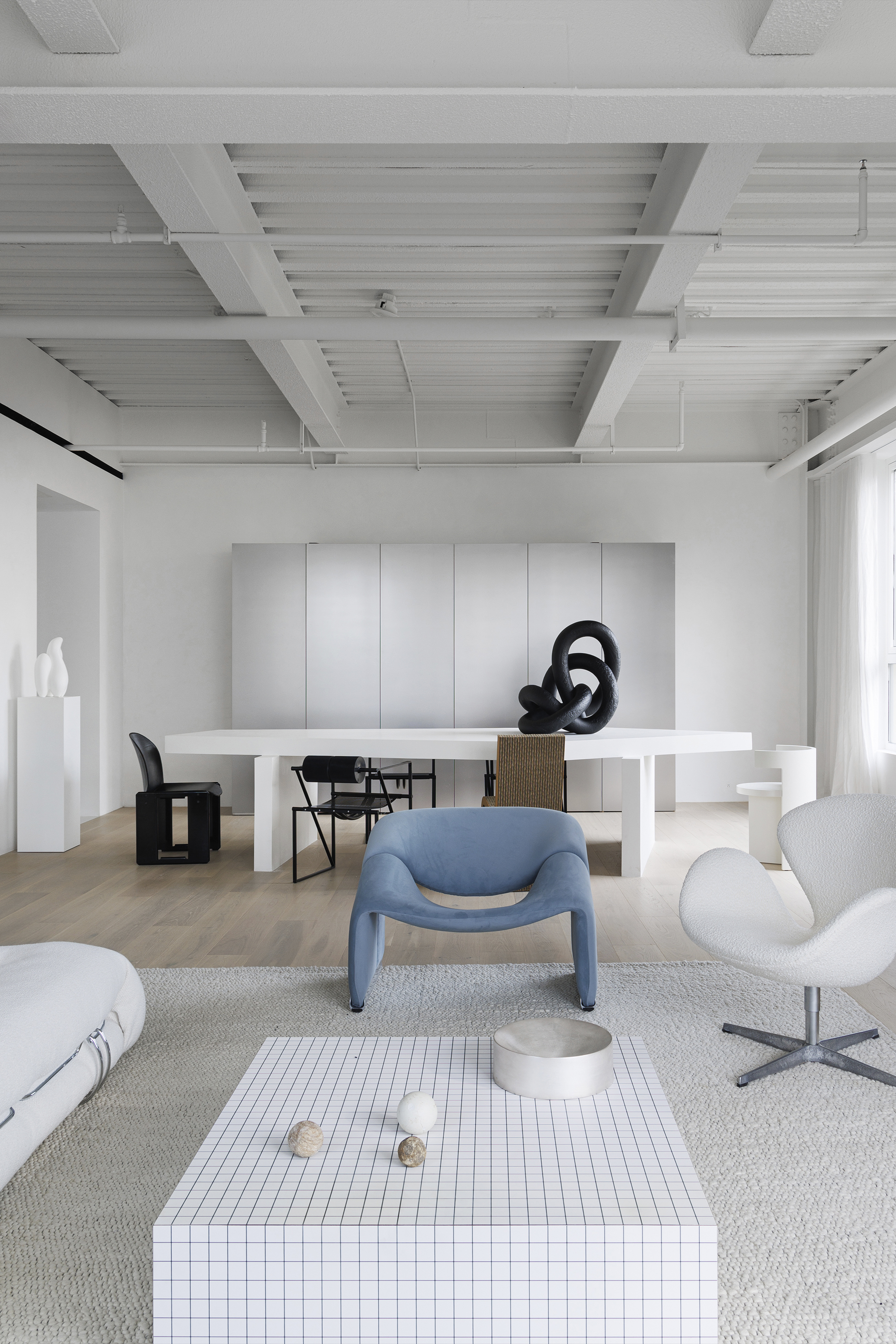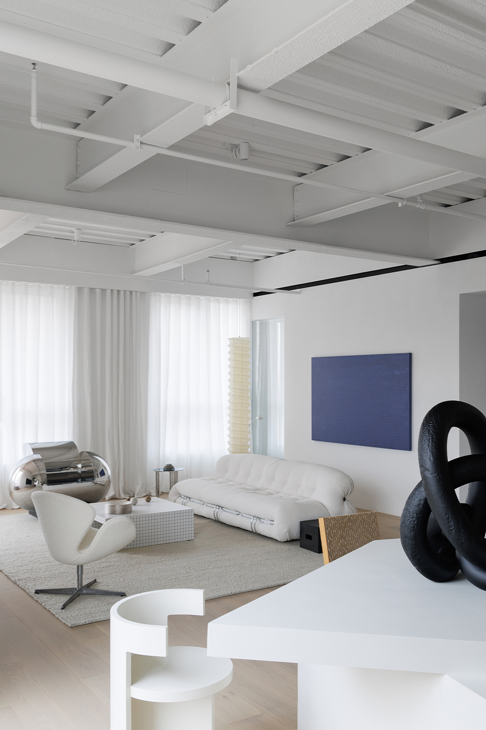 The sunniest areas are reserved for the parlor area, allowing natural light to be the most dynamic part of the space. Filtering out all the complicated colors and retaining only the purity of white makes this space seem to be outside of time, quiet and constant, unmoved by the years. Pure white art paint combined with light wood flooring, clean and sharp hard furnishings as if a blank canvas, waiting for art and life to fill ... deliberately retained the original ceiling structure, hoping to leave some unadorned industrial atmosphere. Most of the soft furnishings are classic furniture and artworks designed by master designers. Each piece is personally selected by the main manager to inject an artistic soul into the space. The sofa area is dominated by white furniture, with local touches of blue, bringing a sense of serenity and depth to the space.