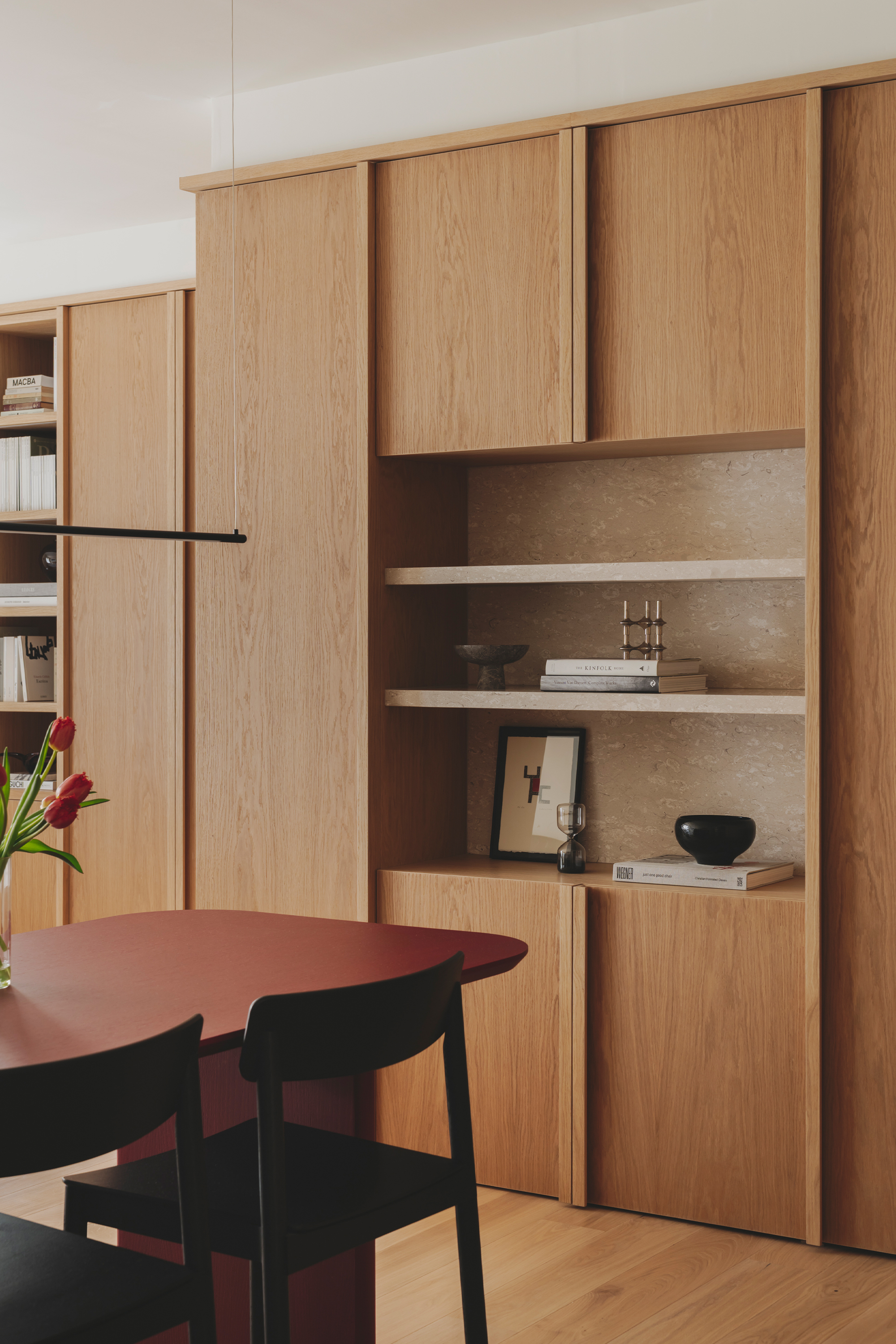 Their shared love for the color red became a thread throughout the design, introduced in carefully measured doses. “Red is a color we both love, so we made sure to incorporate it in just the right places: in the custom-made dining table and the interior of the walk-in closet, which is designed like a little surprise,” the clients explain.