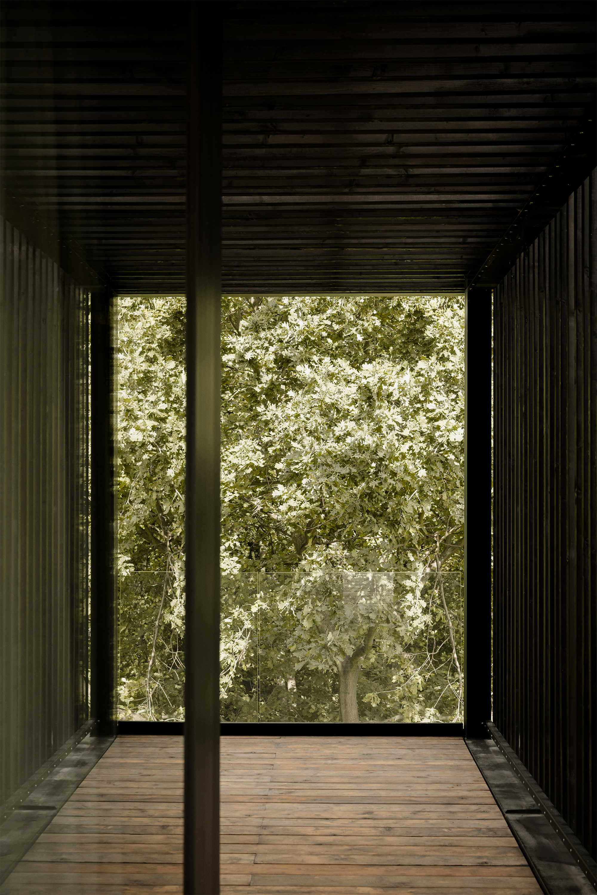The attic serves as the private zone, with a mezzanine overlooking the two-level living room, three children's rooms with a shared bathroom, and the master area with bedroom, walk-in closet, and bathroom. The underground level, hidden from the garden side by the natural slope, functions as a recreation and relaxation zone. It includes a home cinema, workspace, bar, and a spa with jacuzzi and glass-walled sauna. From this level there is a panoramic view of a small valley with wetlands and old oak trees.